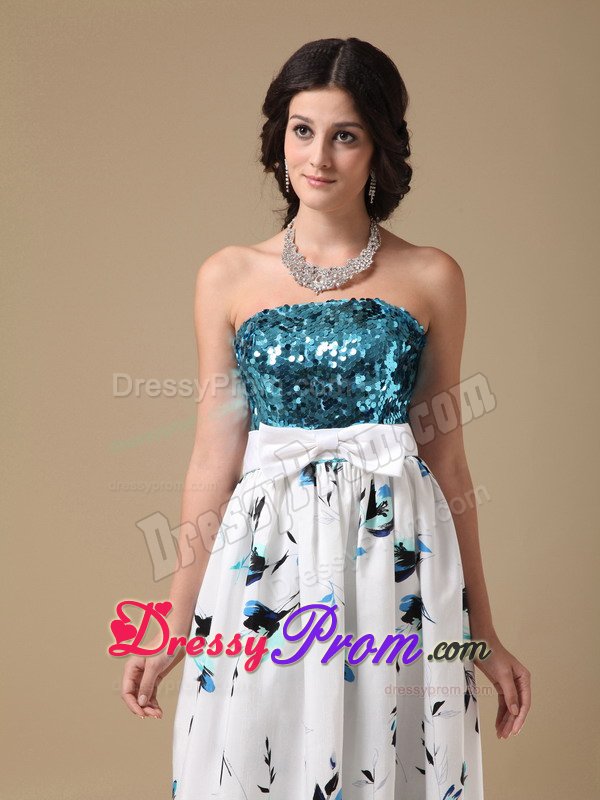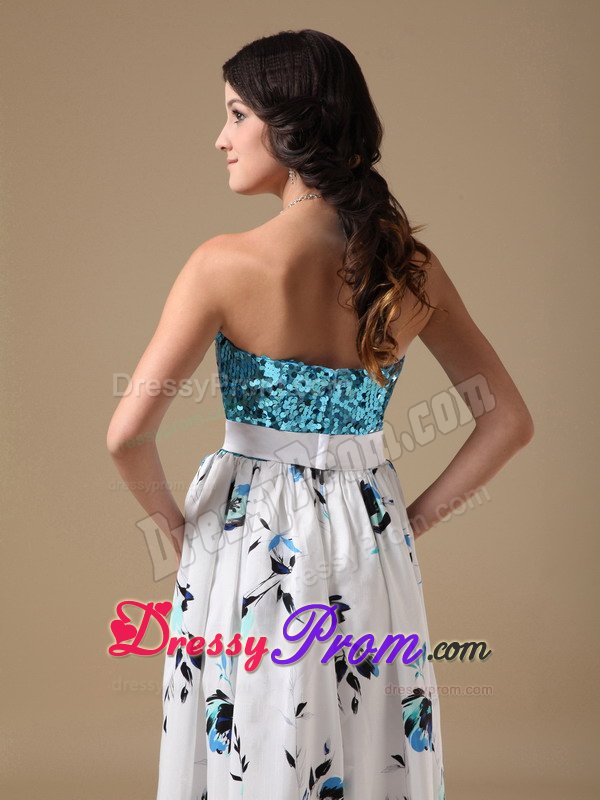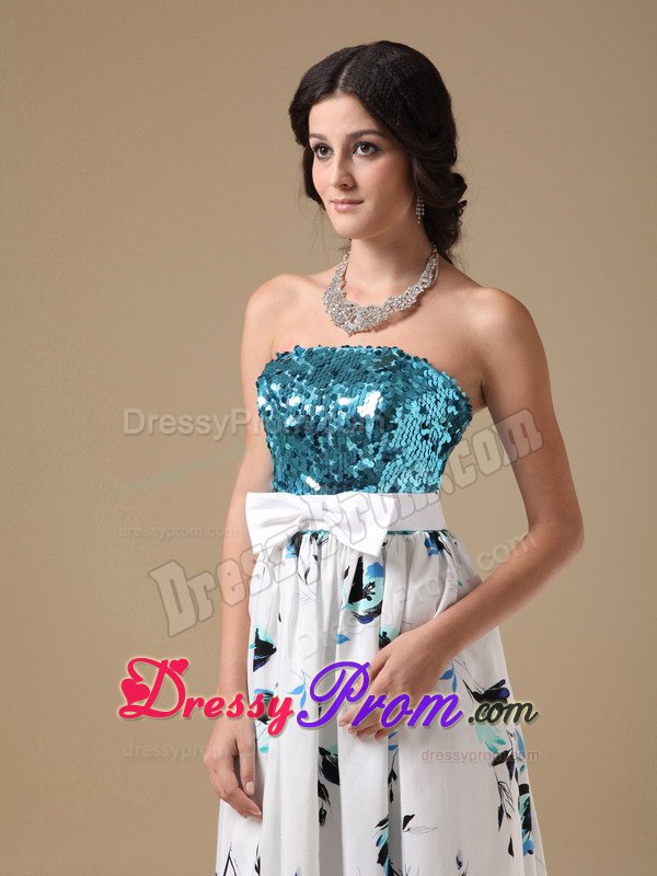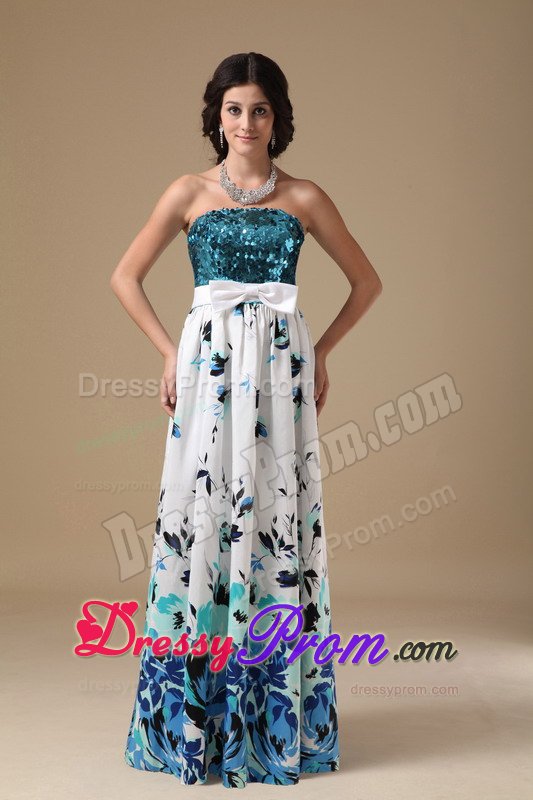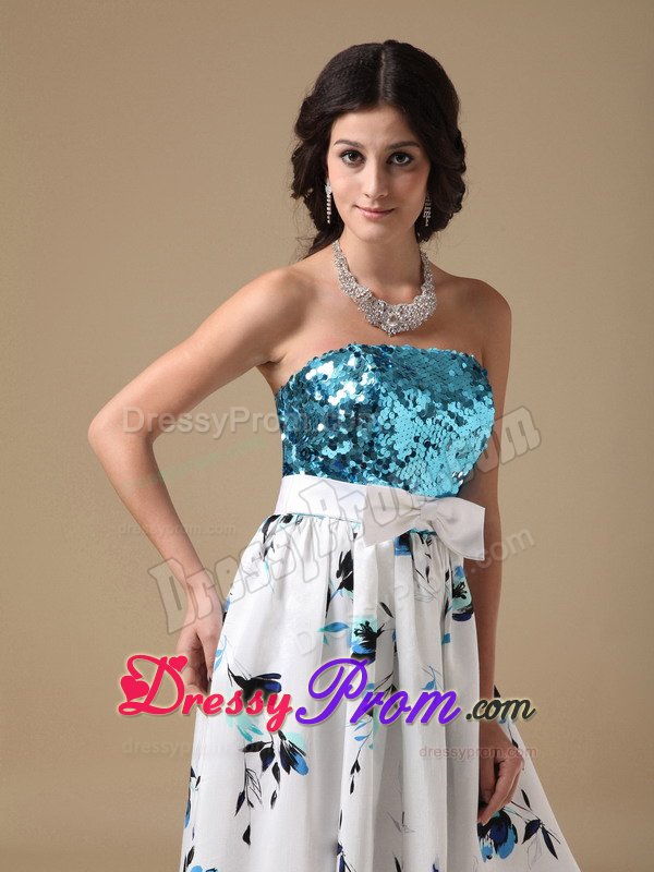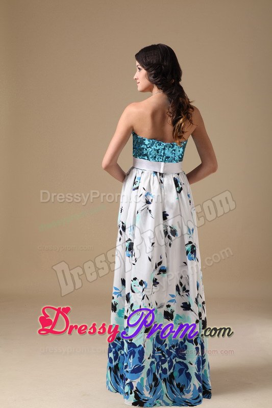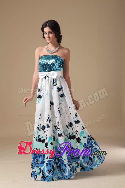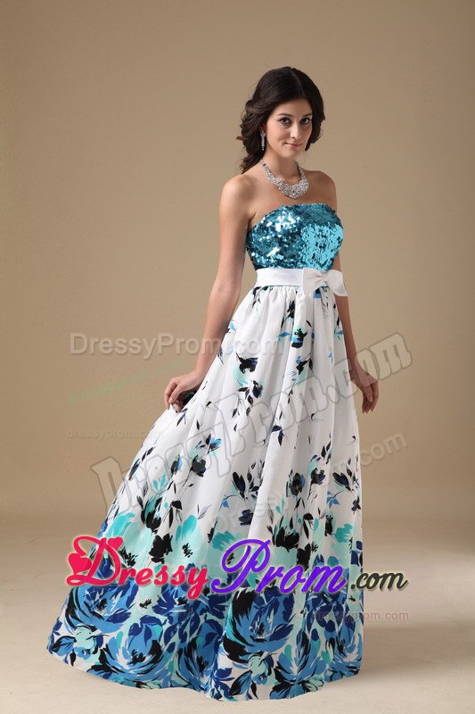 This simple, yet gorgeous dress is a great choice for simple gatherings or dressy affairs. It features a sequined bodice with a sweetheart neckline and the lovely wide sash attached with a bow. The layers have ruffled hems and the bottom of the skirt accented with inflorescence prints which really add its fullness and lots of interest as well. Moreover, a hidden zip closure in the back secures the dress in place.