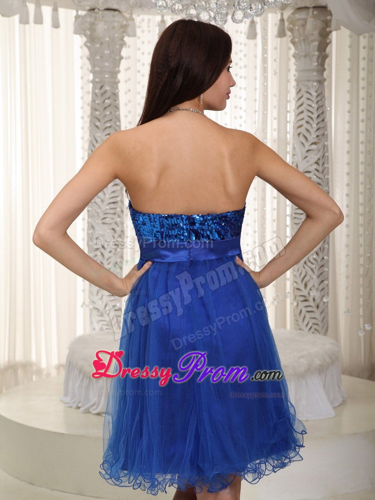 This blue gown features strapless bodice that is encrusted with sequince on the front and the back and a lovely bow on the waist. Soft chiffon creates an interesting handkerchief hem. The skites features pleats. A bit retro and a lot gorgeous! You will look like a queen in the pretty dress.