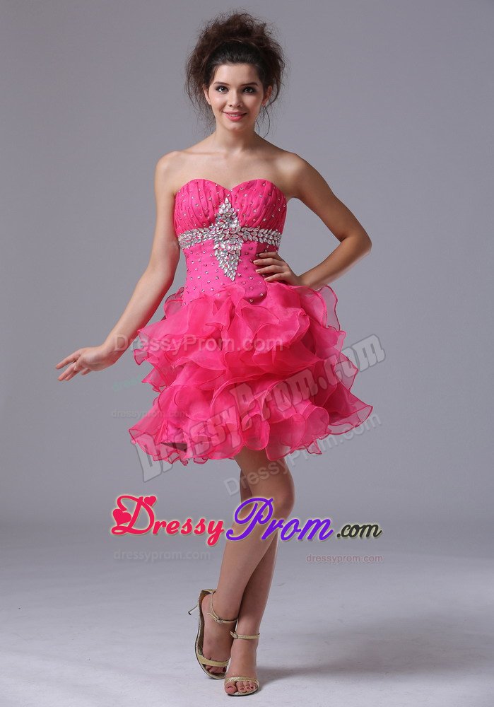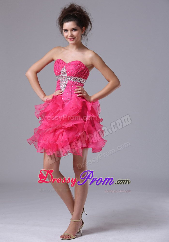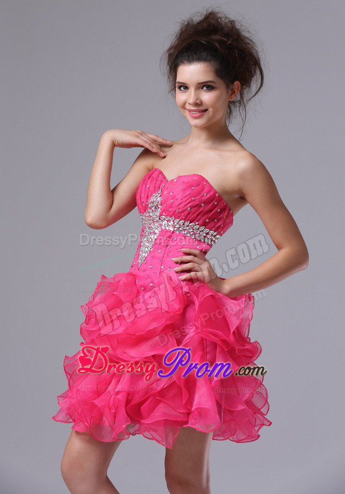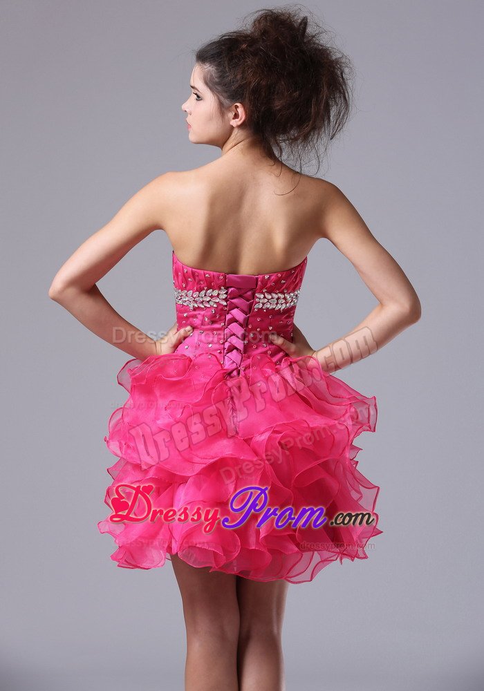 Do you want to experience the feeling of being the spotlight? This pink prom dress will make your dream come ture. It features a strapless bodice with a sweetheart neckline. The ruched bodice is highlighted with the scattered beadings. The exqisite beadwork in the bust area contours your curve perfectly. The other point is the organza ruffled mini-skirt. The lace up in the back of the dress secures it in place and makes for easy off and on.A stunning dress you can't miss.