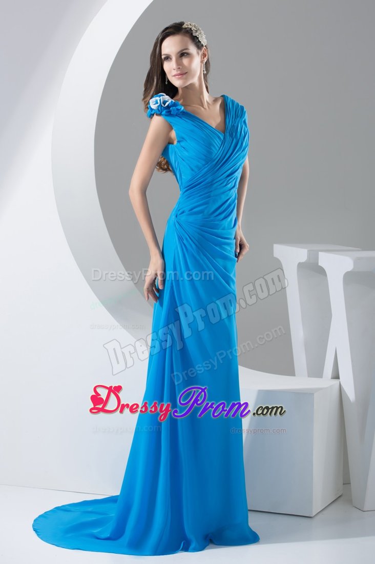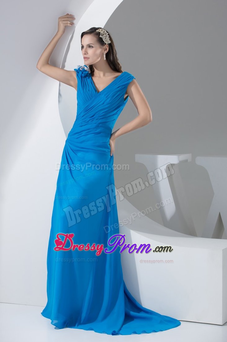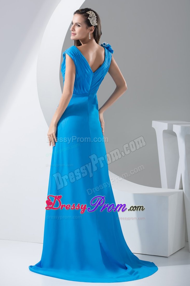This is a beautiful mother dress 2013. It features v-neckline and a-line silhouette with illusion sleeves. Made of chiffon and elastic silk-like satin materials in blue color. Pleated back with hidden zipper closure. Long skirt with sweep train.