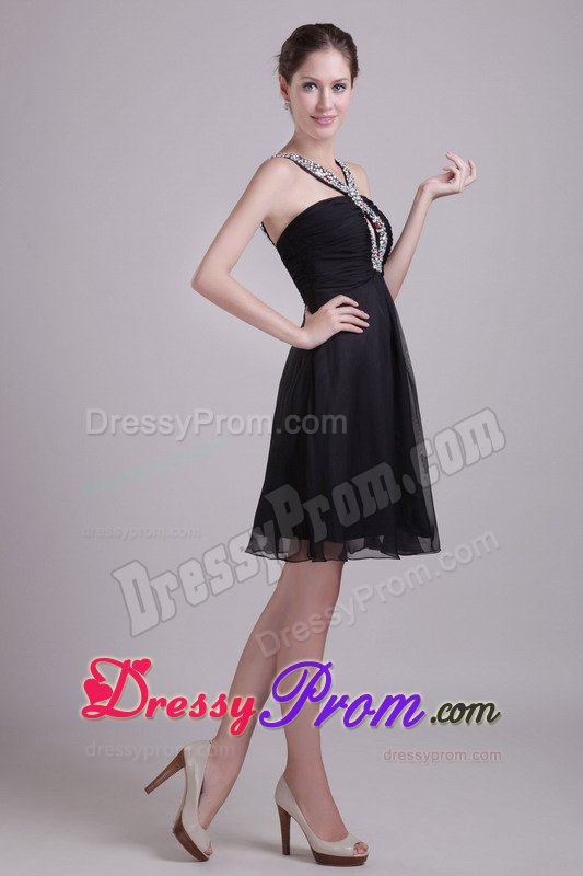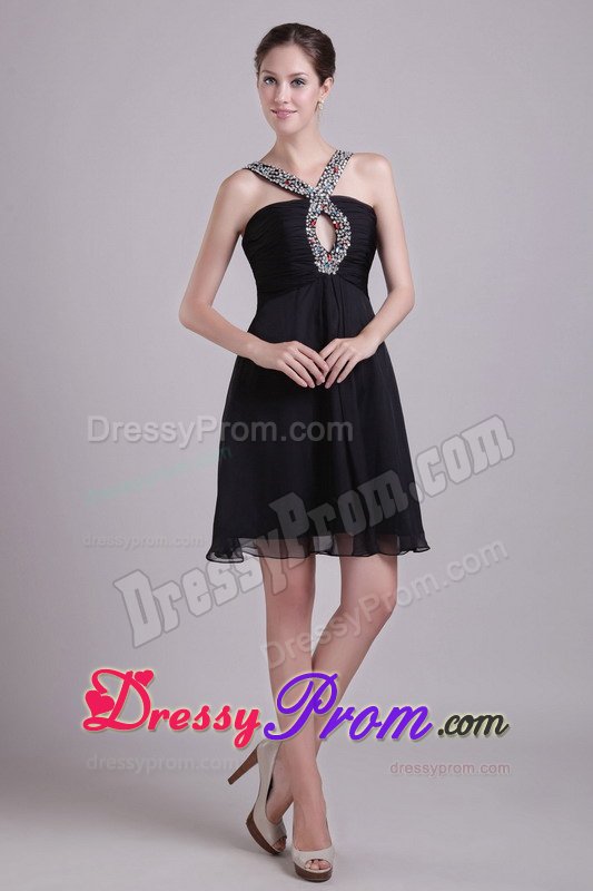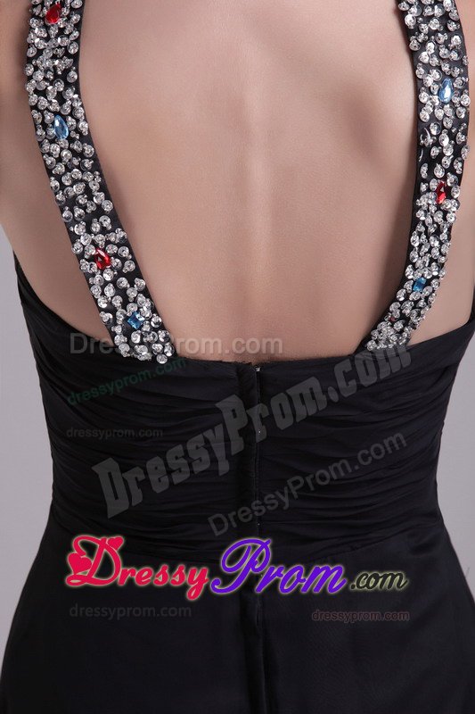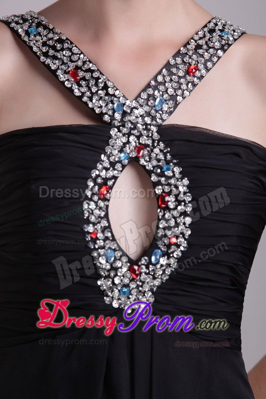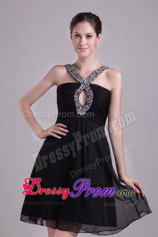Flattering and Stunning!This gown features a keyhole halter neckline that is encrusted with colorful crystals and sequins on the front and back.The asymmetrically ruched bodice contours your figure.The black short ball gown is very gorgeous.The zipper us back makes the dress perfect.