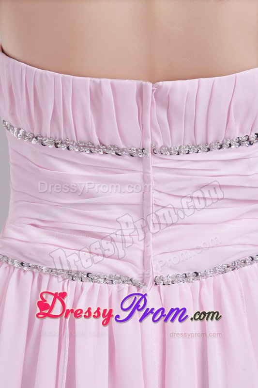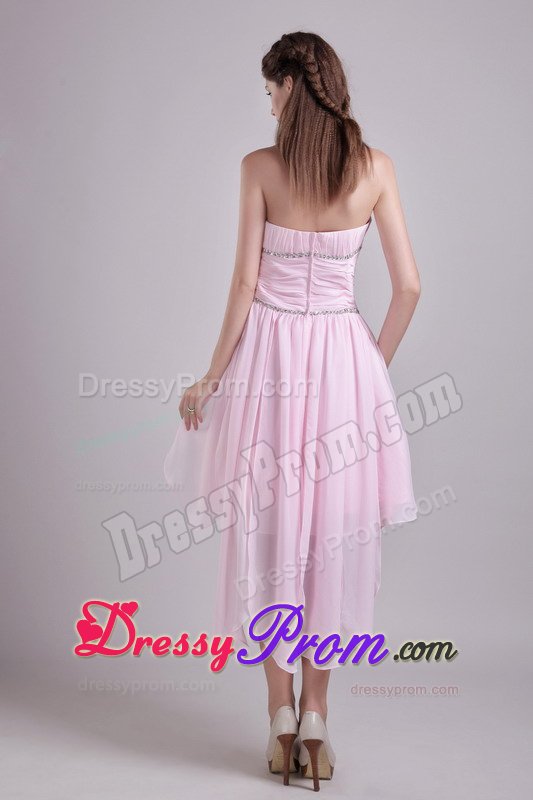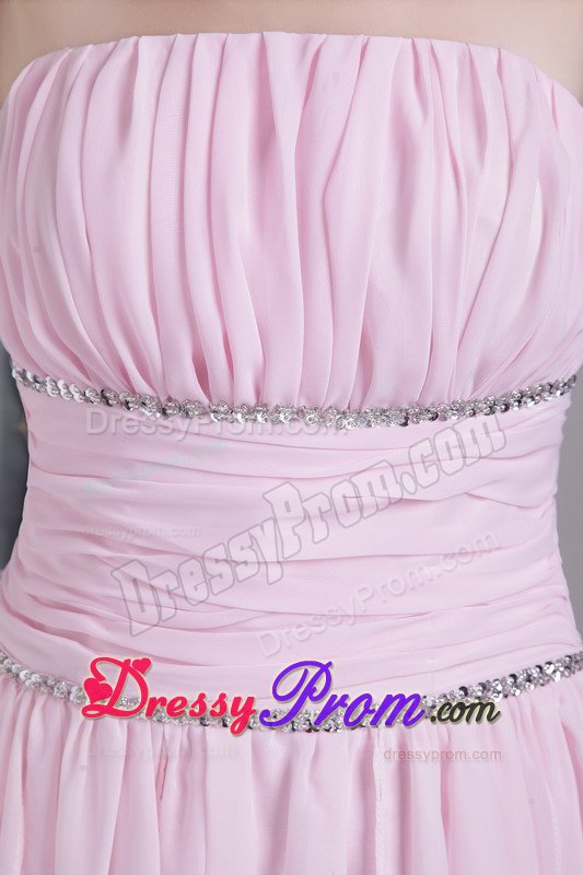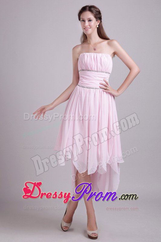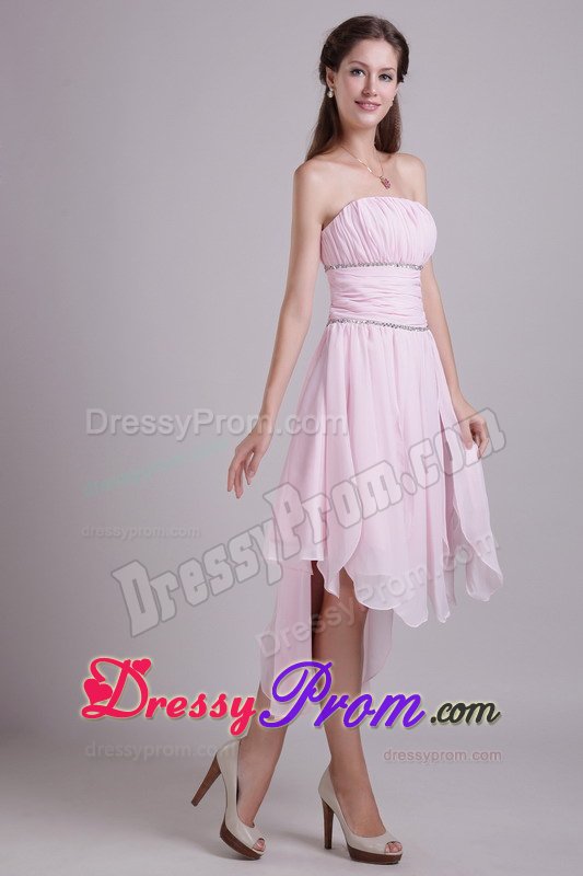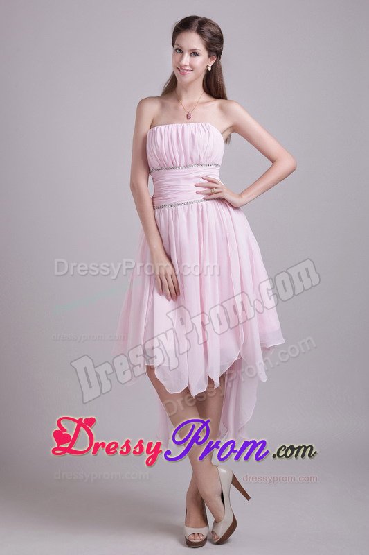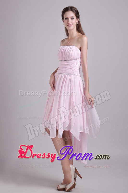 This Strapless neckline high-low pink prom dress is featured with the verticl pleated bodiced and the ruched waist line coming up sideways. The elegant skirt flows out gentelly. And the bodice is beautifully decorated with linear beading, which makes a amazing dress.