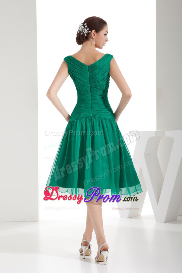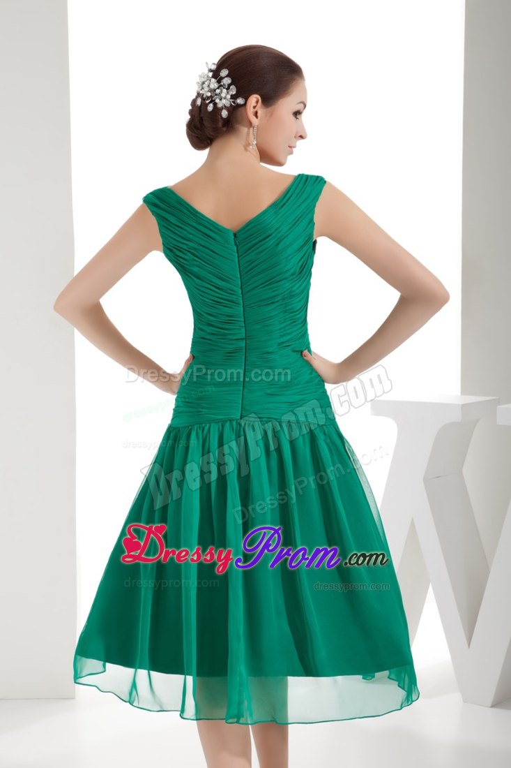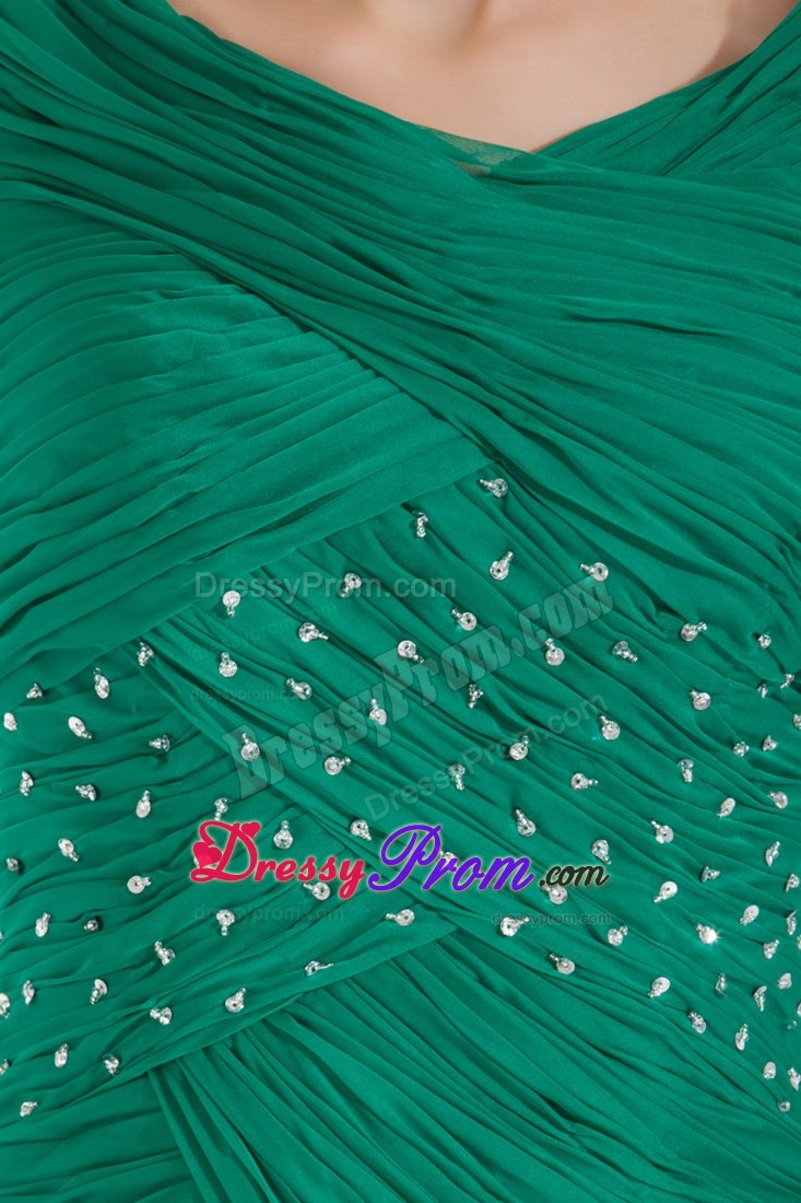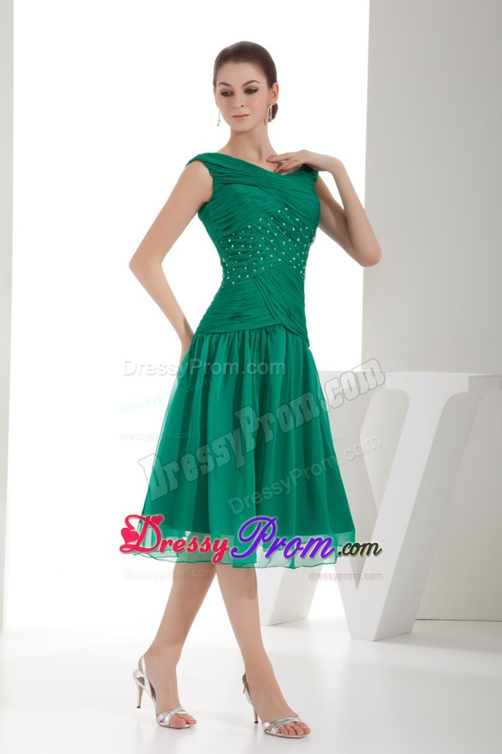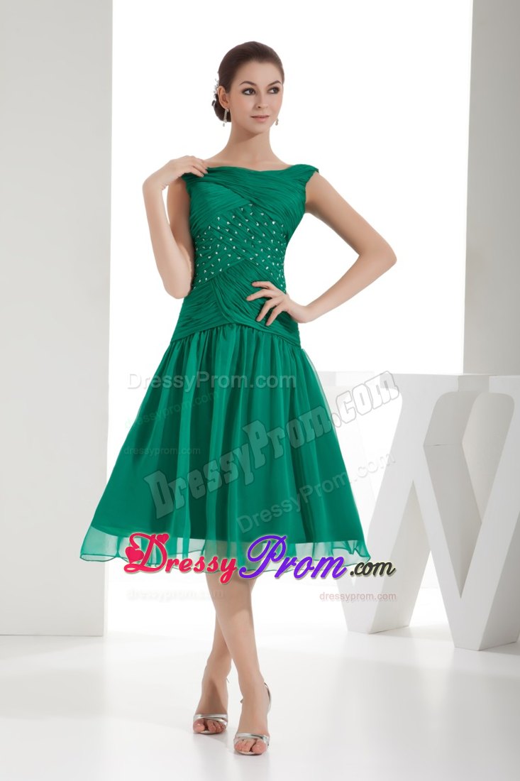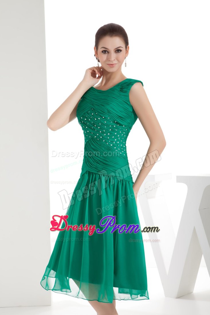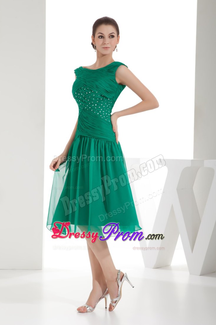 There is something about a chiffon dress that says romance. It is such a timeless fabric that makes anything you create from it special. This lovely dress is an example of that. It features a scoop neckline with intricate ruched and beaded bodice and knee-length skirt. A zip closure in the back secures the dress in place and makes for easy off and on.