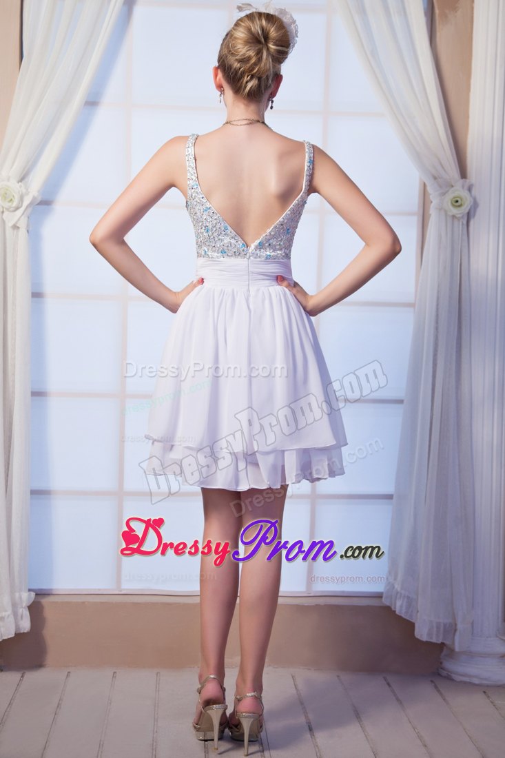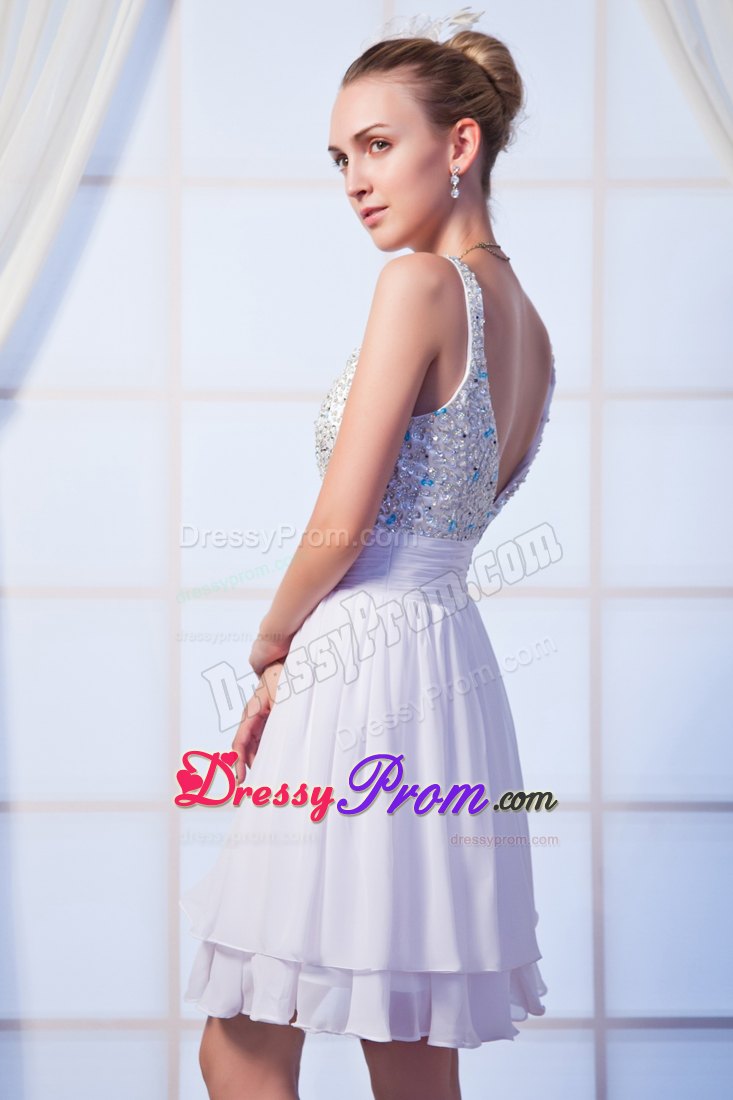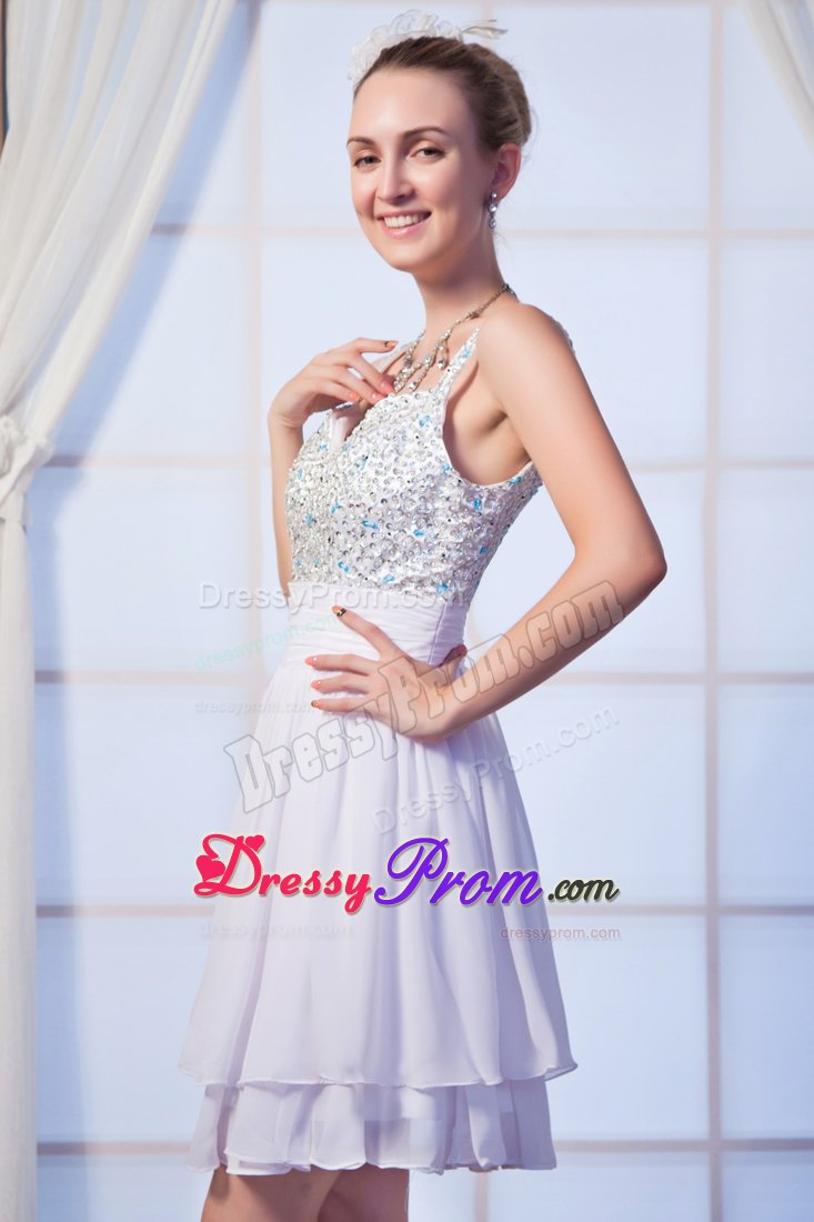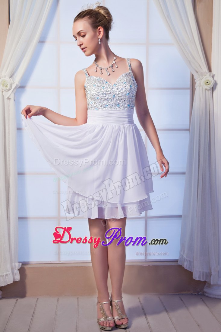 This simply-sweet cocktail dress is a beautiful choice for women of all sizes who are attending parties, dances, and other celebrations. The layered skirt is ruffled at the base and topped with a wide waist belt and sweetheart-neckline bodice. The eye-catching features of this dress are the sparkling bodice and thin shoulder straps, which are entirely adorned with both clear and colored bead embellishments.