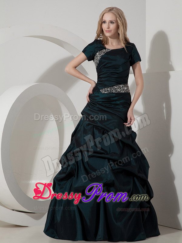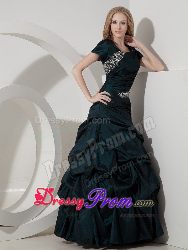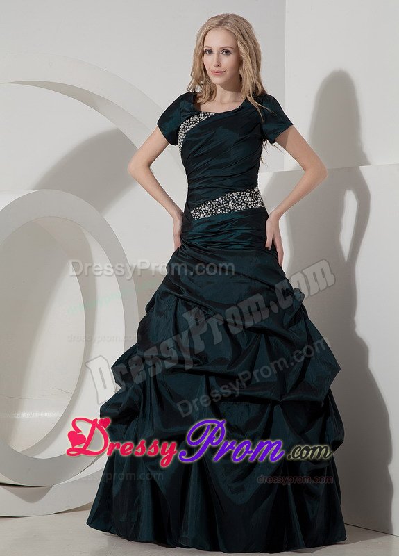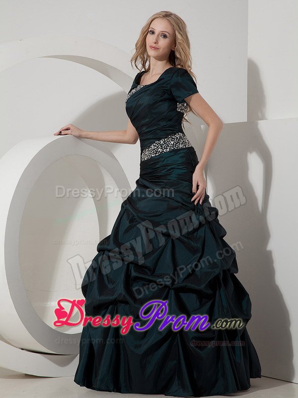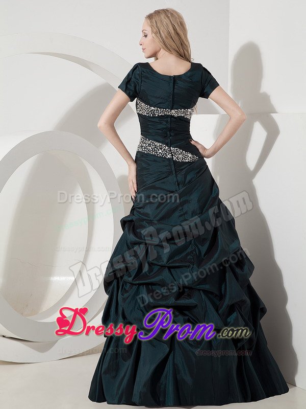 Elegant and fashionable. This perfect designed dress features a scoop neckline with short sleeves. Highly shimmering beaded embellishments are enruseted beside the bust and the waist extened to the back. The layers of pick ups on the skirt adds more interests. A hidded zipper up makes the dress easy off and on.