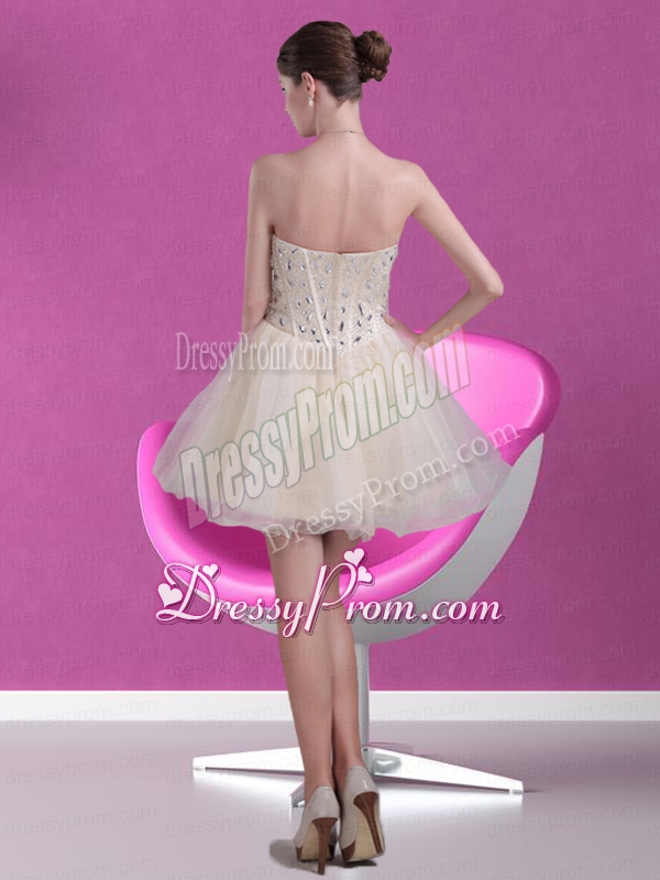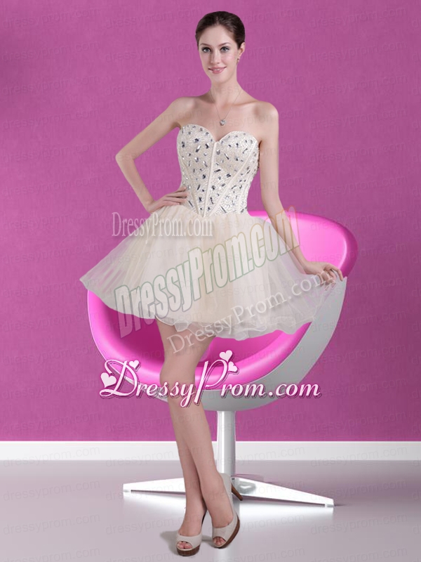 Sexy and sophisticated.The sweetheart neckline bodice accented by the asymmetrically all-over sequin and crystals details flatters most figures.The champagne short charming prom dress contours your curve.The tulle makes the dress more puffy.