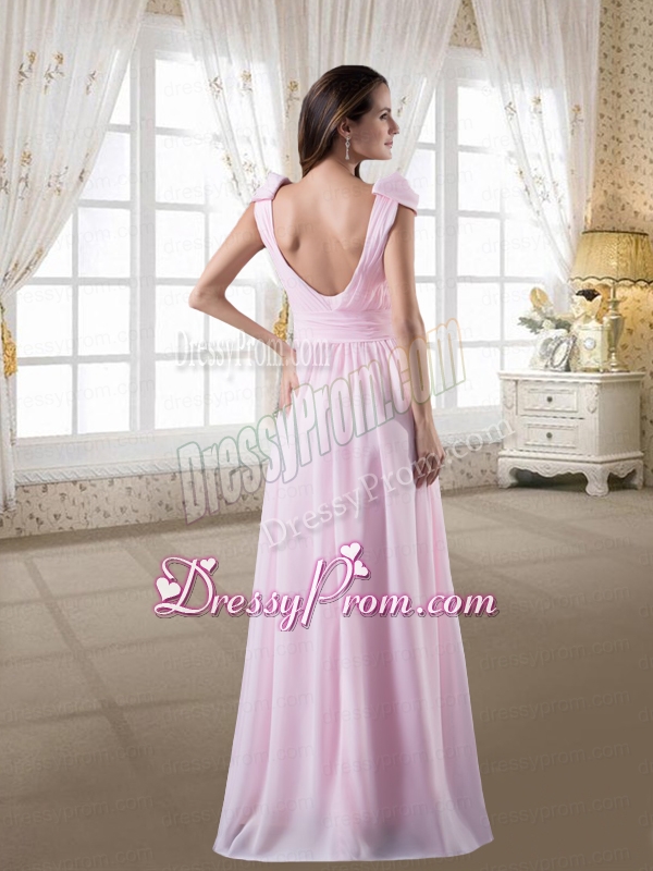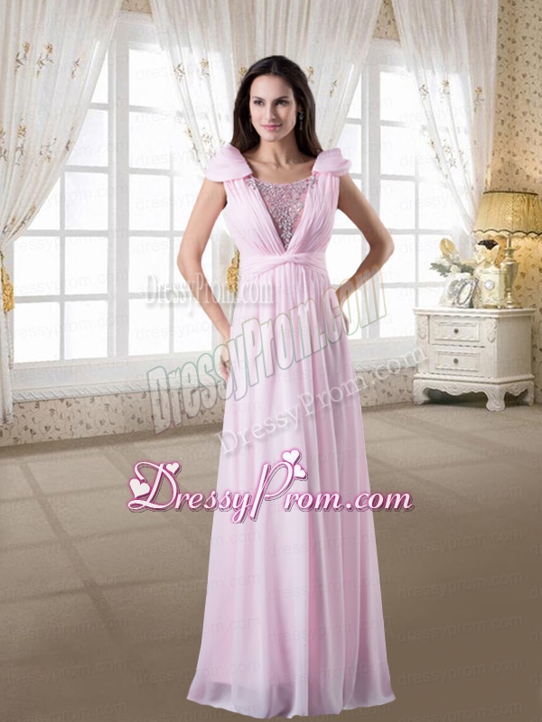 This amazing prom gown made of chffion with a V cut neckline and cap sleeves. The see-through fabric covers the neckline is filled with sequins with rhinestone accents and the natural waist accented with a beautiful knot. The A-line skirt is embellished with sequins in a beautiful design and this dress is available in pink or black color choices.