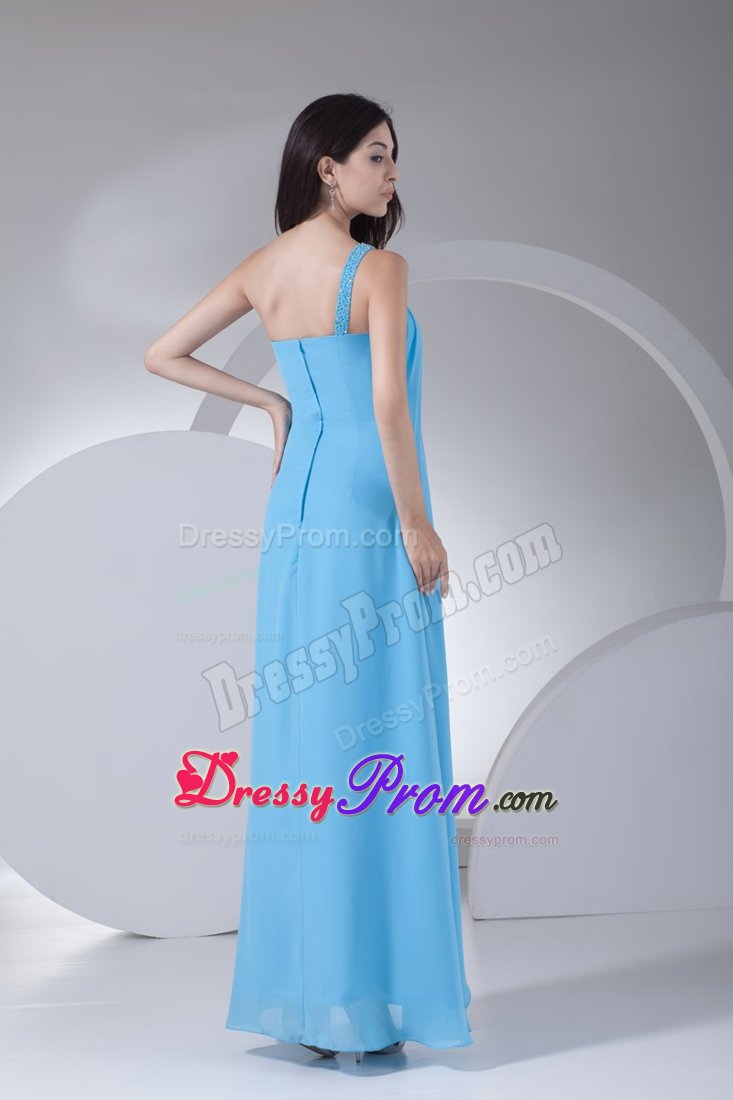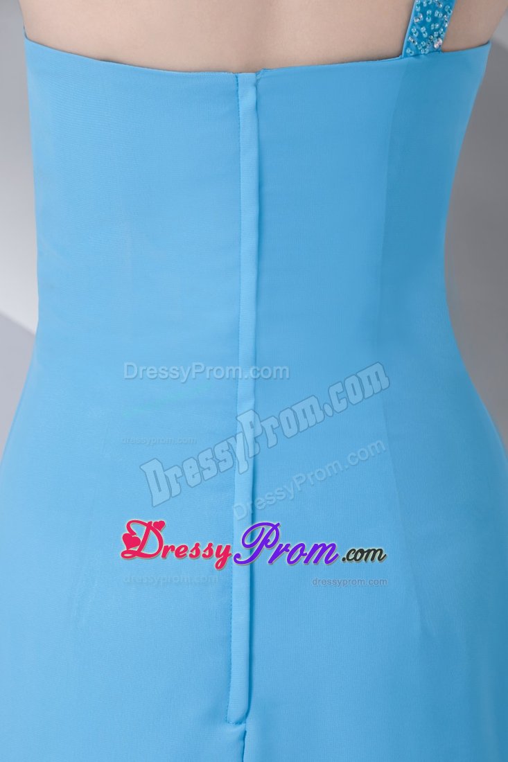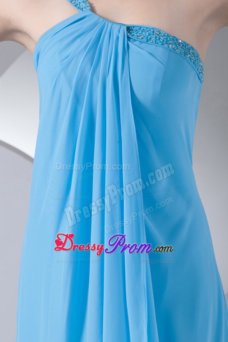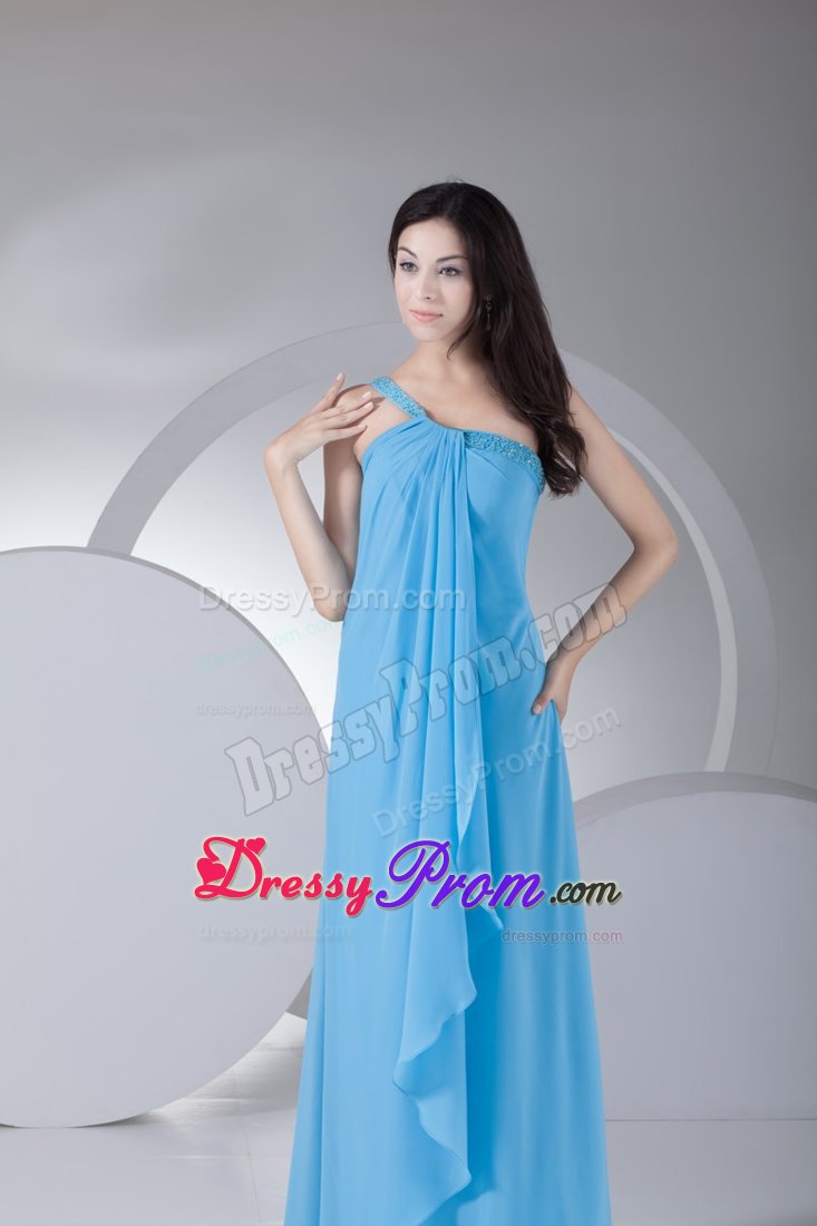 The beautiful prom dress is made of chiffon with full lining. It is has an elegant look and of floor length. Delicate beading is attached to the one shoulder strap and the neckline. A piece of chiffon fabric drapes from middle of the neckline. Back is closed by hidden zipper.