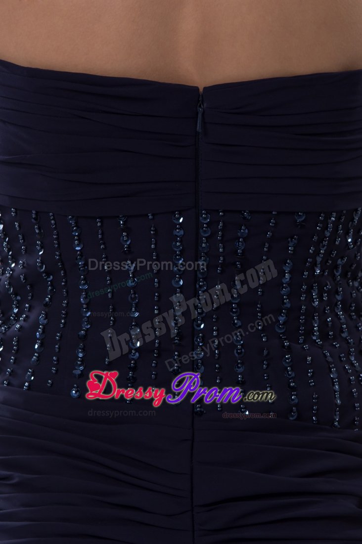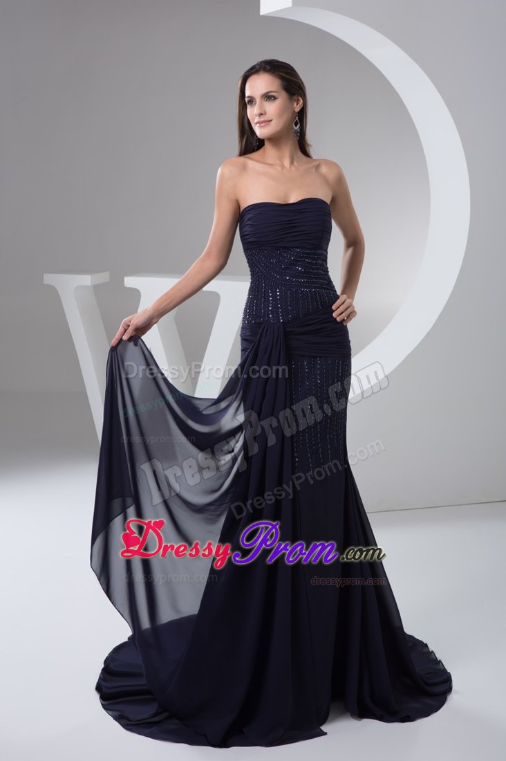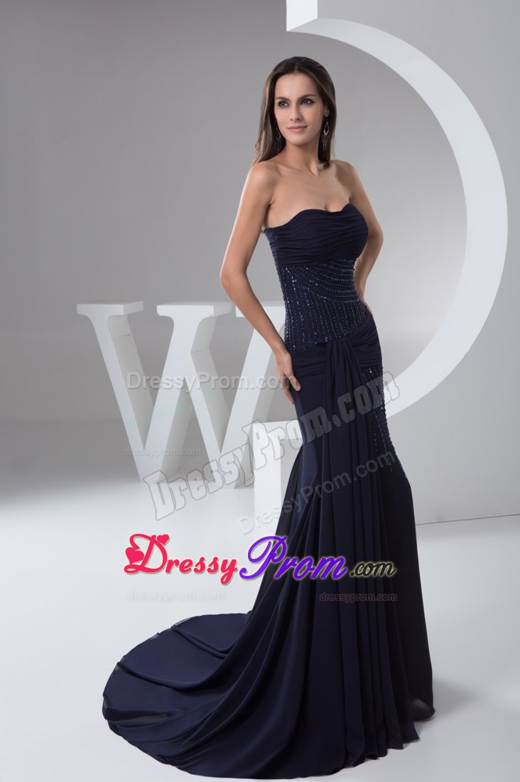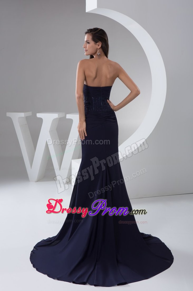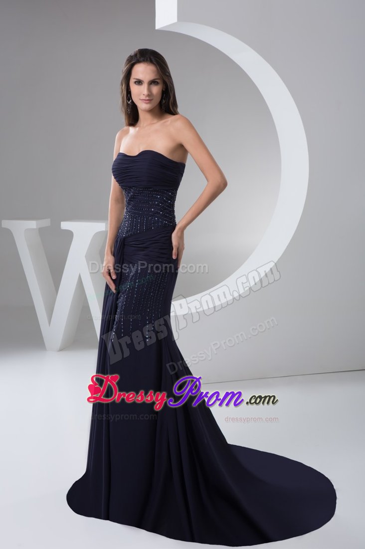 This prom dress has a sweetheart cut neckline. The ruched bodice is accented with beading. The dress has an A-line skirt and is made of chiffon fabric. There are unique back cutouts and beading in the center. The dress has a long chaple train and closure with a zipper up back!