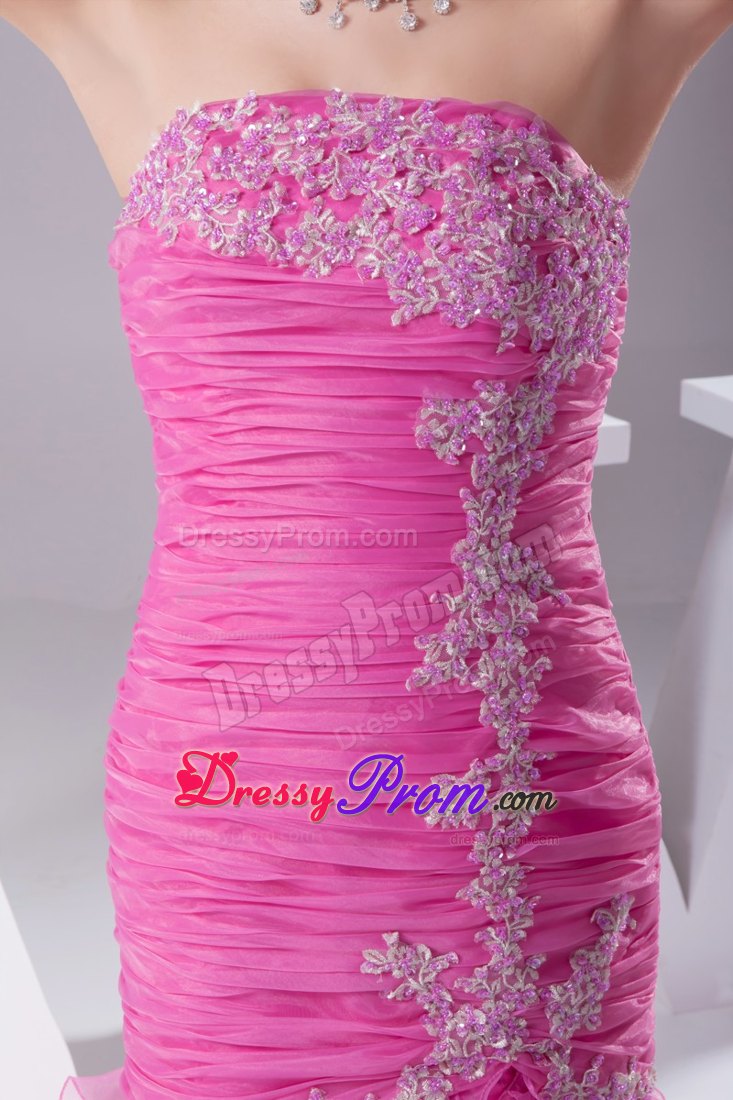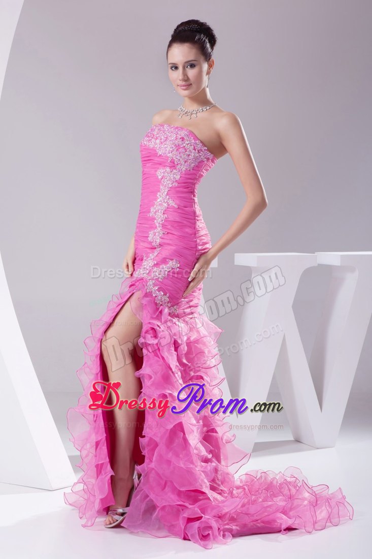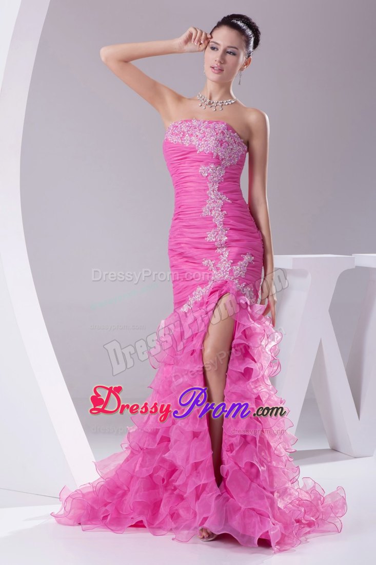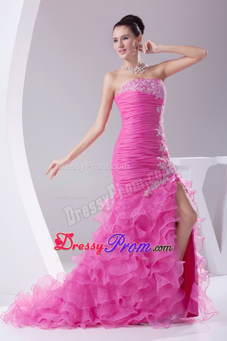 Do you want to surprise the crowd at your next event? This amazing sexy pink evening gown has a glamorous celebrity style with dramatic touches including dazzling beadwork and appliques on the bodice. It features its strapless neckline and mermaid train style. What's more, mermaid skirt together with the a sexy front slit endow attraction to this surprising prom gown.