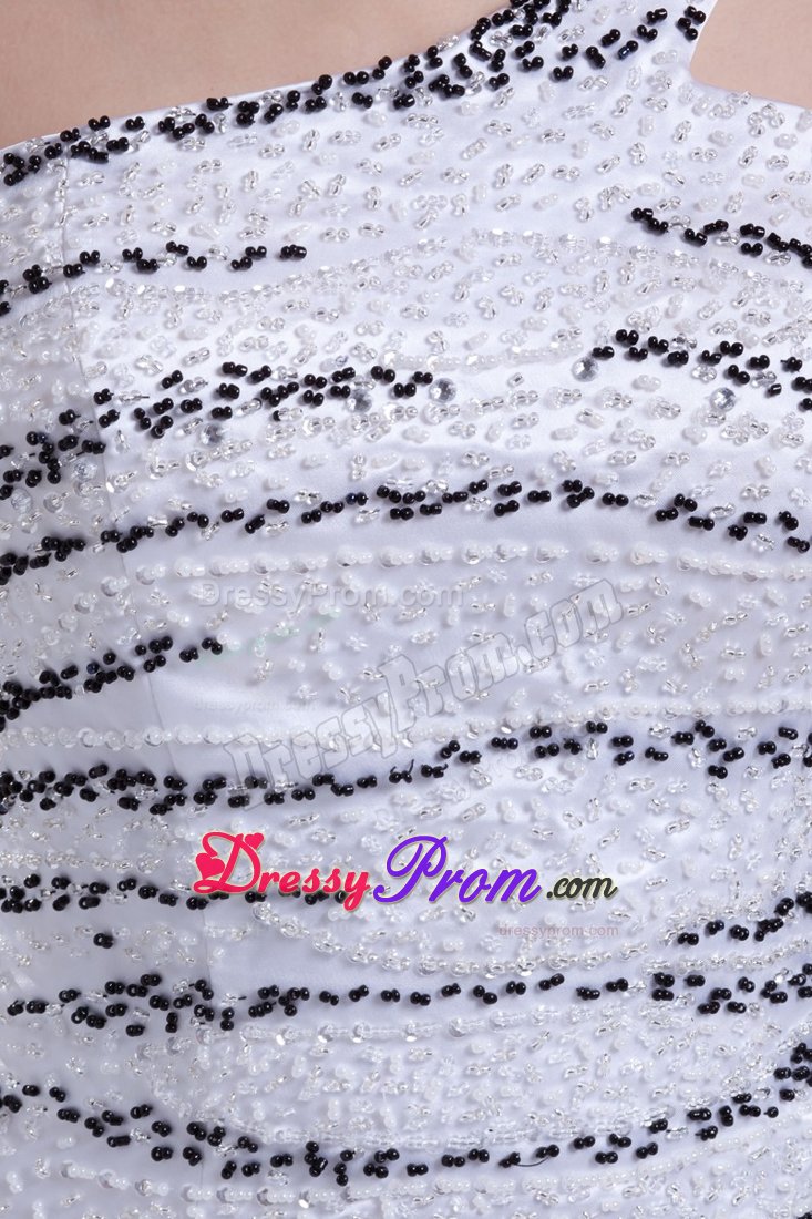 This mini cocktail/homecoming Prom Party dress features its one-shoulder neckline and column silhouette. Black and White beading decoration there add the dress itself much uniqueness. Easy fitting from the zipper up back. This is the dress for party queen.