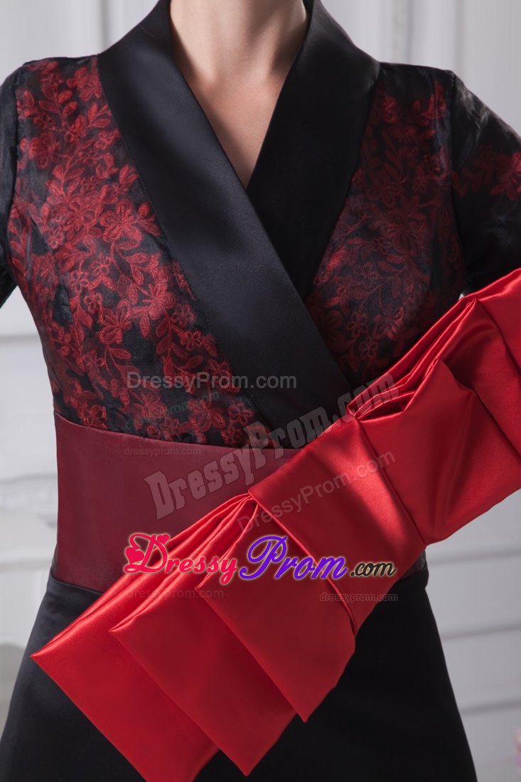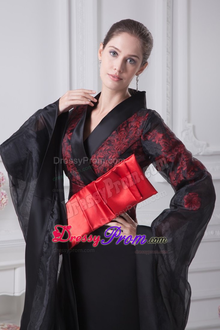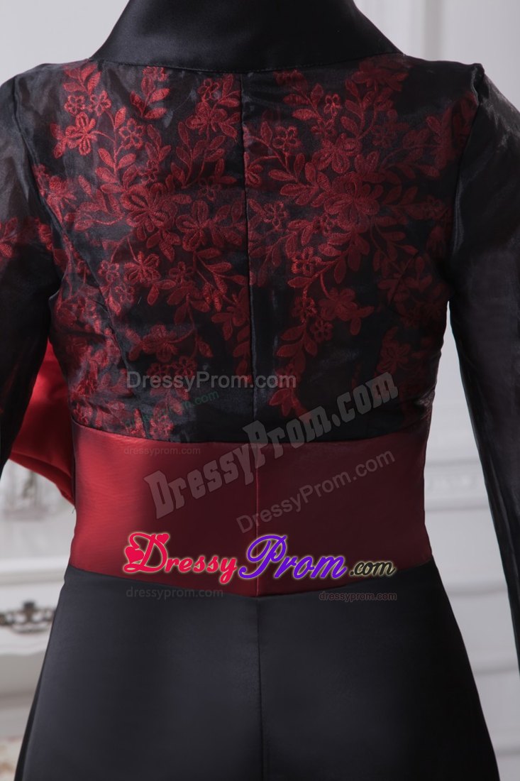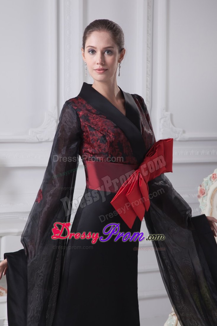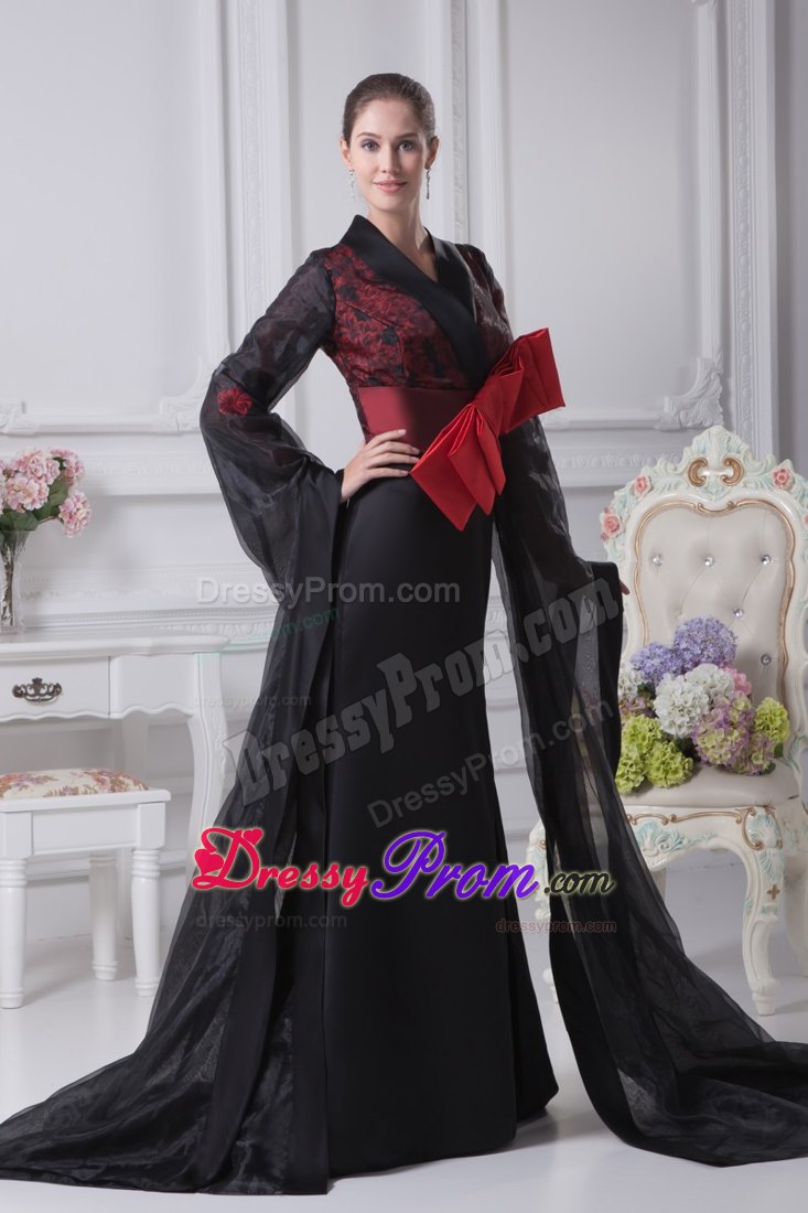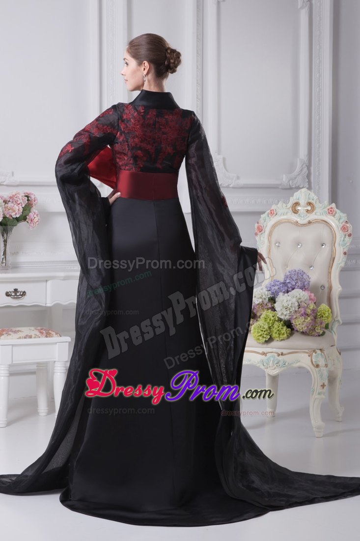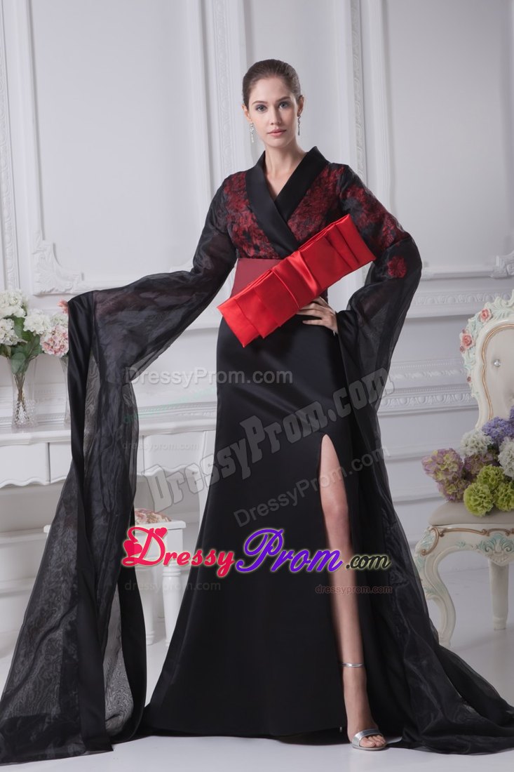 This black prom dress is full of mystery that attracts others ?ttention when you go out for the party.The fitted bodice is accented with nice lace and a big bowknot.The see through long sleeves and high slit make the dress more sexy.The skirt cascade to the floor create a brush train add grace for you.