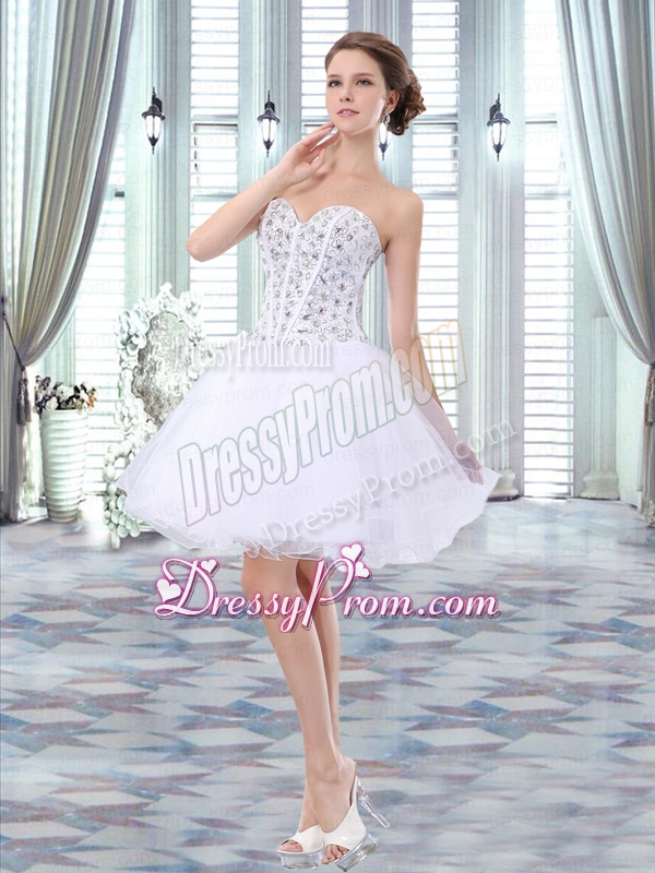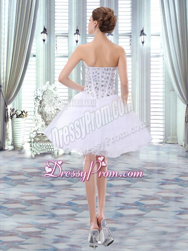 This dress will make you the talk of the big day! Fashionable strapless sweetheart neckline with sparkling beading accents on the corset bodice to make the dress stunning. Three white bands start from bust down to the middle of the belly add more cute for you! The mini-skirt is unique shaped by layers of tulle that make the dress puffy. Sweet and sassy!