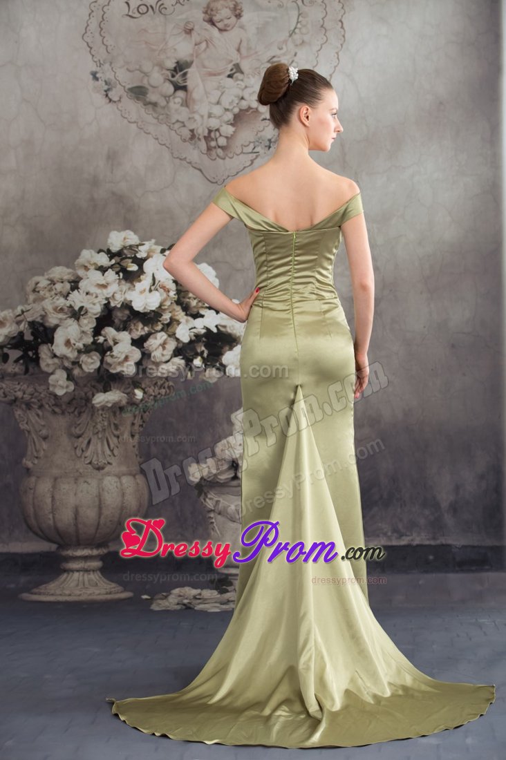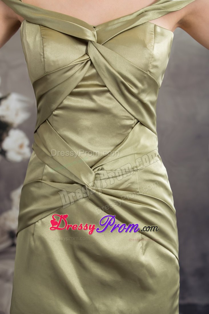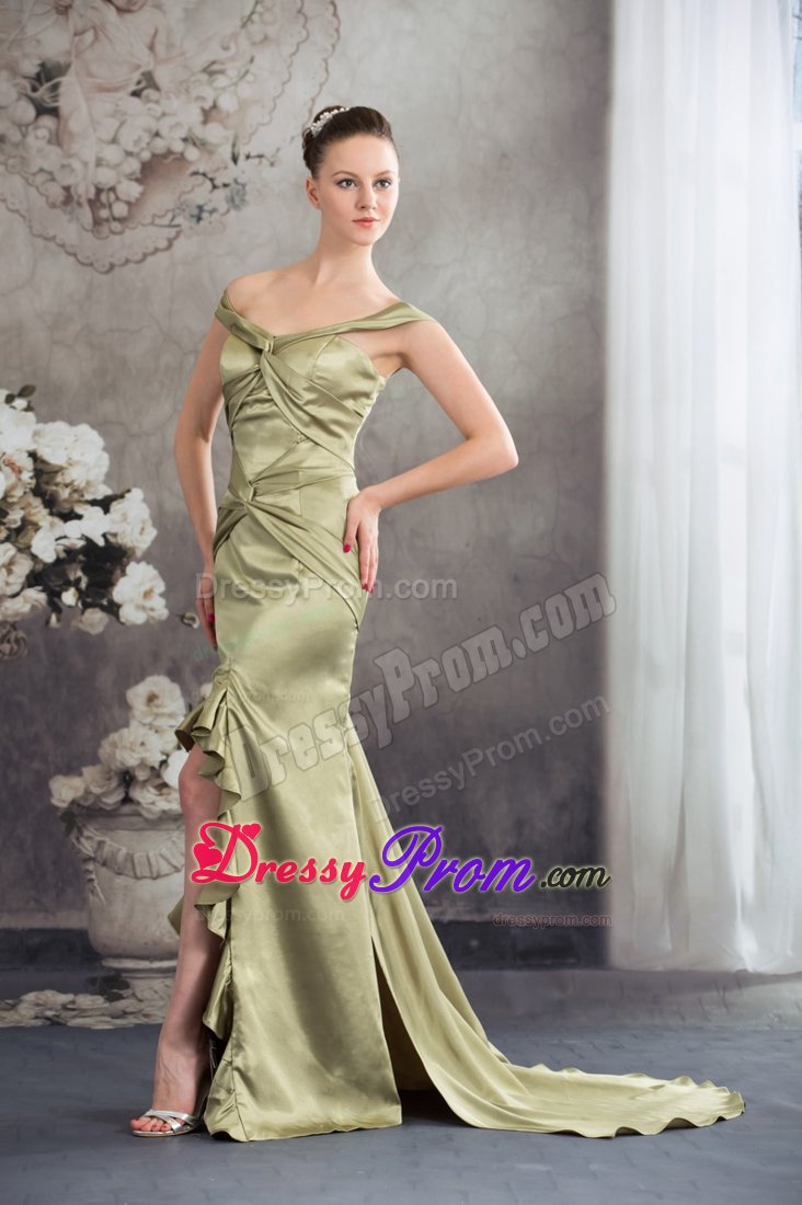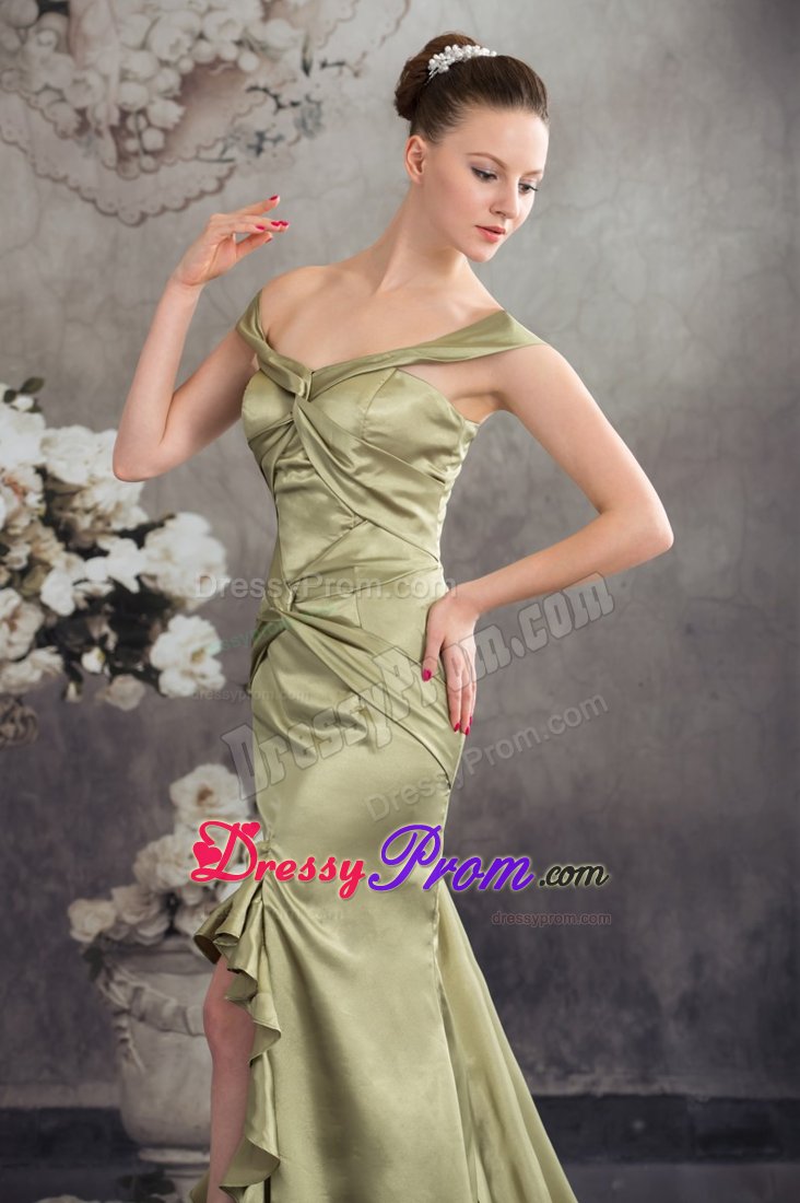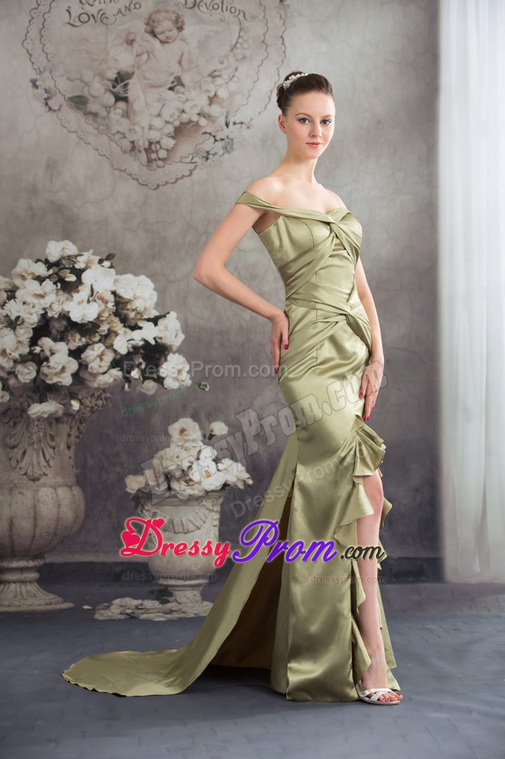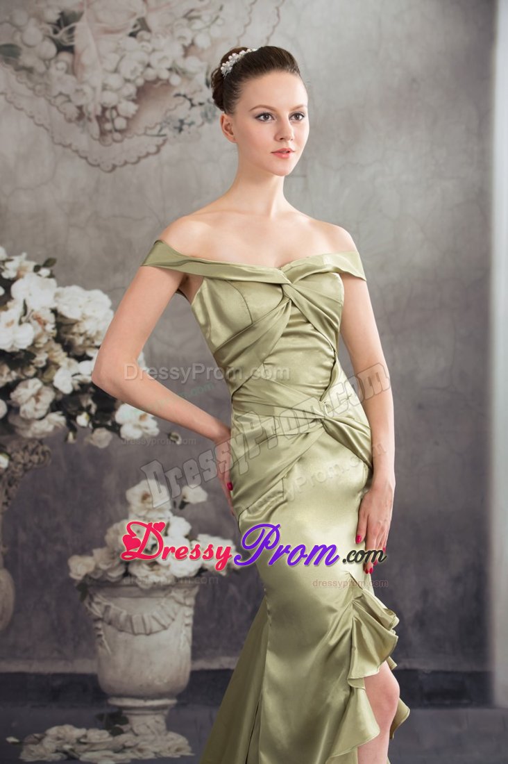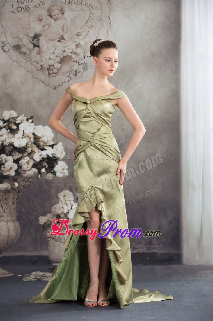 The dress is an elegant off the shoulder prom dress of silky taffeta that features big knots over the bodice. Other stunning features of this dress include figure flattering high-low style and lovely ruffles throughout the trim.
