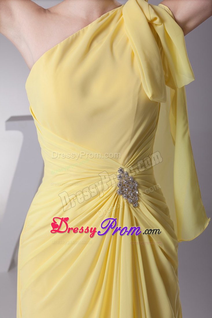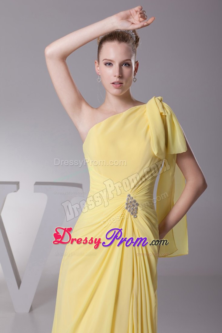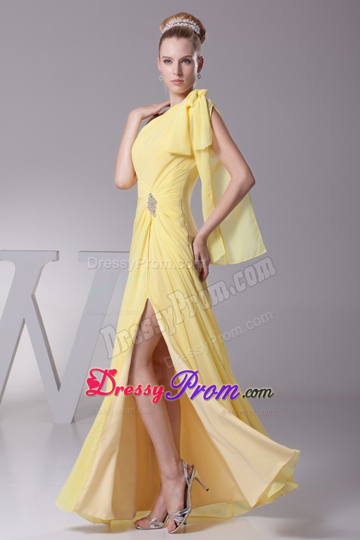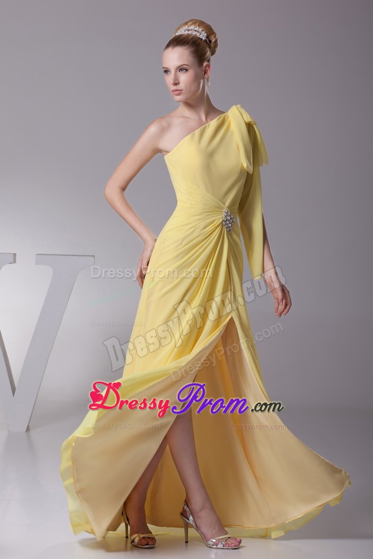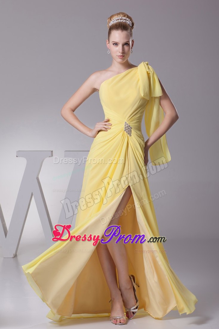 Look like you just stepped from the pages of a fashion magazine in this stunningly beautiful gown. It features an one shoulder neckline and ruched waist. The one shoulder strap is gathered with a knot, while the waist is accented with shining beads and flatters the figure perfectly. The skirt with a slit is created from soft chiffon and the hem pools elegantly at your feet. It is just a gorgeously simple dress for any event or occasion.
