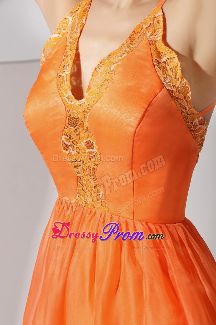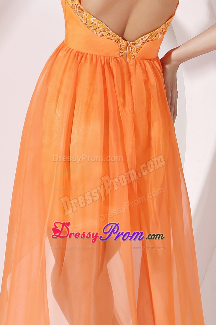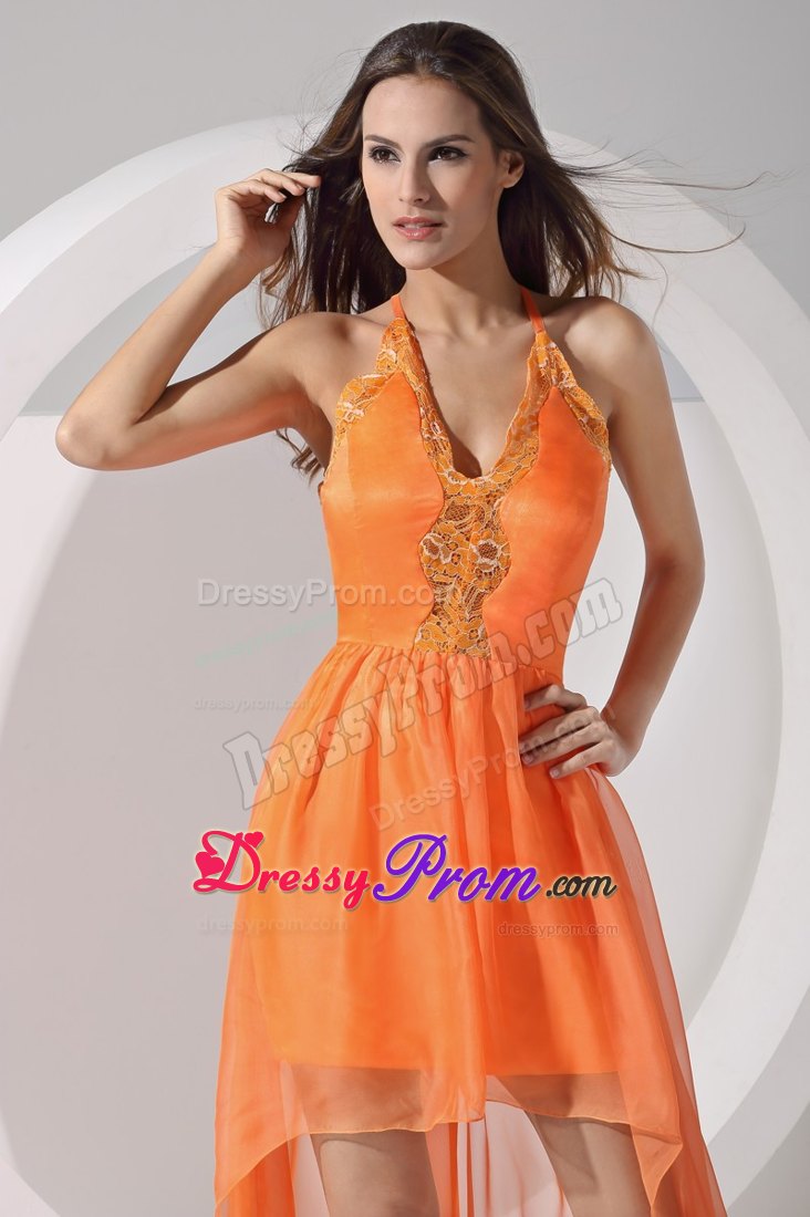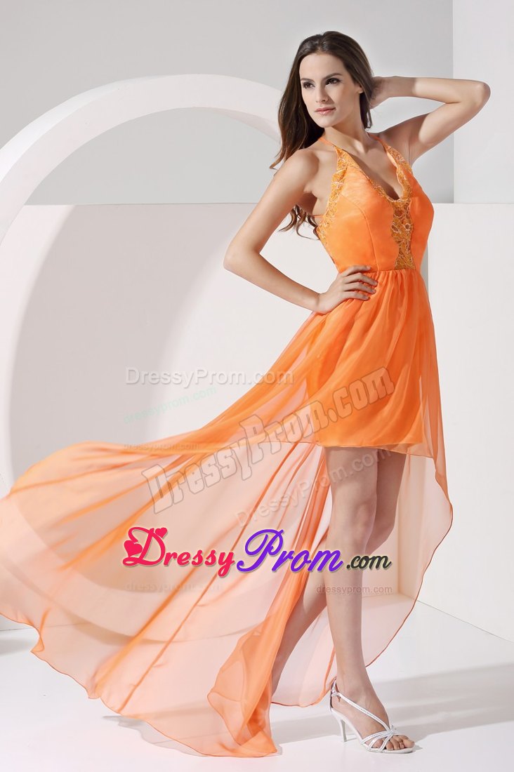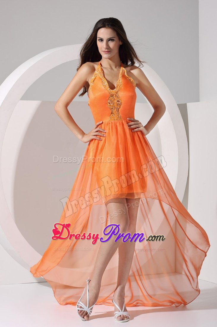 The bodice accented by the embroidery and the halter neckline flatters most figures. It truly is an example of high end couture fashion. The high-low skirt is orange and sways freely when you move in a pretty column shape. You are sure to be charming and fabulous at your very special day when you wear this taffeta and organza prom dress.