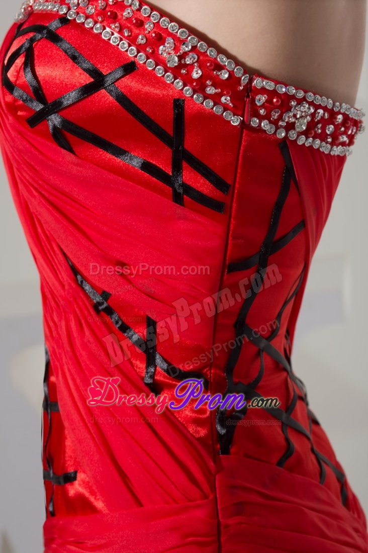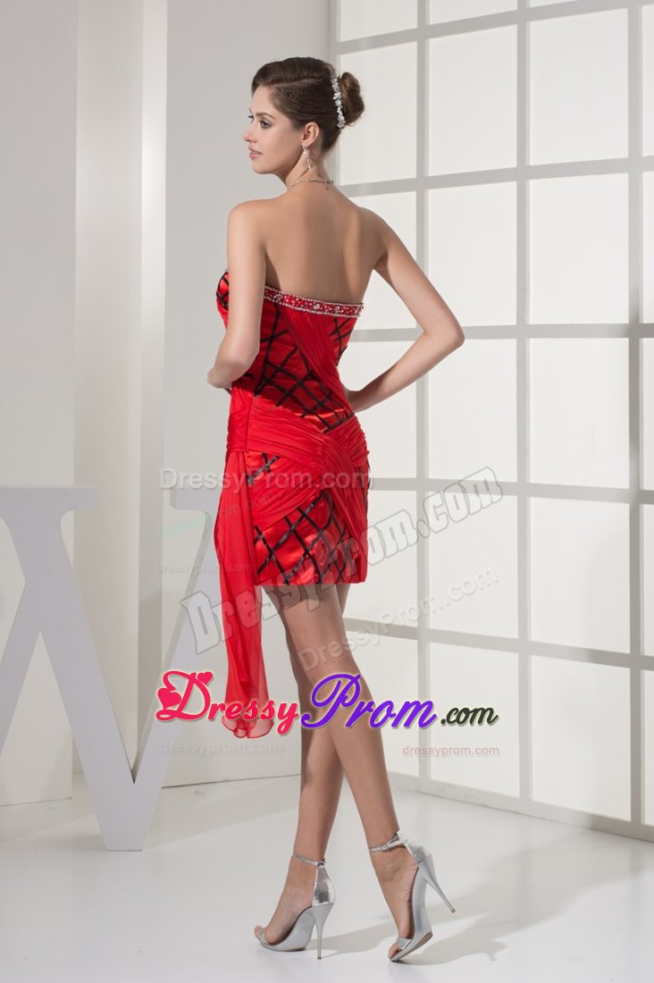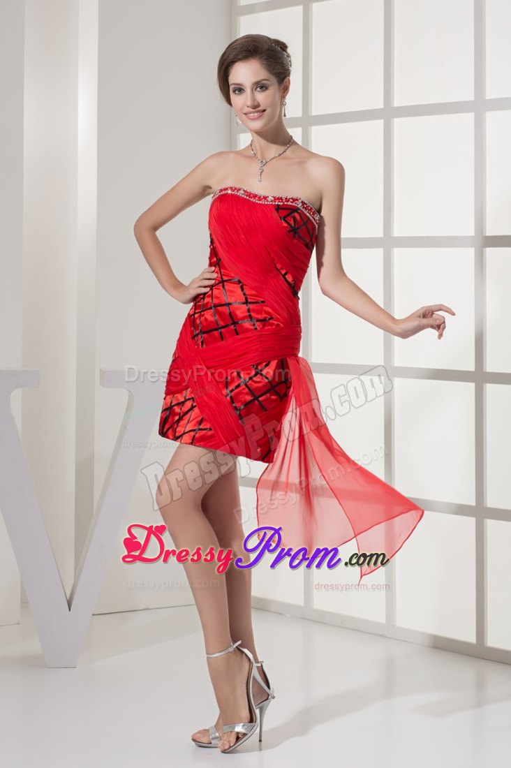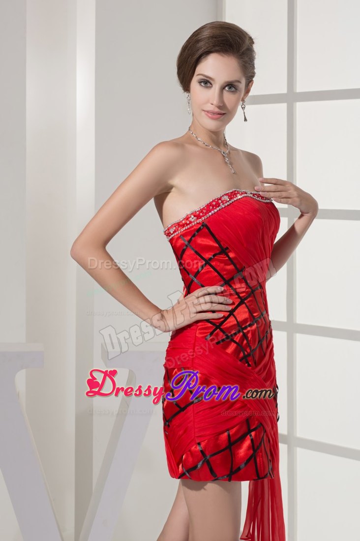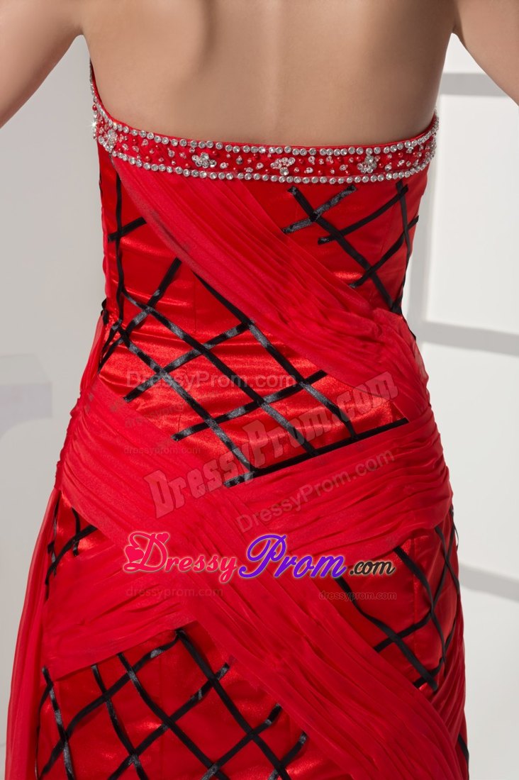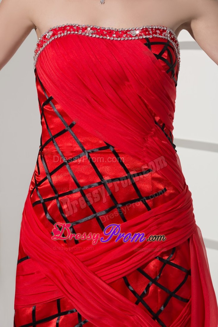 This black and red short sheath style prom dress features beading, strapless, cross over chiffon fabric to make this dress unusual. The zig-zag black fabric pattern cross the dress to its knee length skirt.This style is also available with a floor length skirt.