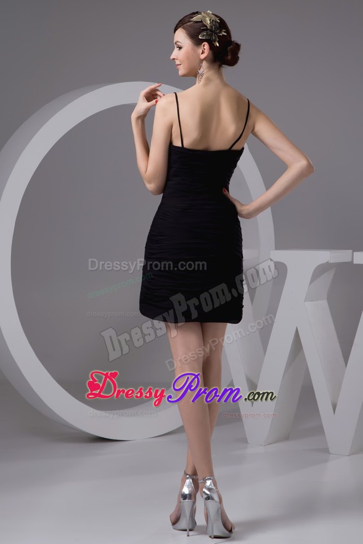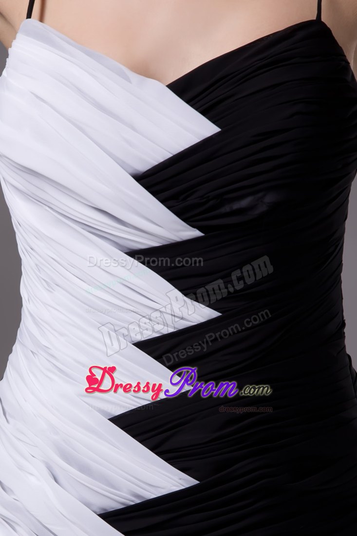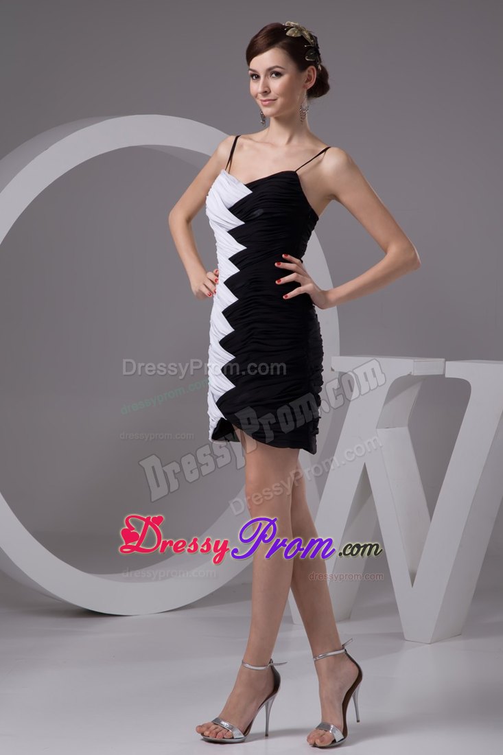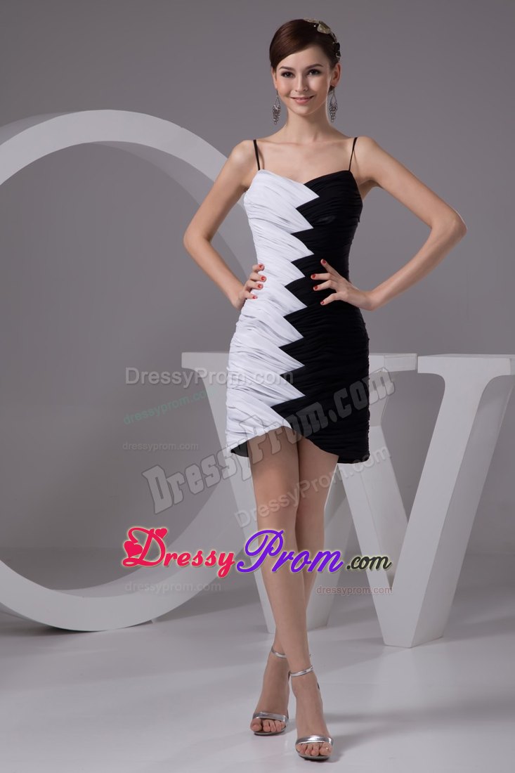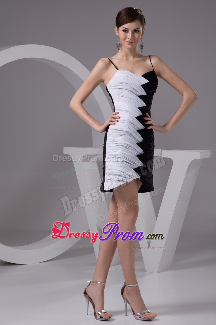 A sexy mini-length dress features plenty of gathers on the fitted bodice and run down to the hip bone faultlessly. This prom dress features spaghetti straps neckline and sheath silhouette. The zigzag shape of the black and white is the spotlight of this dress. Side hidden zipper closure secure the dress in place.