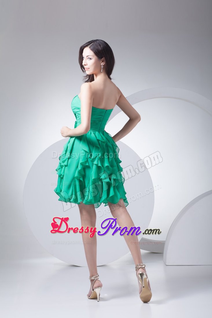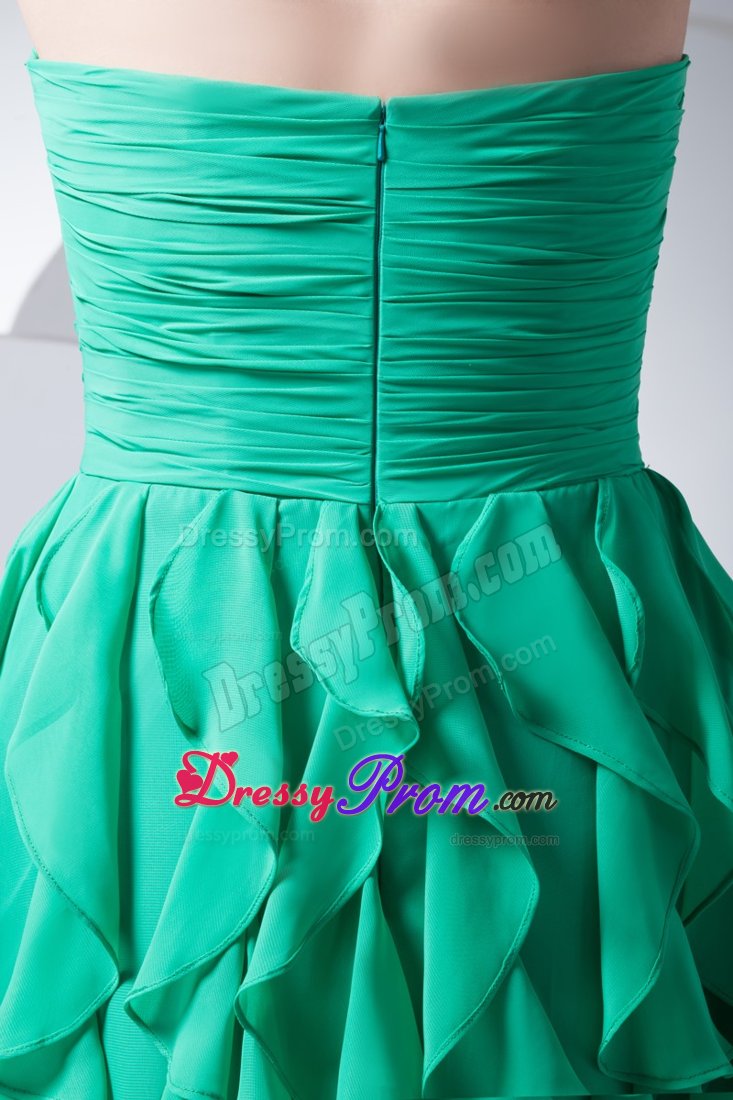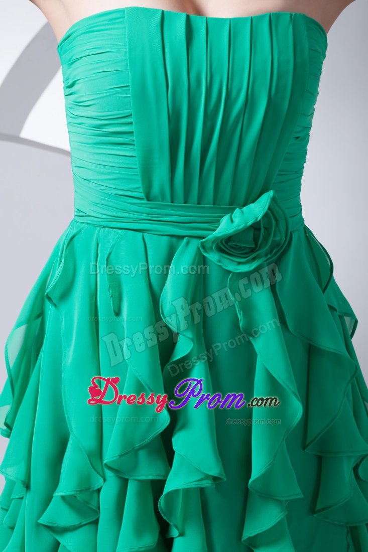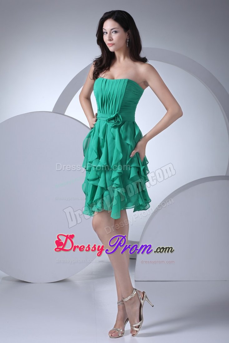 The prom dress features the nice pleat on bodice and beautiful ruffles on skirt. A delicate handmade flower is attached to waist to modify feminine body proportion. The green dress hits thigh.Hidden zipper at back completes the look. The style is popular.