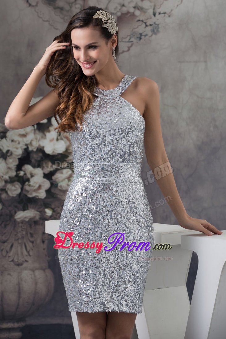 Short and flirty dresses are just as much fun to wear as they are to look at. This wonderful sequins dress features halter neckline and column silhouette. The dress is made of sequined material over elastic silk-like satin. Back hidden zipper closure secure the dress in place.