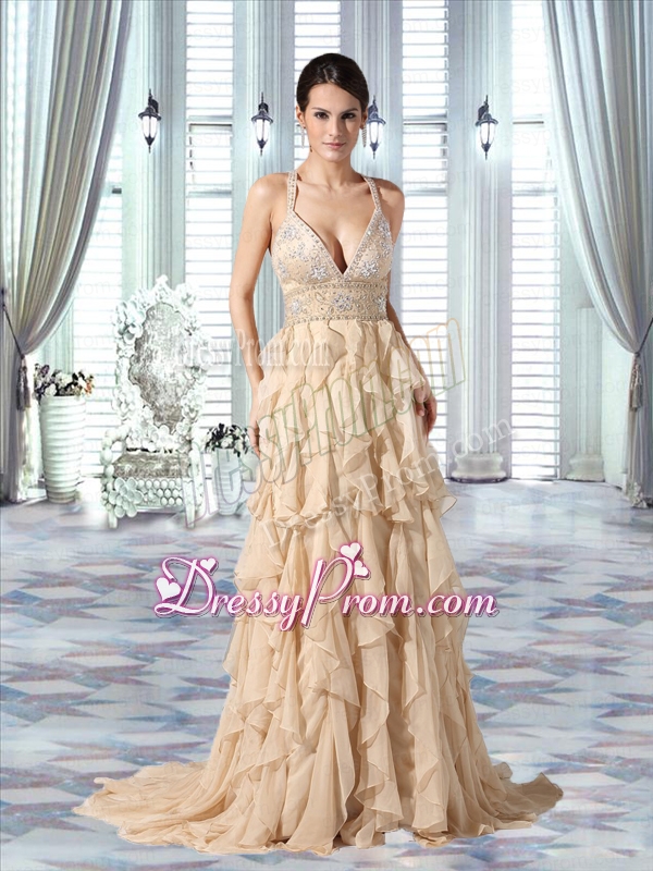 This halter chic prom gown dress must be the dreaming dress you are looking for. Column fitted bodice is highlighted the body curve. The floor-length chiffon prom dress gives you sense of delicate beauty. A fitted, straps bodice made of an all-over embroidery accenting the v-neck neckline. The ruffled skirt is highlighted with the brush train. If you're looking for a high-end dress without the high-end price tag, this is definitely one you should consider.