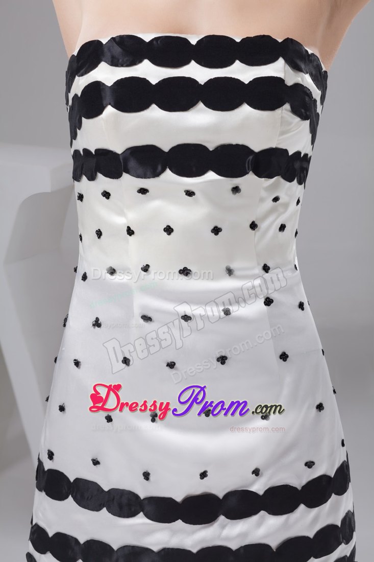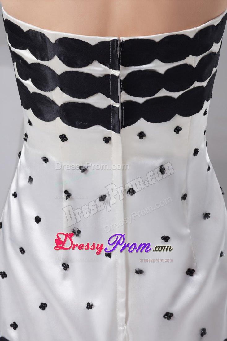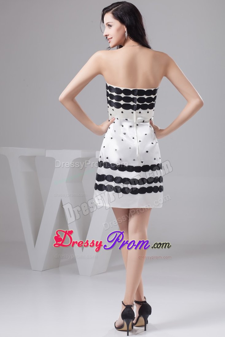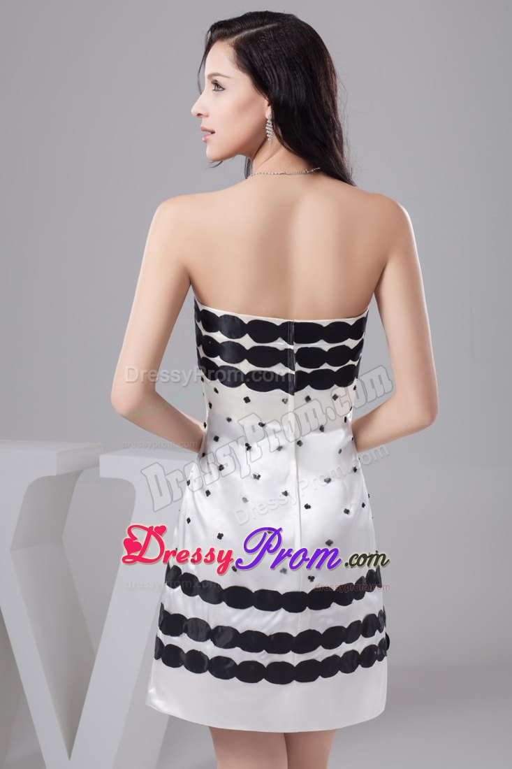 This white and black short dress is so sweet and sassy . A fitted bodice made of satin accenting the strapless neckline.Floral pattern and sequins decorate the whole dress beautifully. The mini-skirt is perfect for showing off your long legs and your figure. The hidden zipper up back completes the look. You will absolutely love this flirty short dress.
