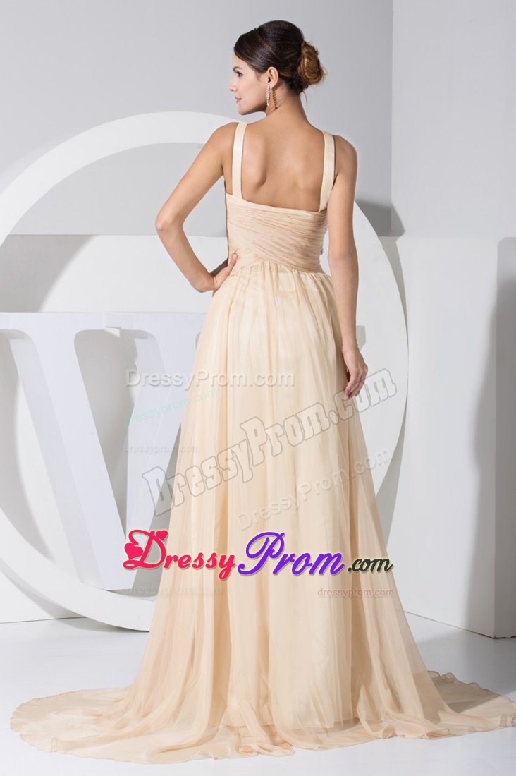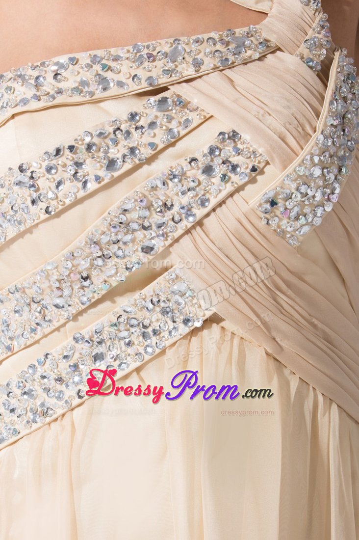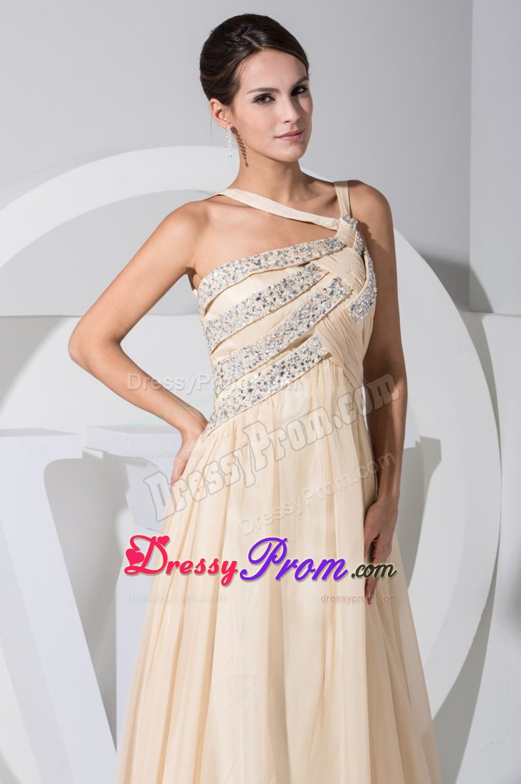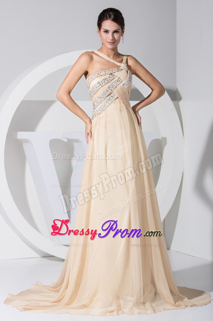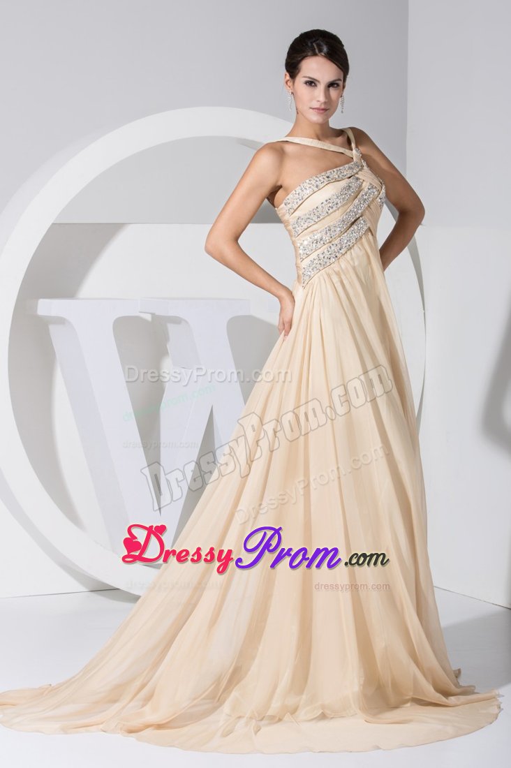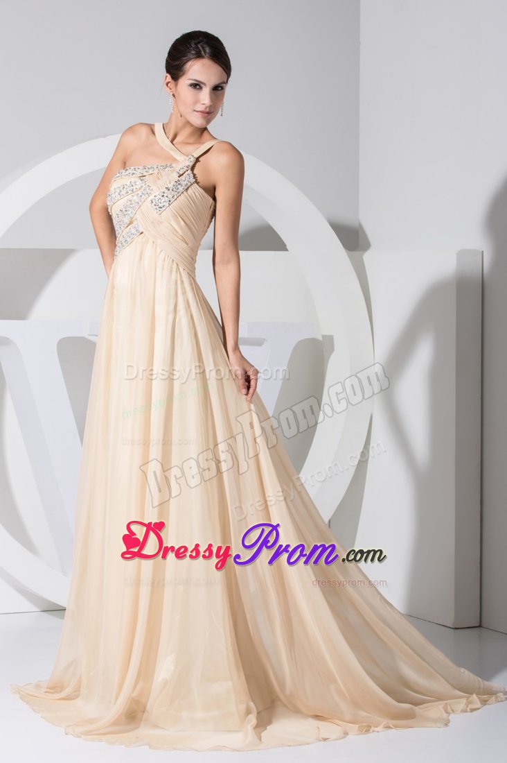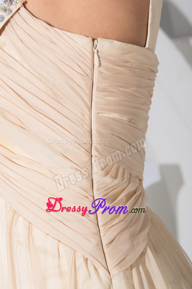 The gorgeous champagne prom dress is adorned by an asymmetrical neckline and a heavily ruched bodice.Dainty beading spreads evenly on the ruching and form some clean lines. The natural waist extend and gather with the pleated skirt to create a brush train on the back. The back is defined by clear ruching and a hidden zipper at the side completes the look and makes for easy on and off.