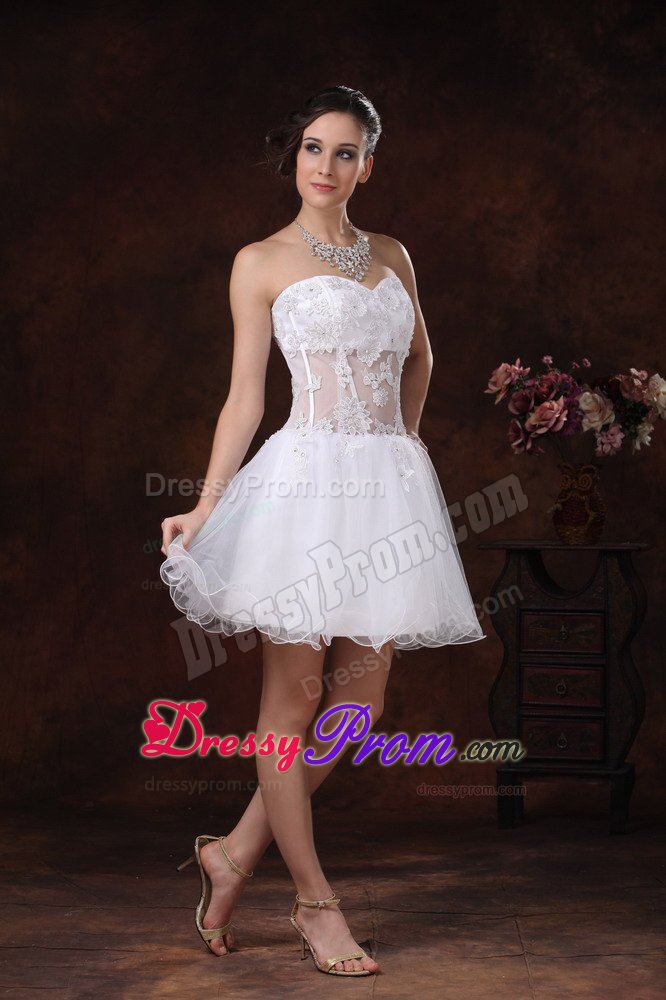 Flirty, sexy, allure are all the words to describle this dress. The sweetheart bodice features a mini satin layer to cover your bust and then contunues a sheer lace to show your waist and mysterious navel.A sheer lace back shows off your pretty back figure and add the sexy look. This white short prom dress is highlighted with the layers.The skirt flowing freely with the breeze.You will be the princess when you wear the white A-line sweetheart prom dress.If you're looking for a high-end dress without the high-end price tag, this is definitely one you should consider.