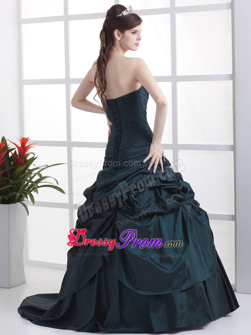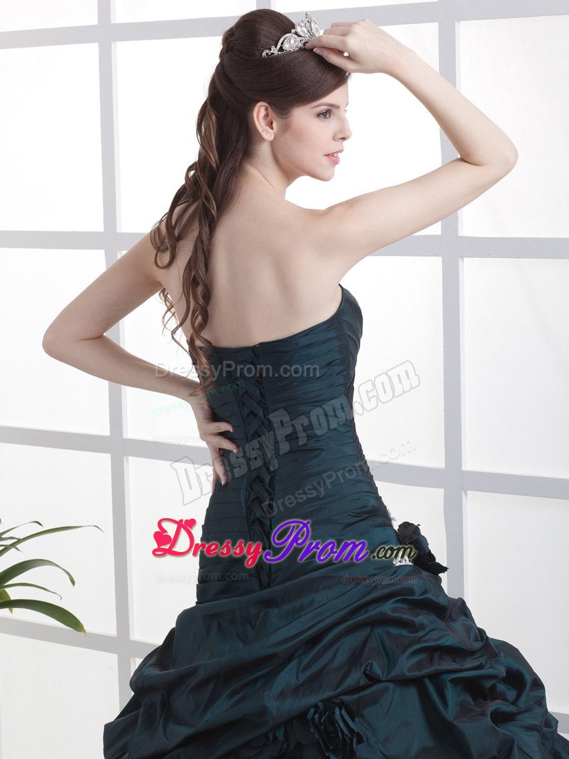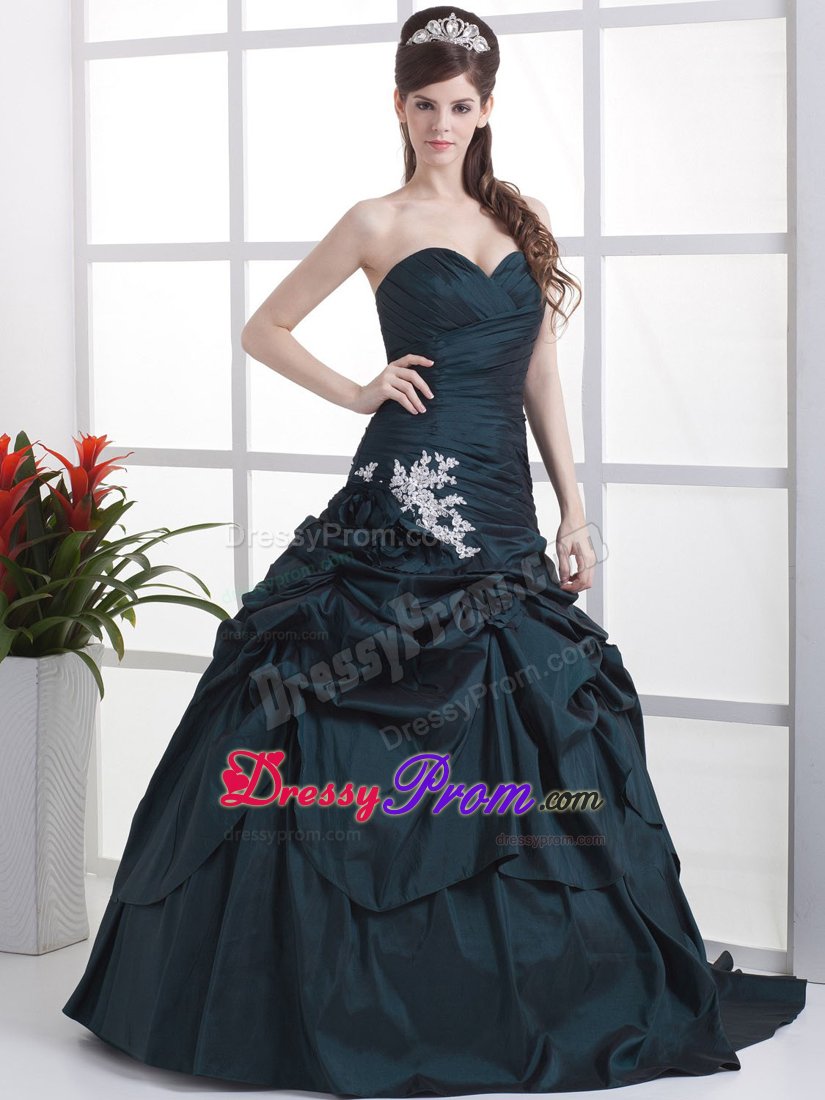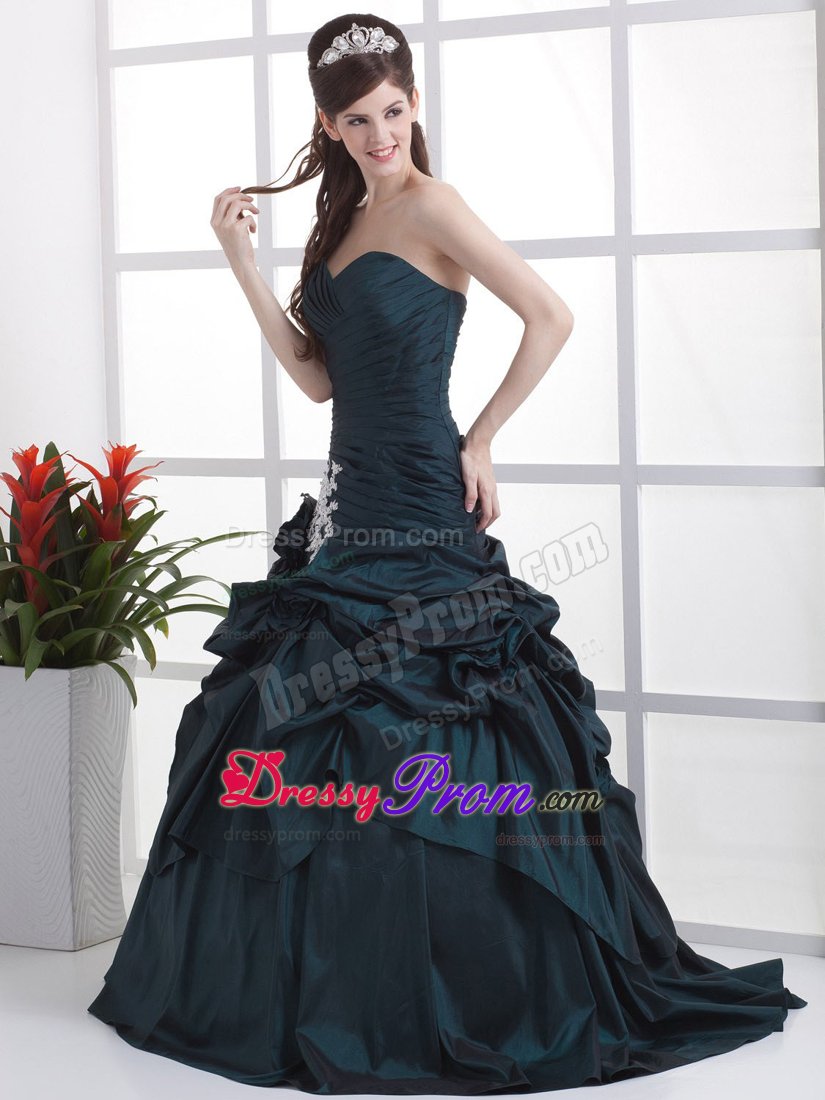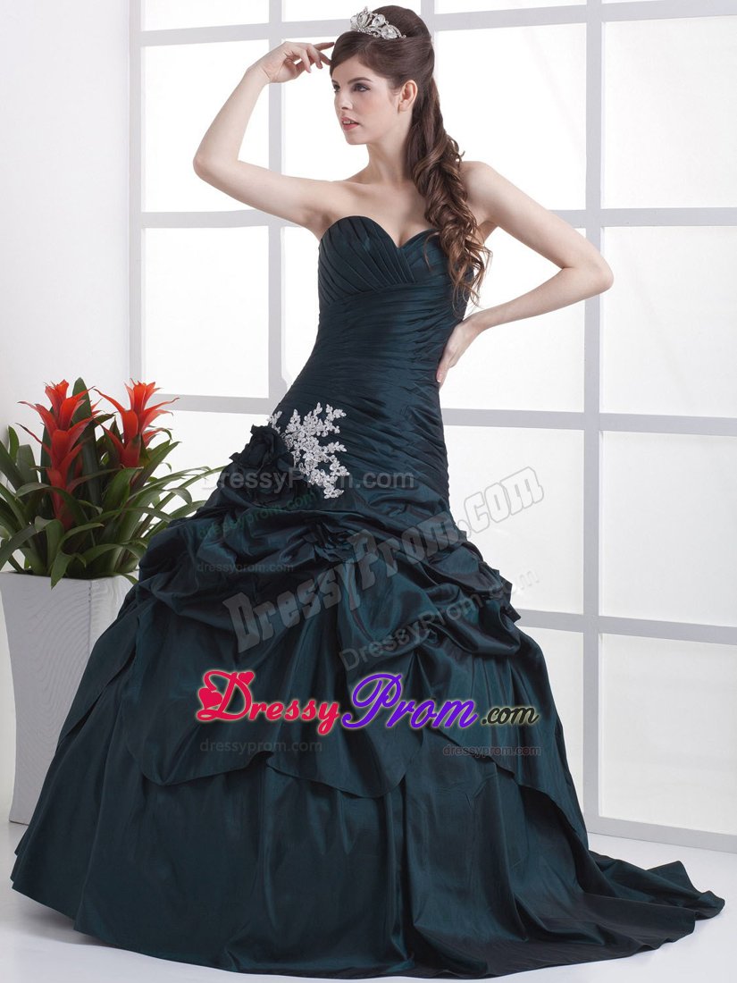 Look like a princess in this amazing strapless sweetheart ball gown quinceanera dress style. The fitted bodice features a fashinable sweetheart neckline and exquiste ruchings that contours your curve. The appliques and pick-ups give you a sense of romance. The back is lace up back so that you can adjust the dress according to your own figure. You'll surely be a belle on your special day.