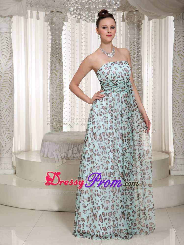 Be the belle of the ball in this fabulous printed prom dress. The dress is covered with gorgeous leopard prints from the bust to the very end of the silhouette just reveals the sequined straight neckline and a wide pleated waistband that adds more interest. The back closure is a simple zipper. This is really the glamour of a Hollywood premier.
