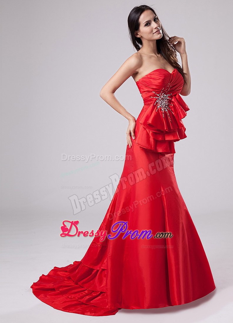 Get the look all your friends will envy as you arrive at your prom or formal in this stunning strapless red prom gown. This is an elegant evening gown with a strapless sweetheart neckline on the ruched bodice. Dazzling beadings on the empire waist crates a flattering trim fit. Float into your prom or black tie event in this long strapless dress and it will look as if you are walking on air.