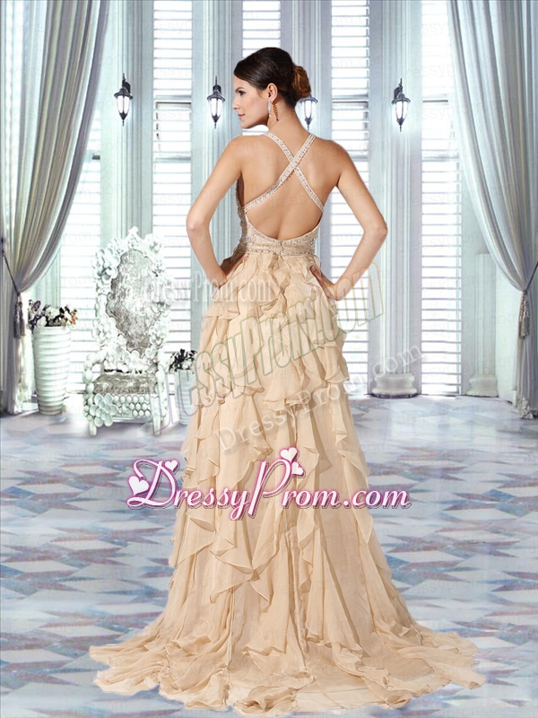 This halter chic prom gown dress must be the dreaming dress you are looking for. Column fitted bodice is highlighted the body curve. The floor-length chiffon prom dress gives you sense of delicate beauty. A fitted, straps bodice made of an all-over embroidery accenting the v-neck neckline. The ruffled skirt is highlighted with the brush train. If you're looking for a high-end dress without the high-end price tag, this is definitely one you should consider.