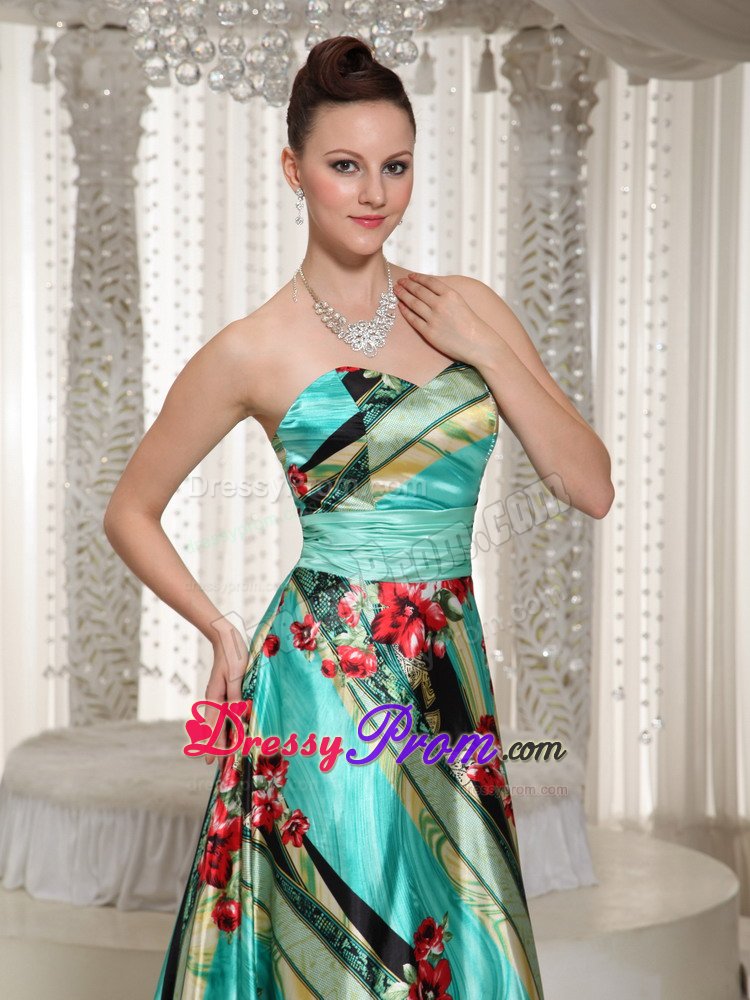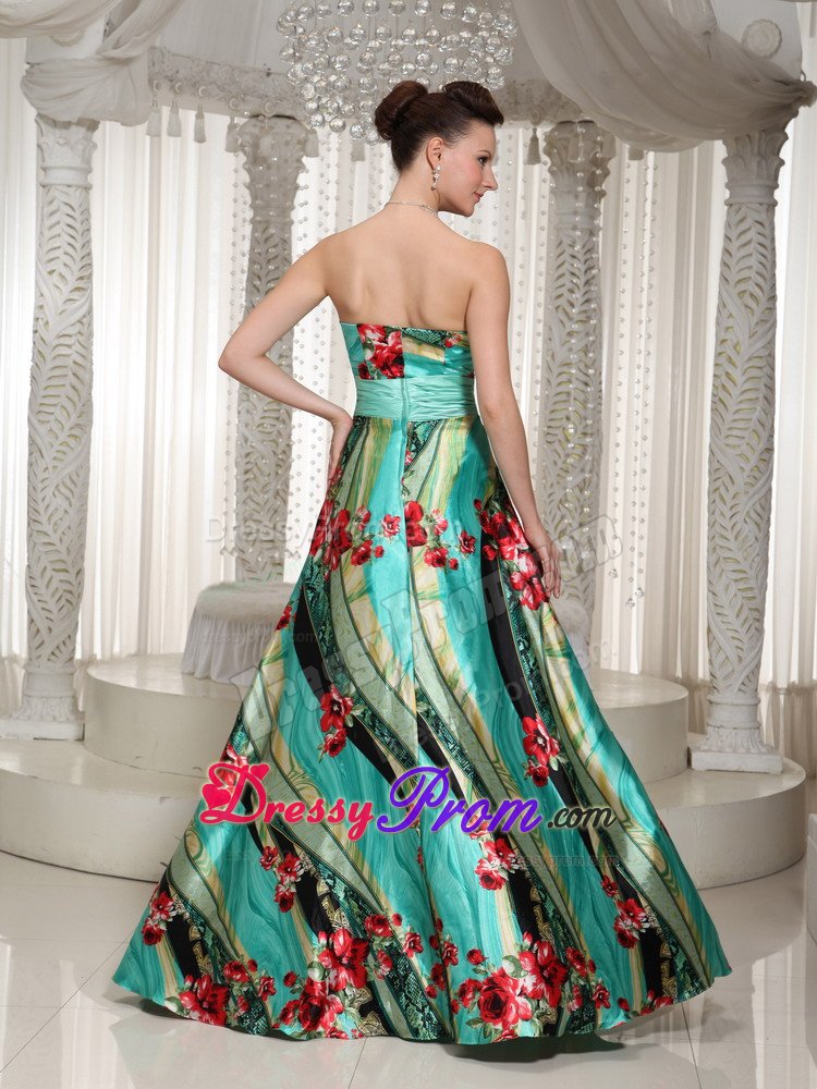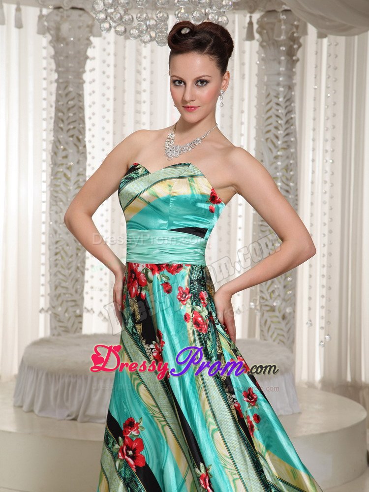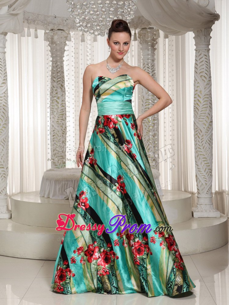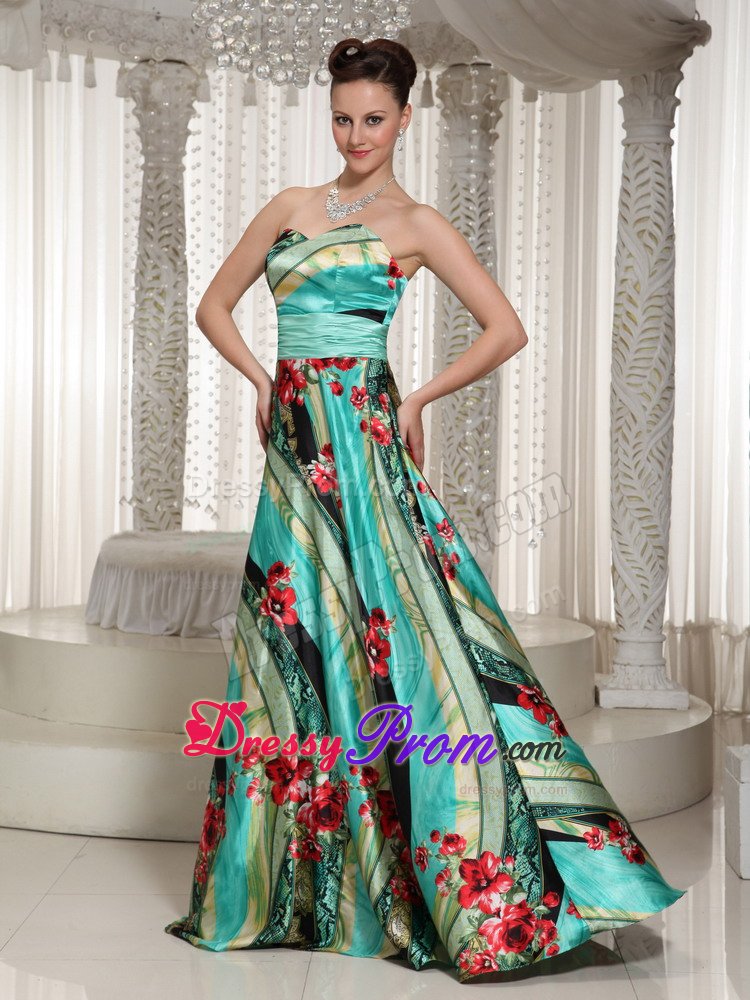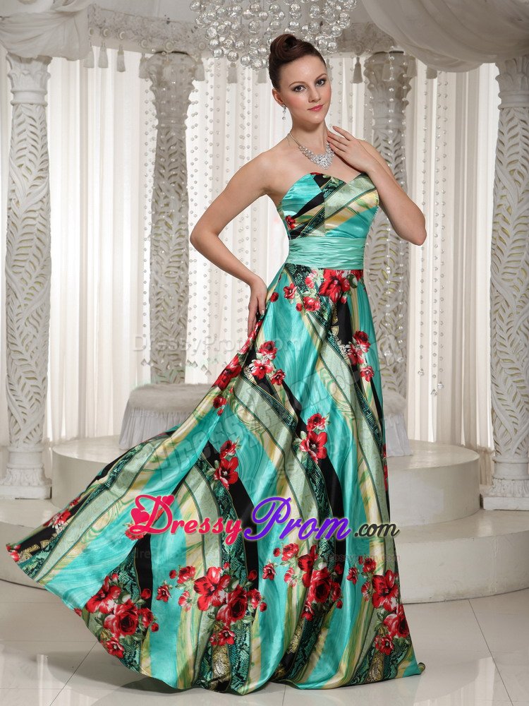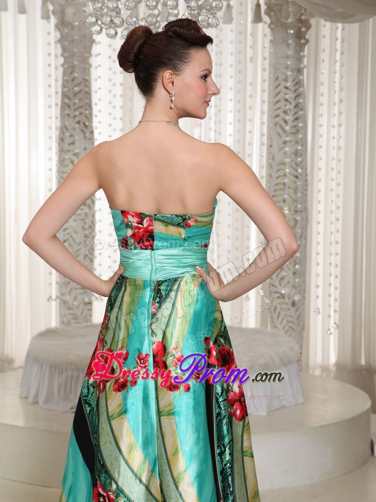 Do you want to experience the feeling of being the spotlight? This colorful printing prom dress will make your dream come ture. It features a strapless bodice with a sweetheart neckline. The ruched wasistband with a broach in the middle contours your curve. The hidden zipper in the back of the dress secures it in place and makes for easy off and on. A stunning dress you can't miss.
