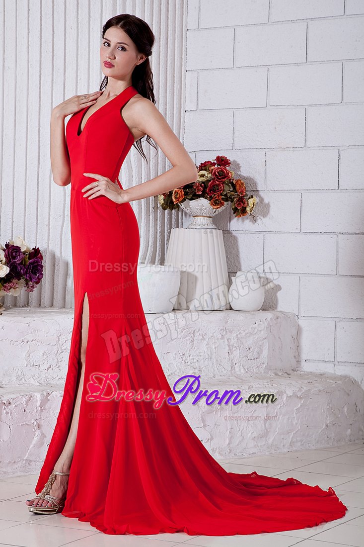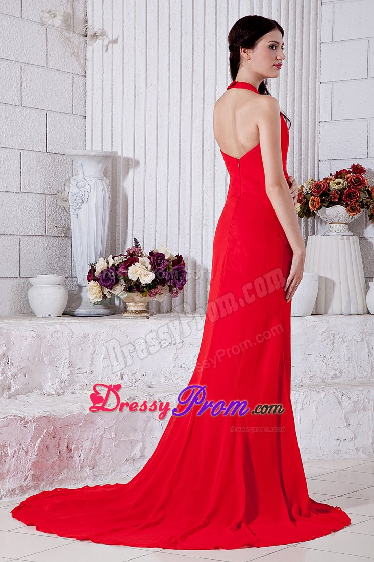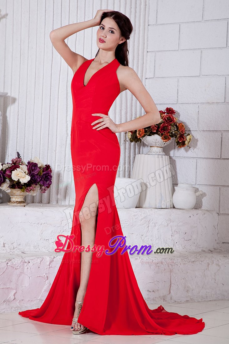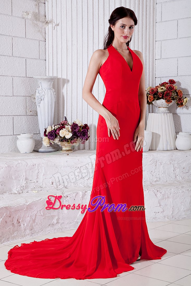 Elegance is what this red prom dress portrays! Halter top and deep V-neckline make a way for a sexy half-open back and a court train for accent. The empire skirt flows beautifully with a loose fit that will make it easy to move the night away. Hidden zipper up back completes the fabulous look. This dress will be sure to become a show stopper!