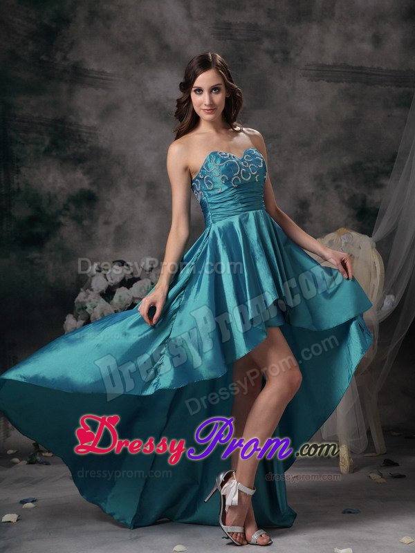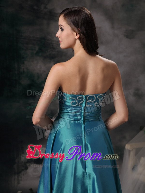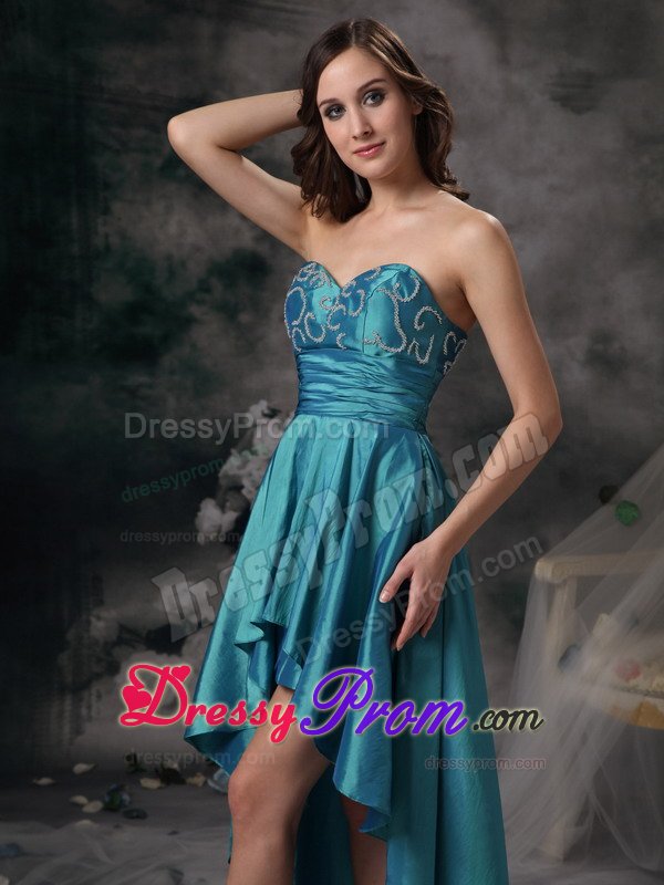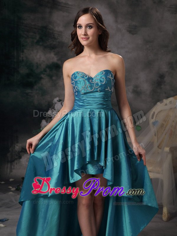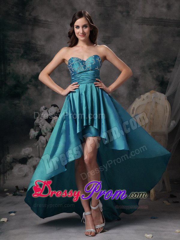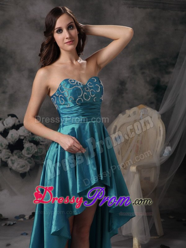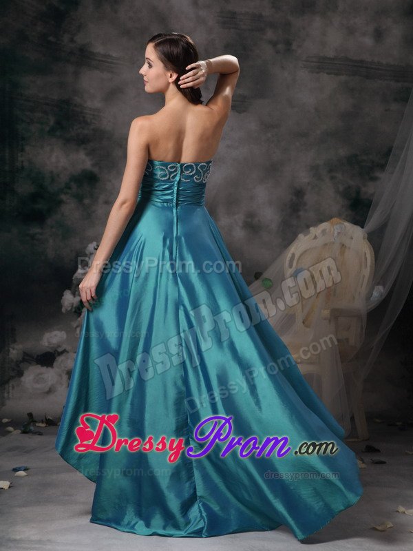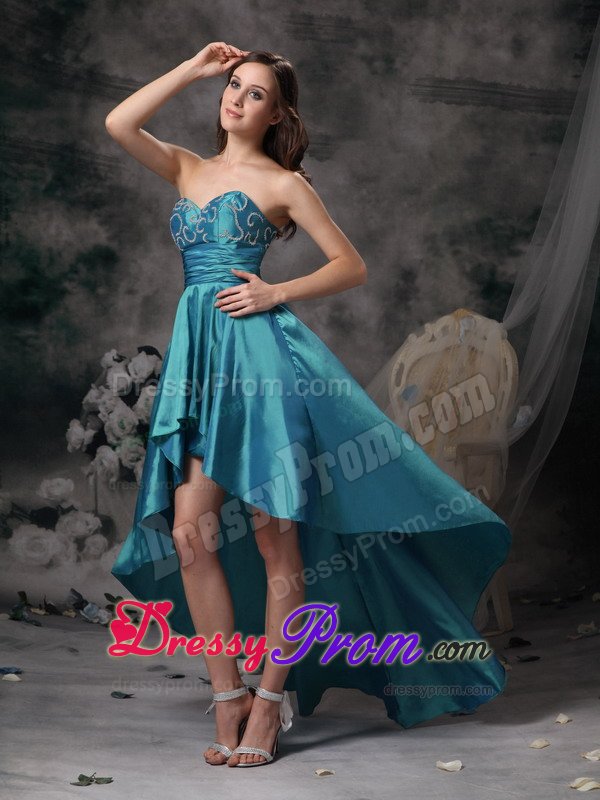 Strapless dresses are one of the sexier styles on the market today. This one features a strapless bodice with sweetheart neckline and zipper up back. Silver, shimmering embellishments adorn the dress throughout and catch the light in a lovely way. This gown has a lovely high-low skirt.