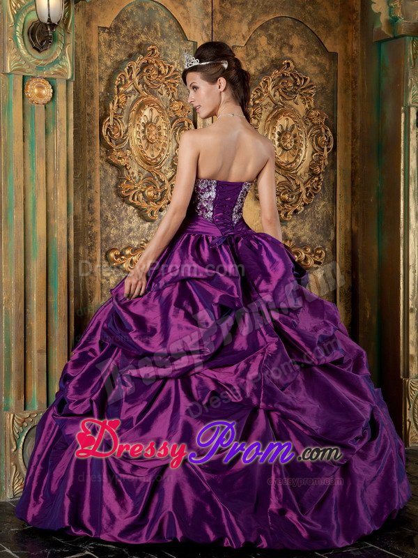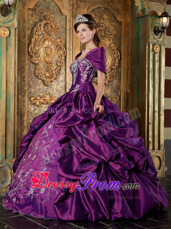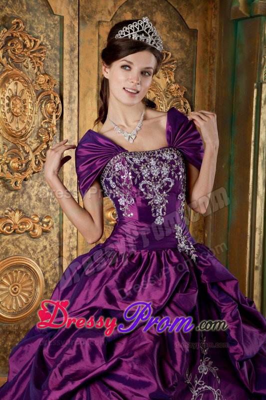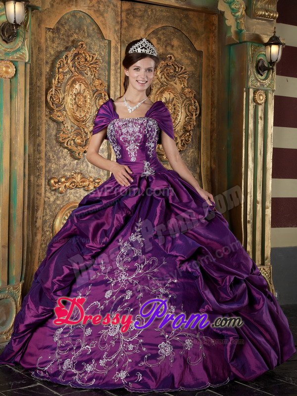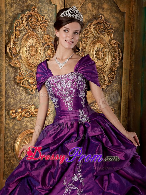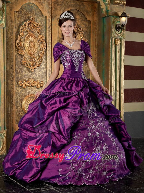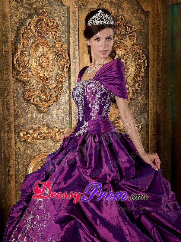 This purple quinceanera dress will absolutely adds your feminine charm. It features a special straps and the bodice with tastefully embroidery and bead . The skirt is full and puffy. Sheer, sequin-studded material sweeps down, and a boldly ruffled overlay drapes over it. Blow all of their minds with this picture-perfect gown!