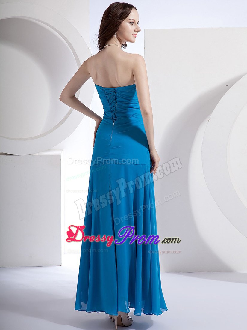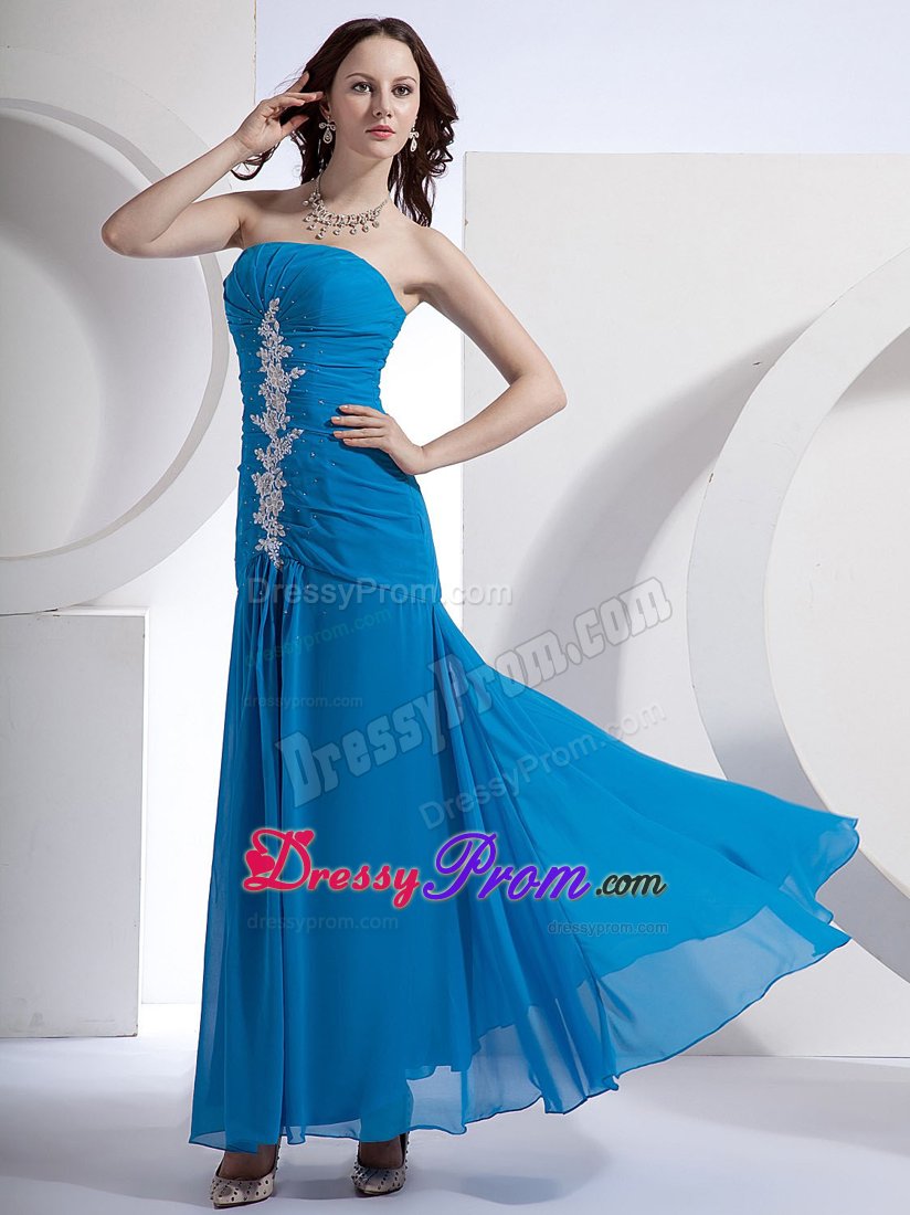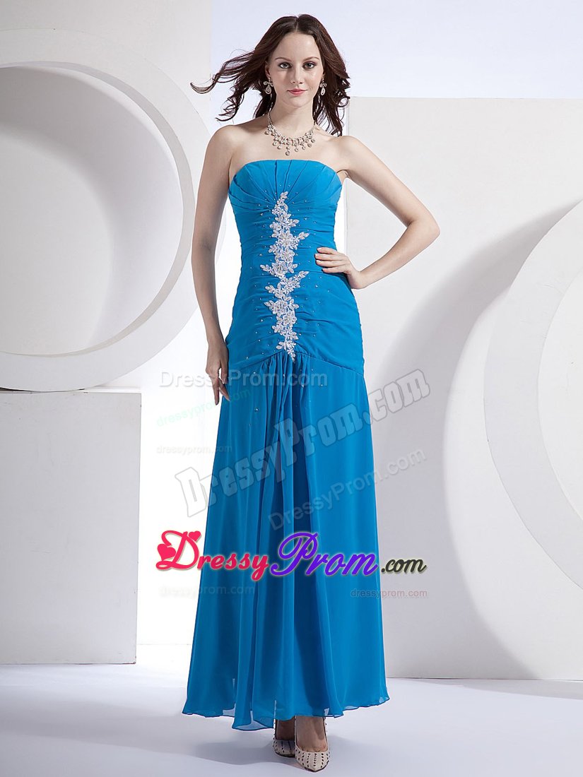 To be an elegant princess at your party, with this beautiful and luxury prom dress, you will be the shinning star! This strapless neck shinning dress is outstanding for the ruch on the bodice and the delicate appliques on the bodice. The soft and flowy skirt is ankle length which will show your beautiful shoes. The design completes with zipper up back. It is a wonderfull dress, so elegant, so stylish � perfect for any occasion!