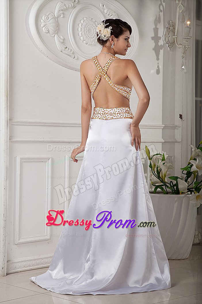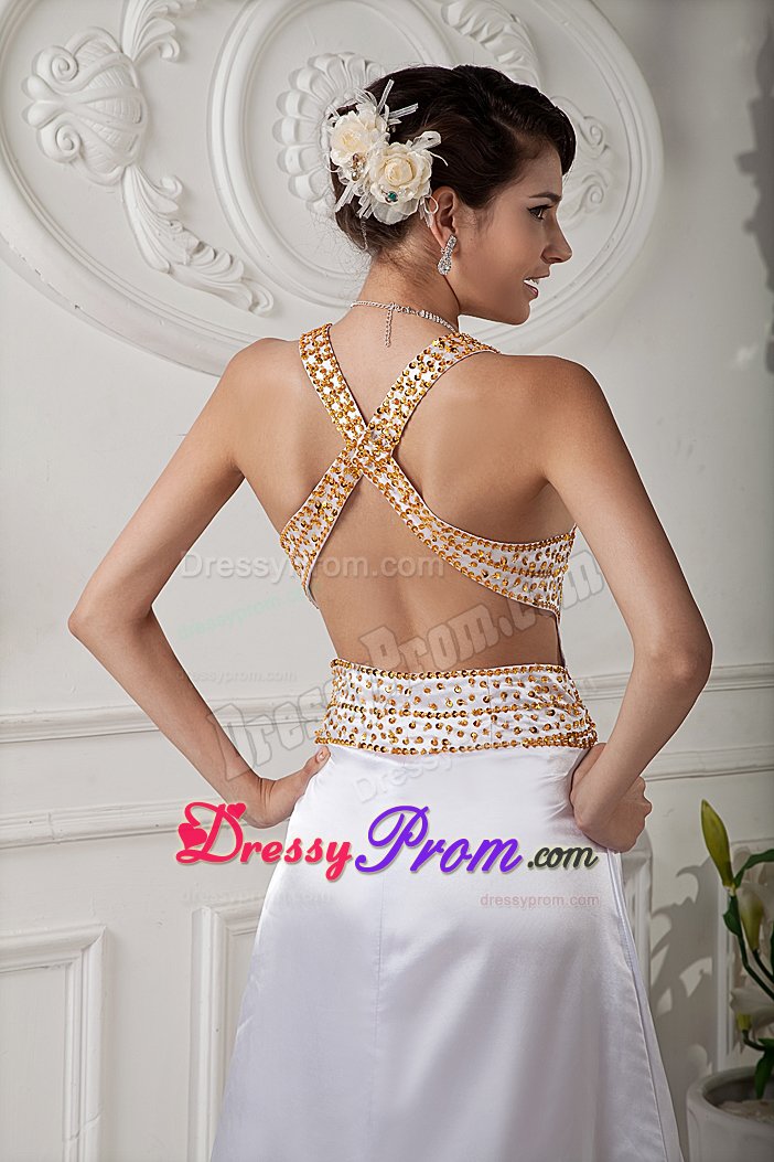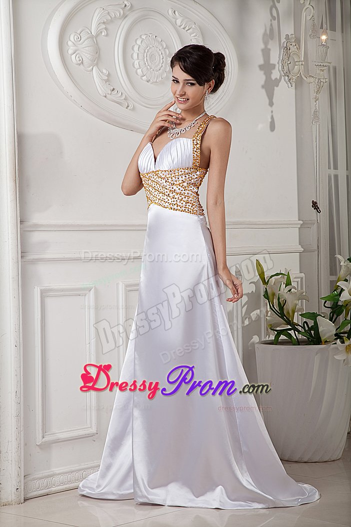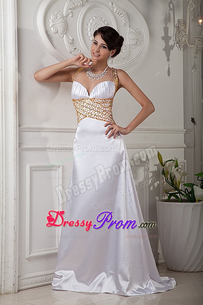Sexy, sultry and stunning! Just a few words that describe this gorgeous dress. It features a bikini style top that has wide halter top strap and a flattering V neckline. The straps and the waist band are heavily embellished with beautiful rhinestones and beading. The back of the dress features an embellished strap across an exposed back, which really creates a lovely effect. The A-line-style skirt slightly flares out from the waist to the floor, leaving a sweeping train in the back. Hot, hot, hot!