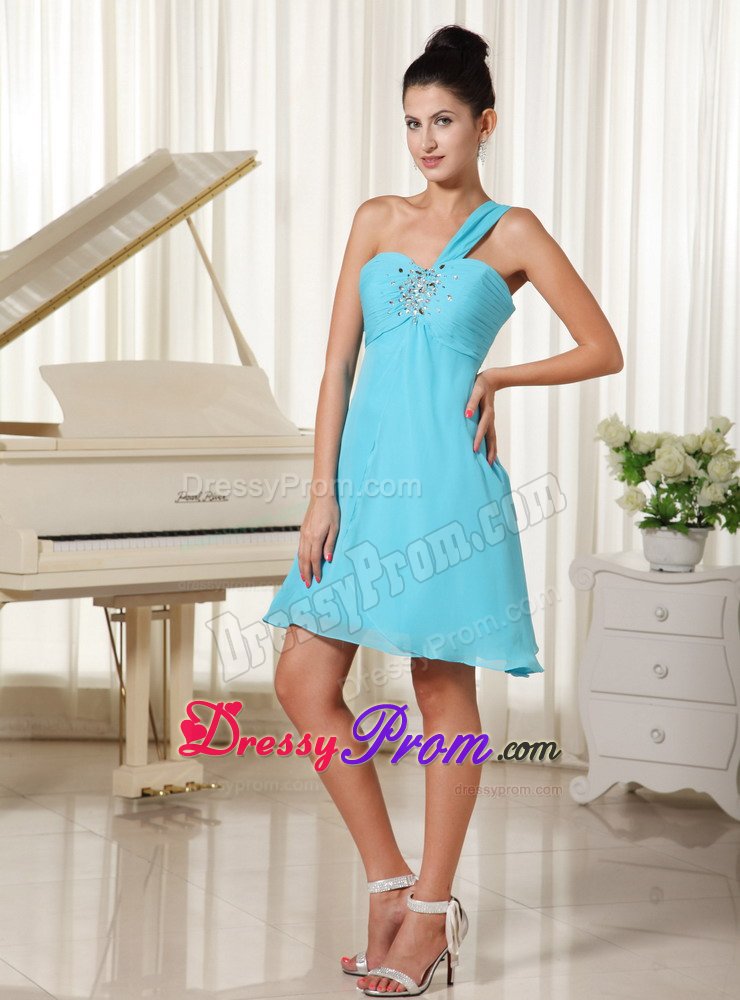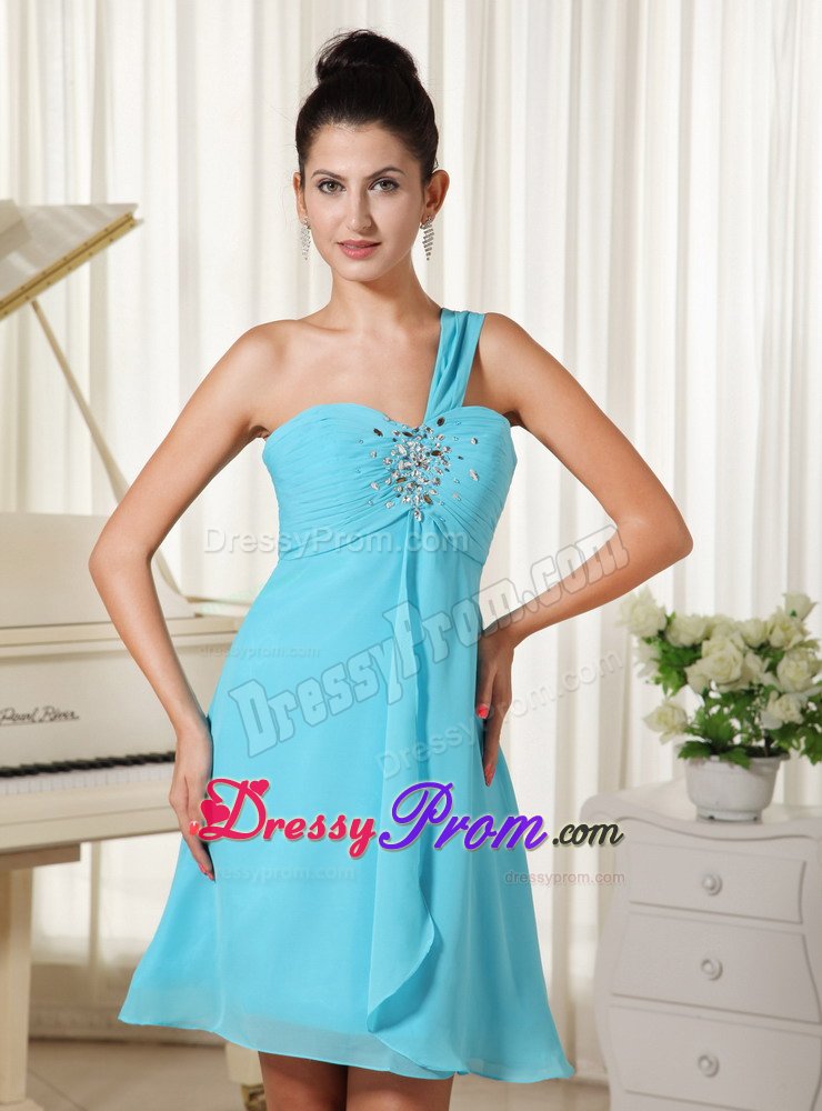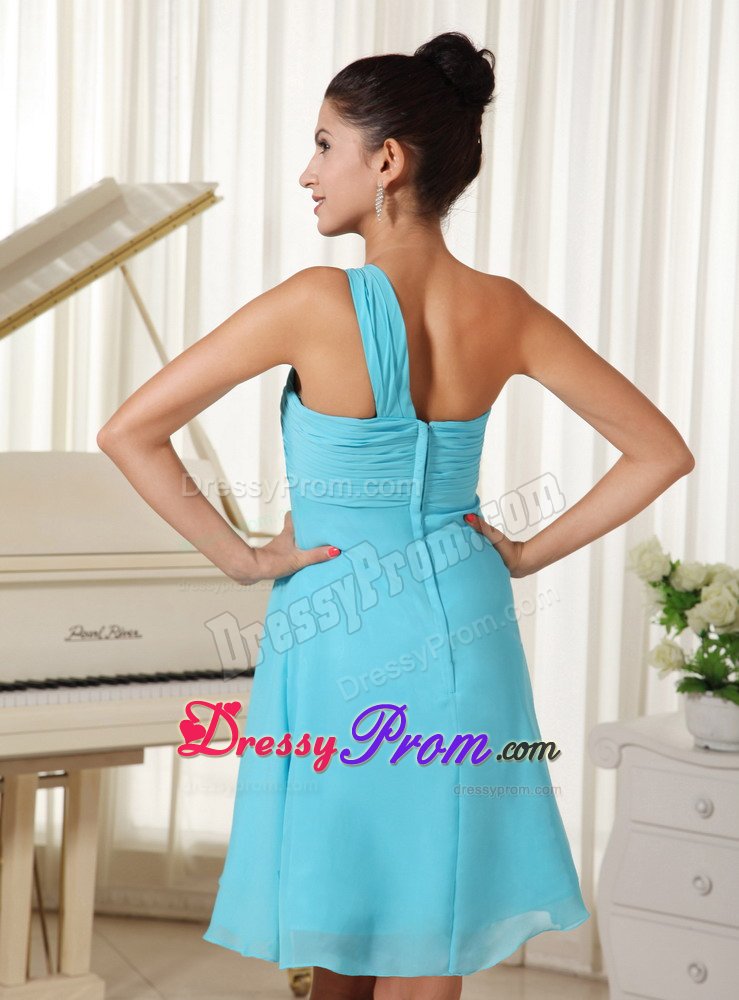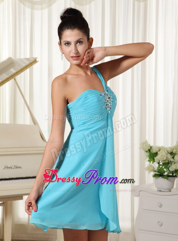 An aqua blue short prom dress, sweet sixteen party dress, or semi formal dress for any occasion you want to make special. The ruched sweetheart bodice has a wide strap, which is ruched. The super cute mini skirt is covered with sheer layers that give it a full sassy style that will look great on the dance floor. The zipper in the back secures the dress in place and ensures a great fit.