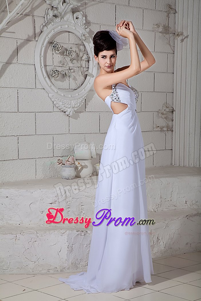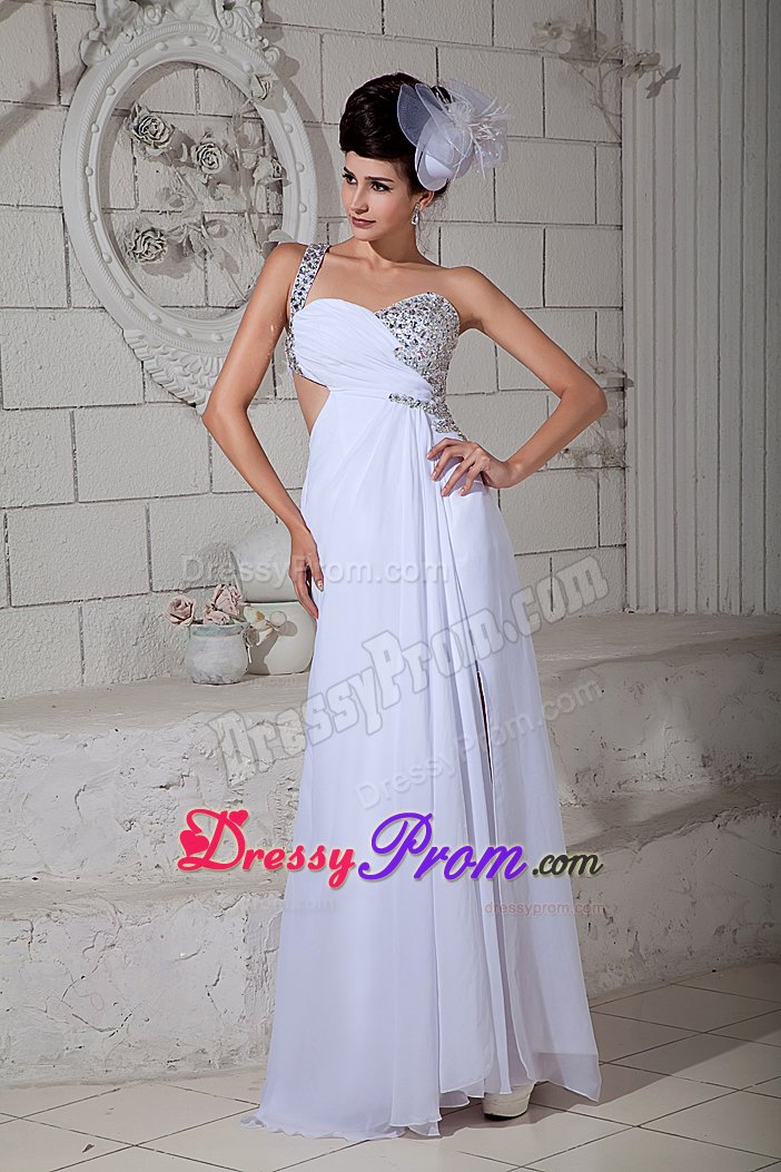 This chiffon gown has spectacular details that are sure to wow. The ruched sweetheart neckline is extremely flattering and is framed by gorgeous embelished straps.The floor length skirt has a saucy thigh high slit and train, keeping the look sleek and feminine.Make an entrance in this elegant and romantic one shoulder gown.