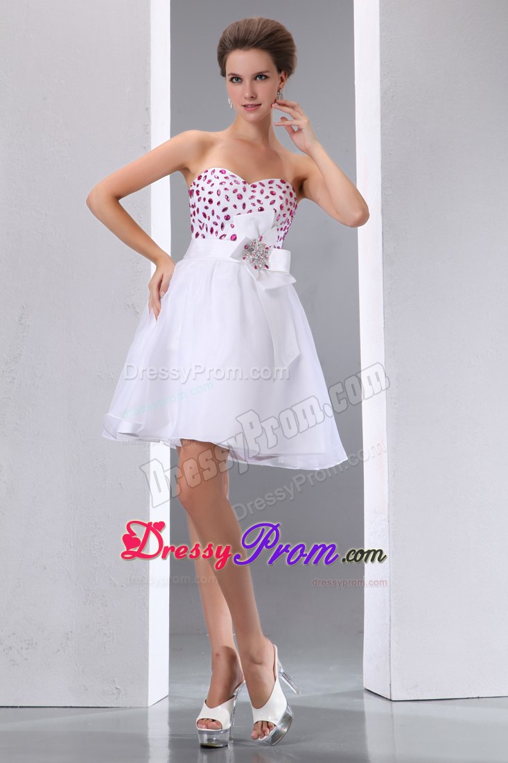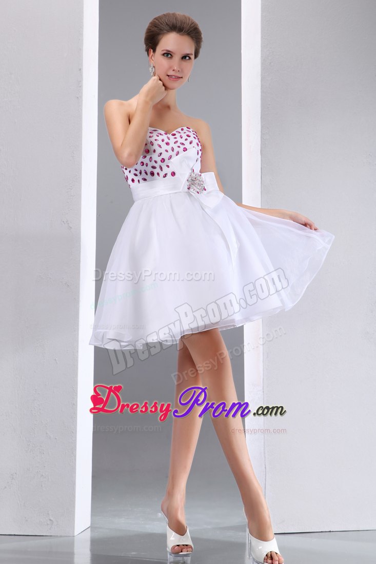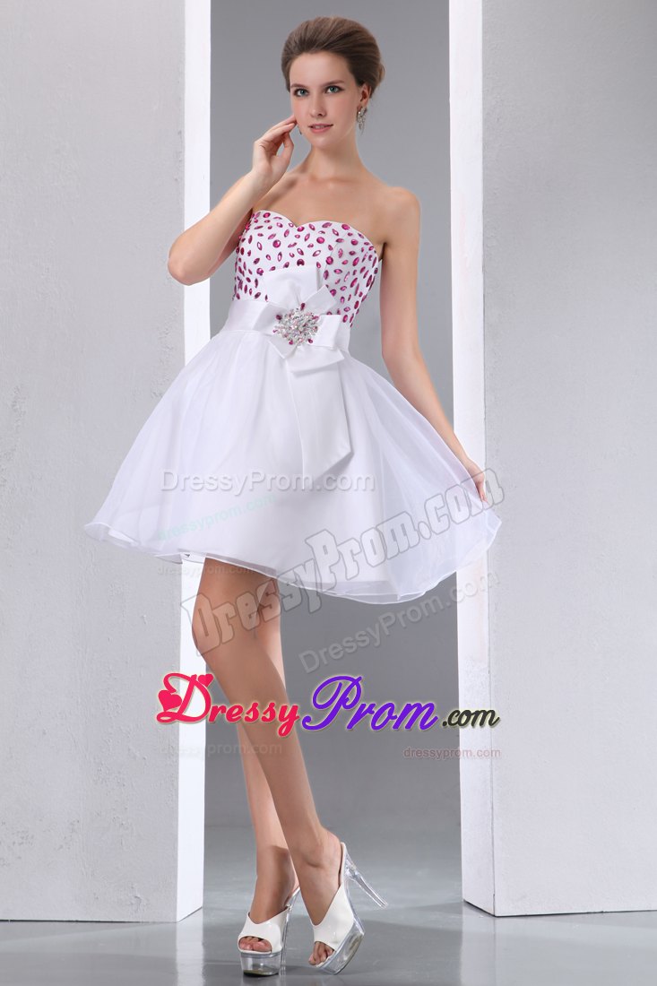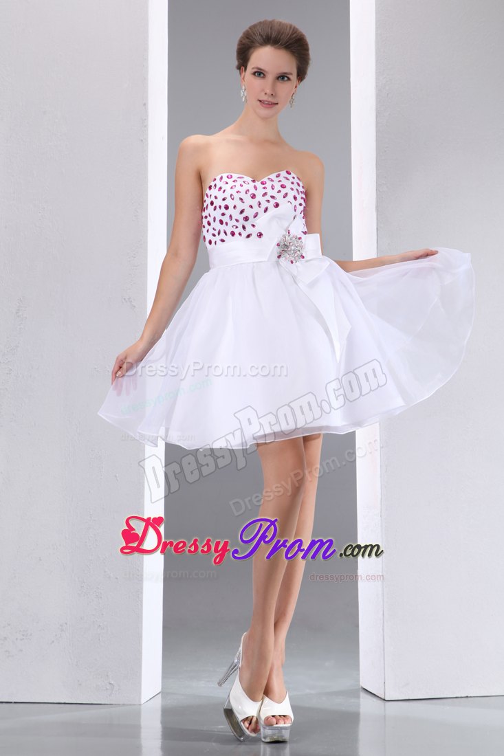 Show off your sexy legs and dreamy shoes! This cute and sexy mini dress is adorned with the fitted bodice all covered with beautiful beadings and the sweetheart neckline which curves your bustline. The waist is contoured by a wide waistband with a big bowknot decorated the band on the left side. The centre part of the bowknot is also decorated with colorful beads which also adds charming and fantasy to the already lovely dress. The A-line skirt flatters any figure with the tulle fabric overlaid flowing freely. The hidden zipper on the back allows easy off and on and secures the dress in place.