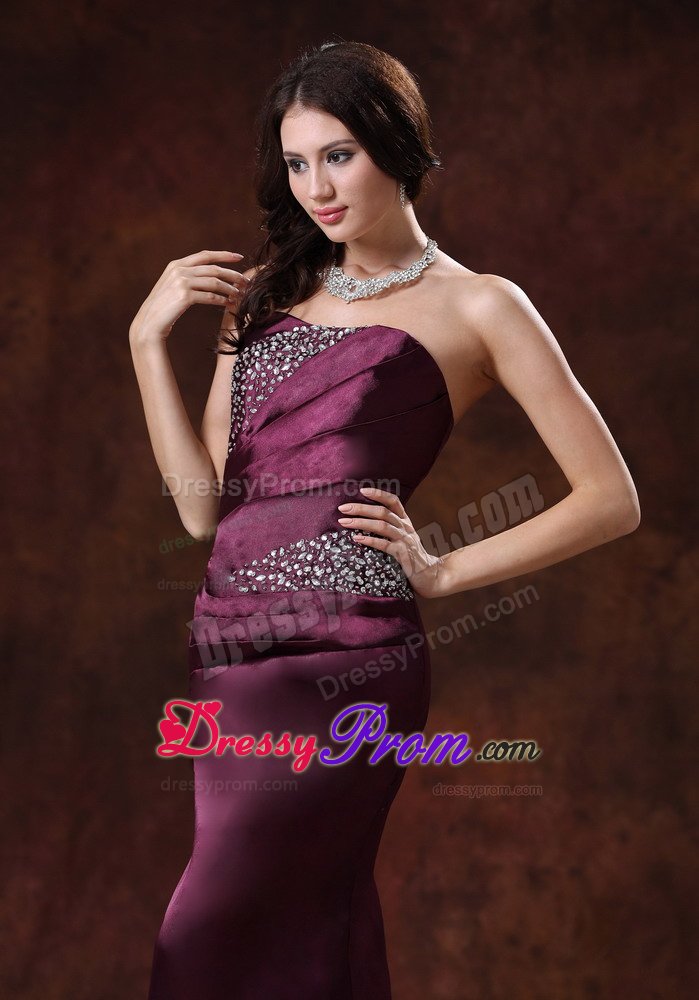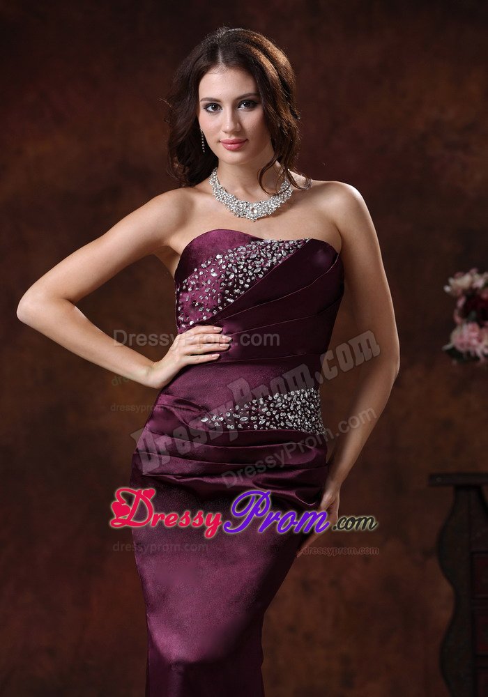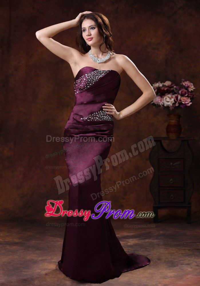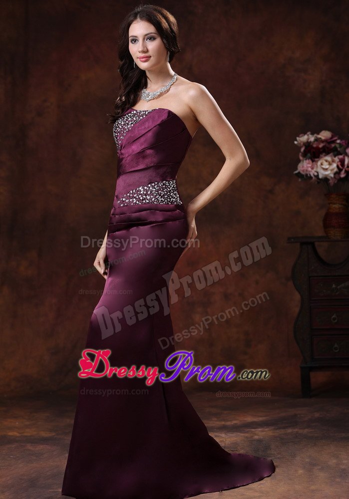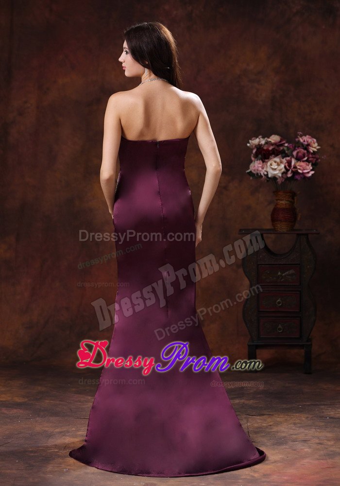 Strapless dresses are one of the sexier styles on the market today. This one features a strapless bodice with wrapped details and beading in the bust and waist area. The skirt flares out at the knee and forms a mermaid style, which sways beautifully with a brush train across the floor when you move. A corset style closure in the back secures the dress in place.