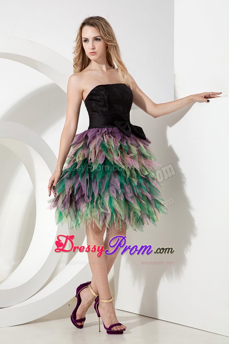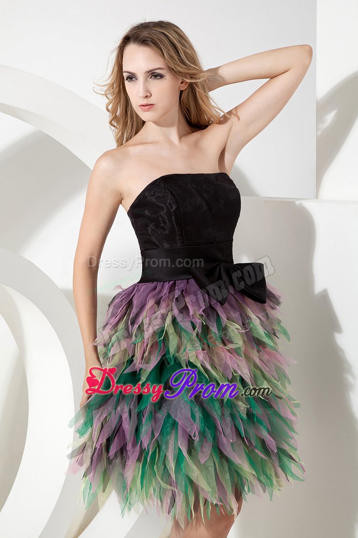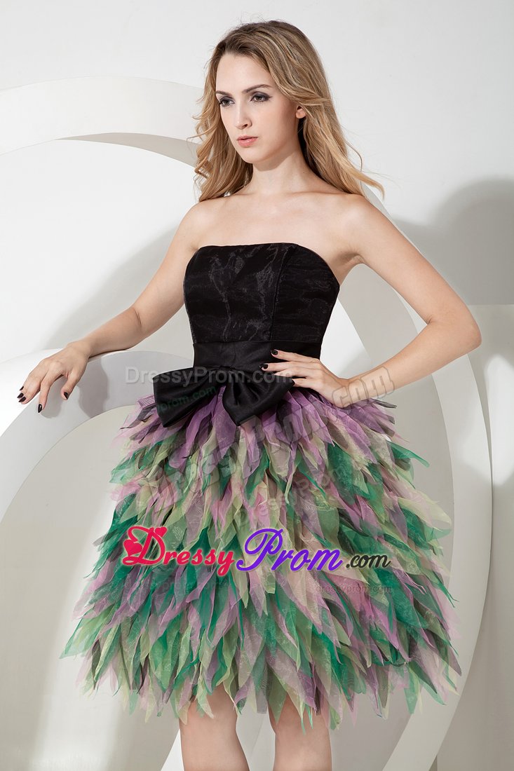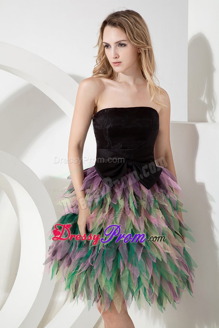 Be the belle of the ball in this fabulous colorful dress! This short dress includes design of a strapless and a fitted bodice. The simple wide sash with a cute bow in waist part will give your an ultra-sophisticated look and half open back of this dress will make you looks sexy. The dramatic skirt is adorned with layer of colorful tulles like petals wraps you. A zipper up back completes this magnificent design. Dressing this stuning dress, you will light up the night!