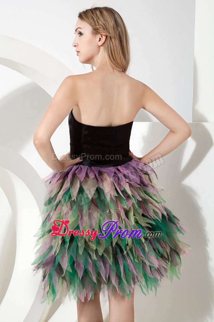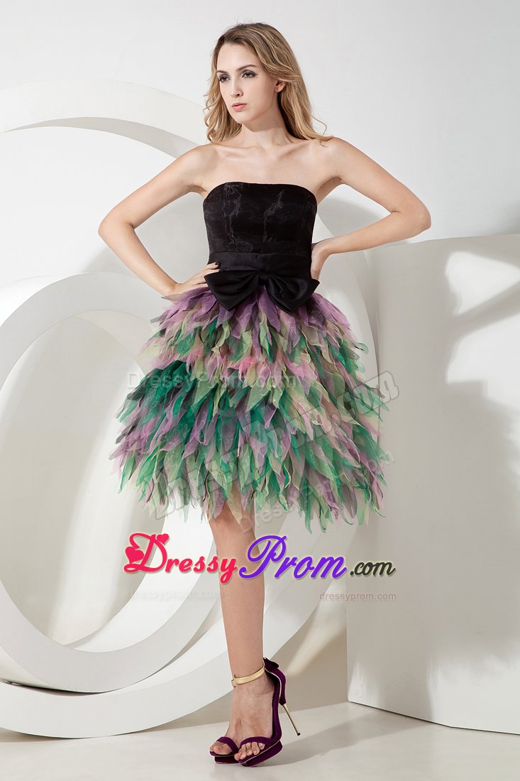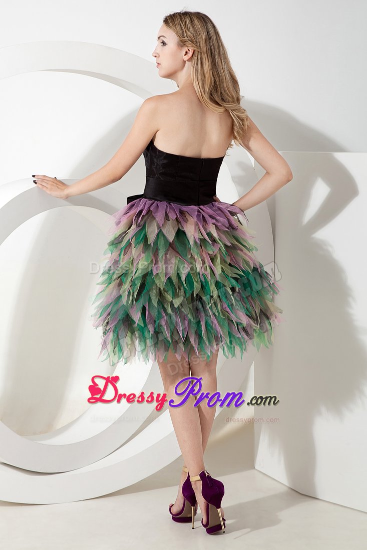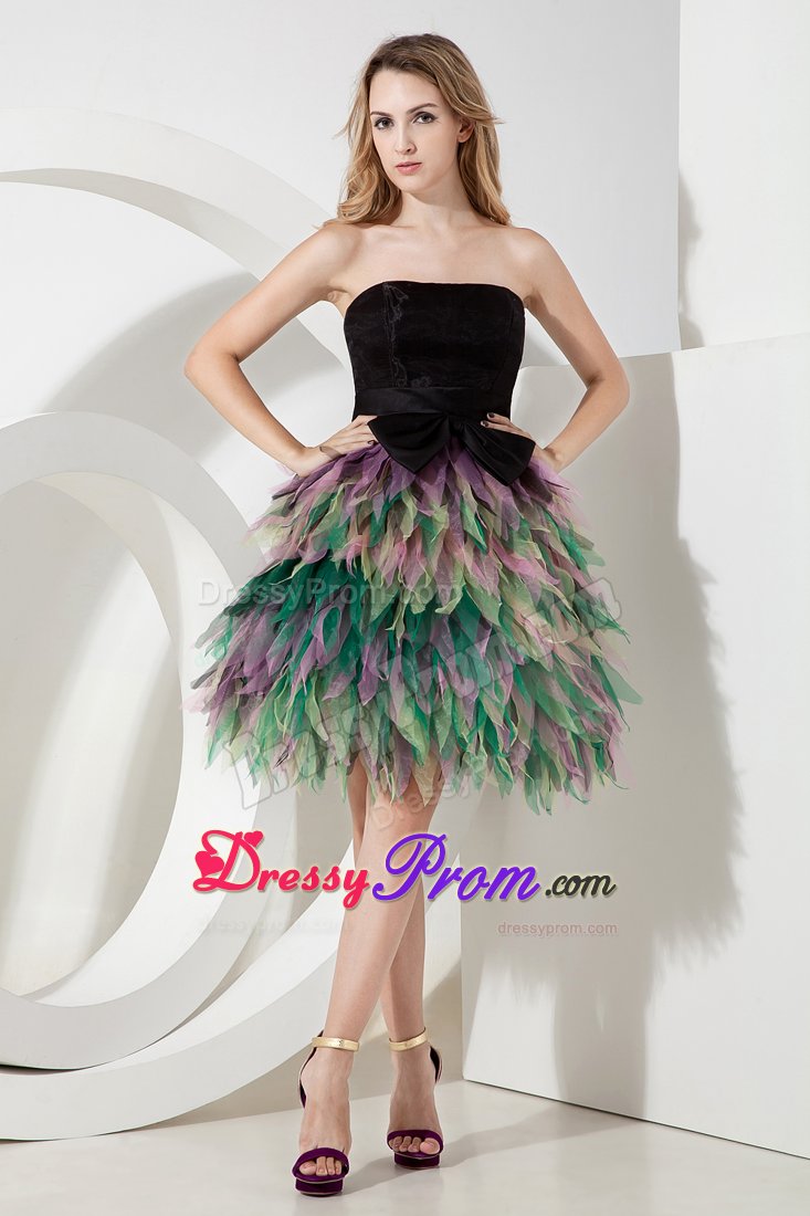 Be the belle of the ball in this fabulous colorful dress! This short dress includes design of a strapless and a fitted bodice. The simple wide sash with a cute bow in waist part will give your an ultra-sophisticated look and half open back of this dress will make you looks sexy. The dramatic skirt is adorned with layer of colorful tulles like petals wraps you. A zipper up back completes this magnificent design. Dressing this stuning dress, you will light up the night!