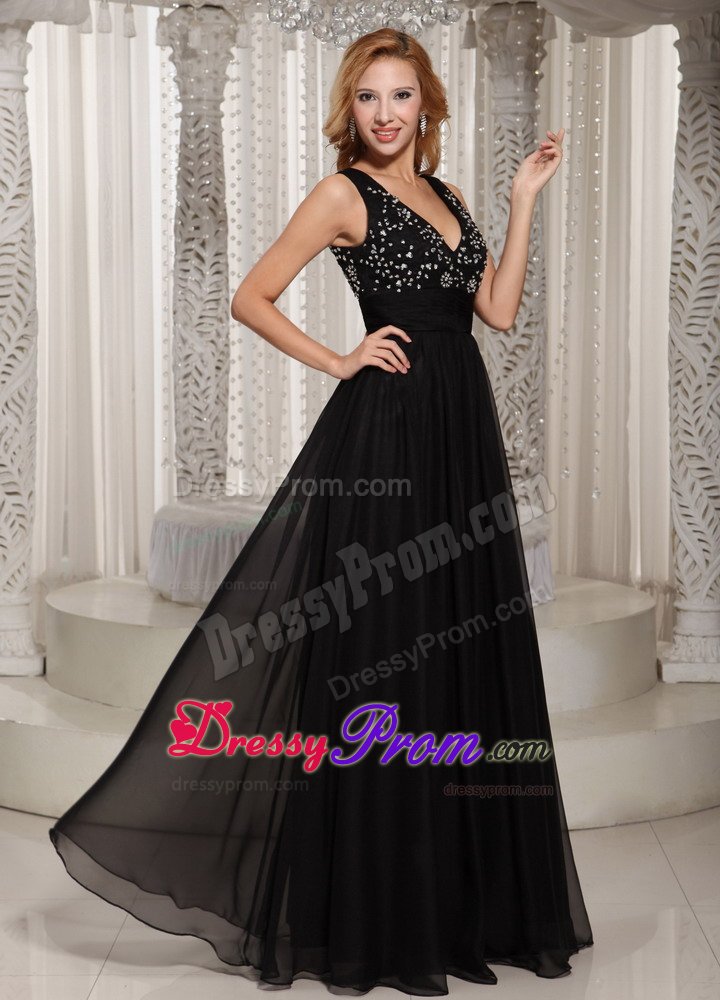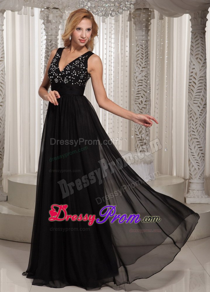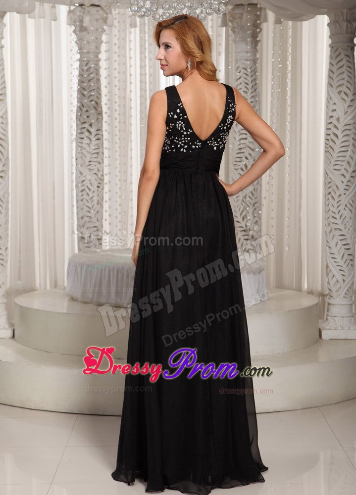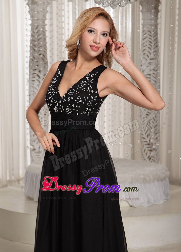 If you're looking for a chic and elegant design for your next event, look no further. This black prom dress will definitely suffice. It features two straps forming a gorgeous V neck for the front and open back on the shinning beaded bodice, which can show off your sexy and wild. The waistband accents the slim waist. The skirt is overlayed with airy chiffon fabric pooling to the floor, creating a lovely silhouette. Just a very flattering design for any body shape or style.