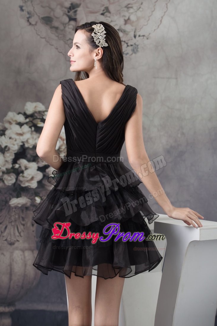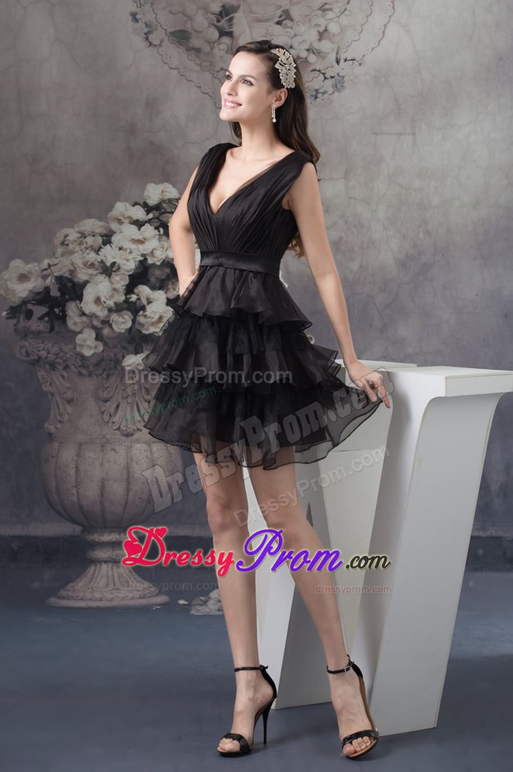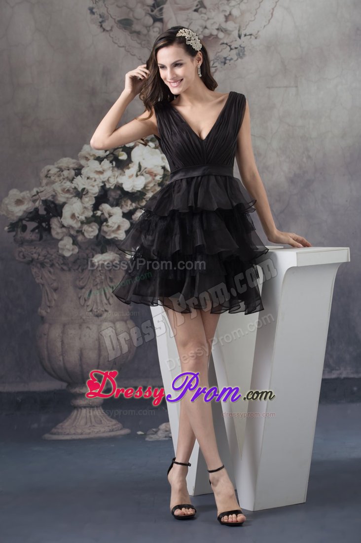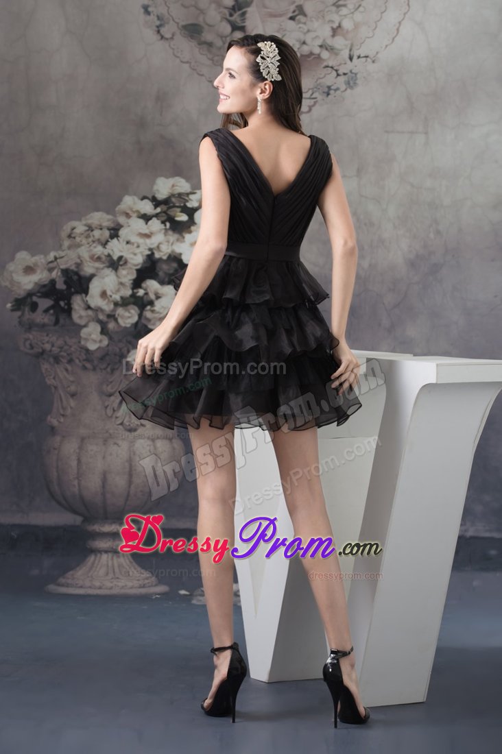 If you love showing off your soft feminine side, then this short minidress is right for you. The straps dress with a deep V-neckline is sexy and sassy. The sheath bodice gives to ruching throughtout from empire waist.The back of the dress has a plunging V shape. The ruffled layers skirt is another highlight of this dress.