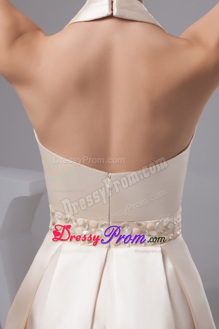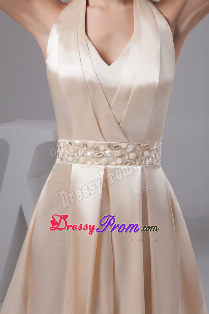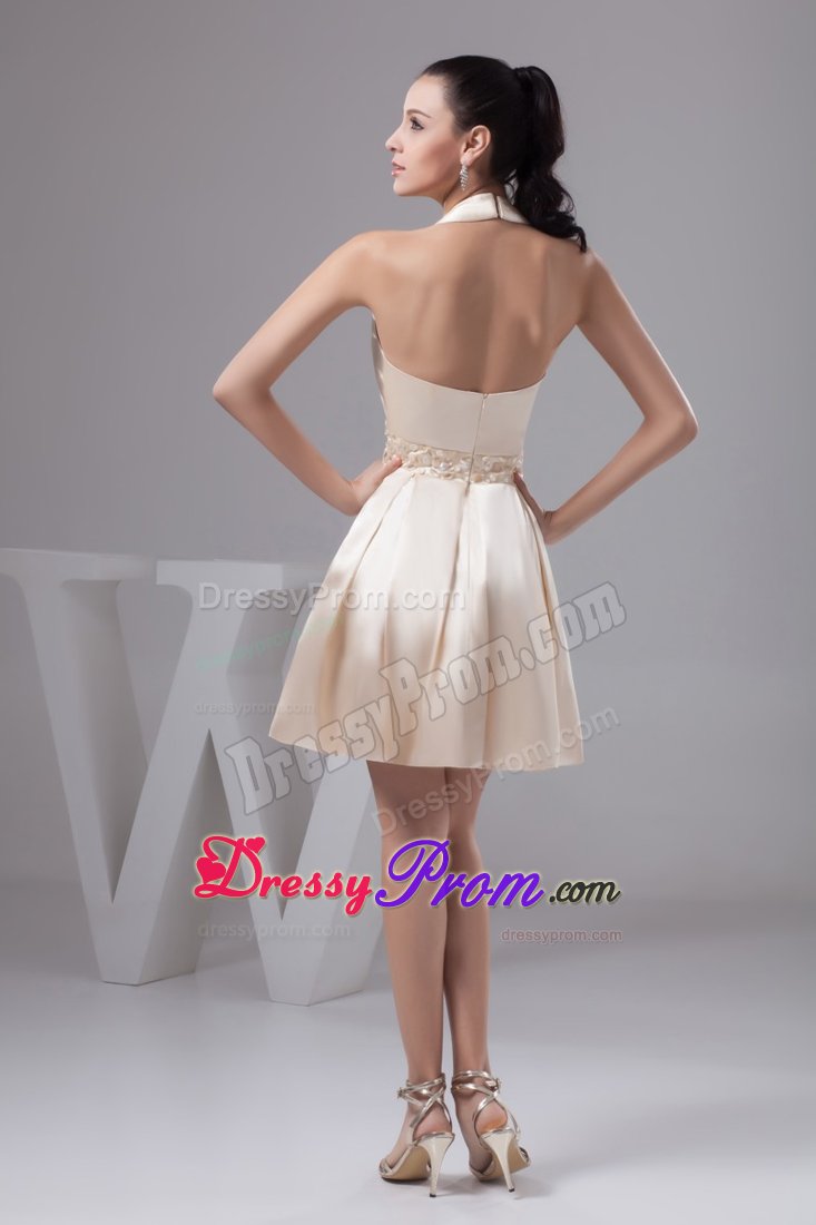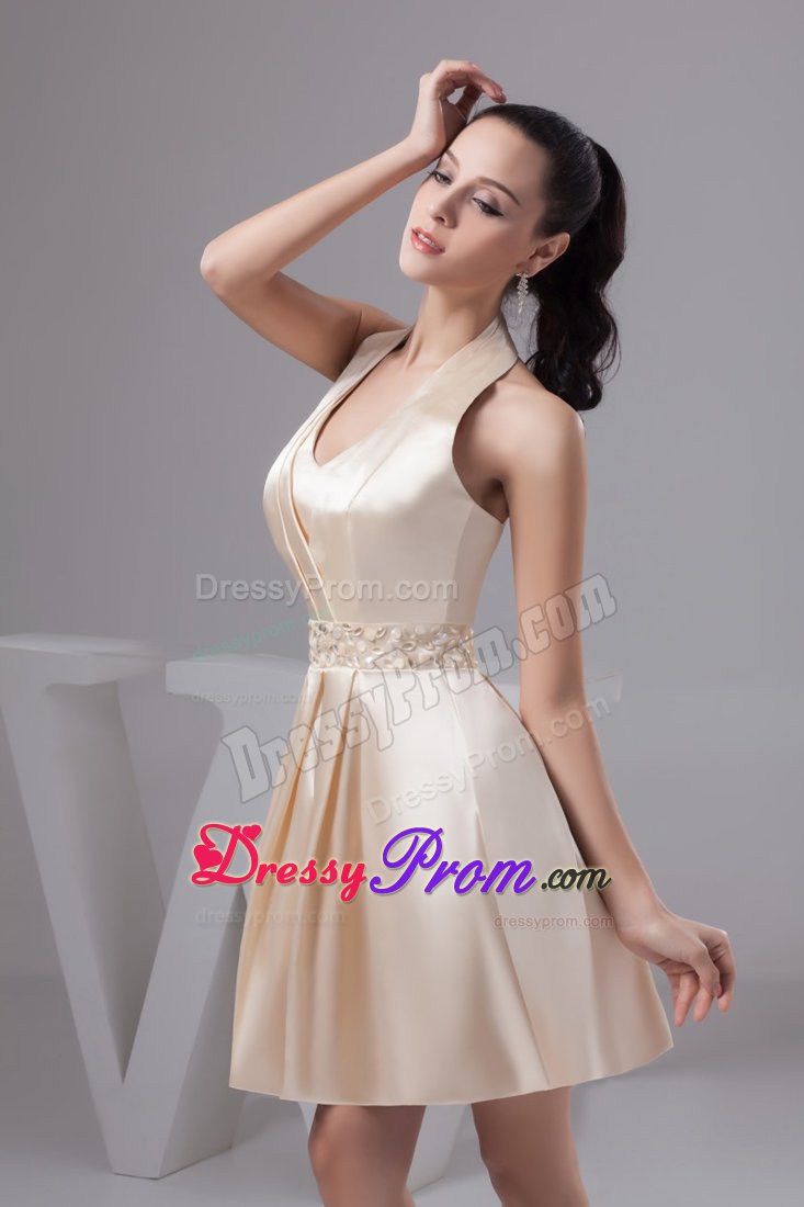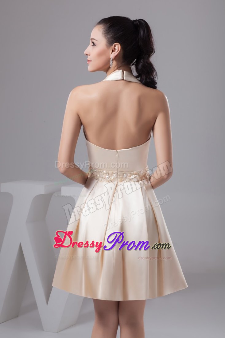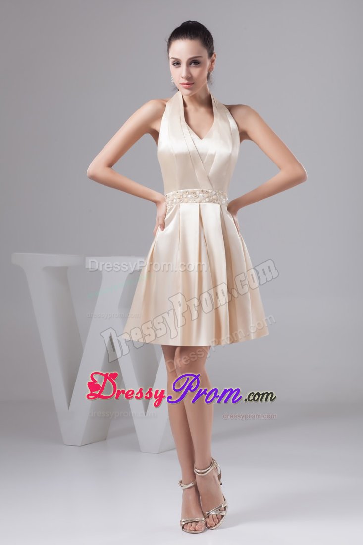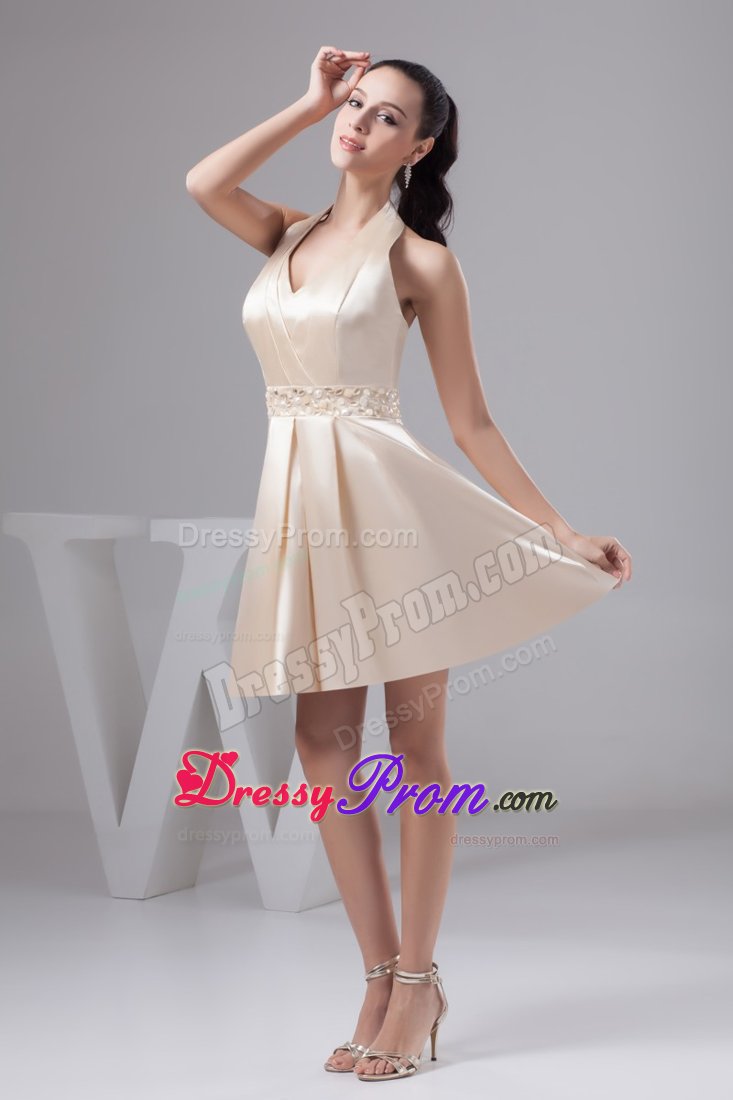 The beige prom dress features diamonds sewn around waistline. The dress hits knee and is good to wear on wedding parties. Halter neckline is sexy and fashionable. Back is perfect hidden zipper closure. Do you want to be the fashion girl, choose this one, it will makes your dream come true.