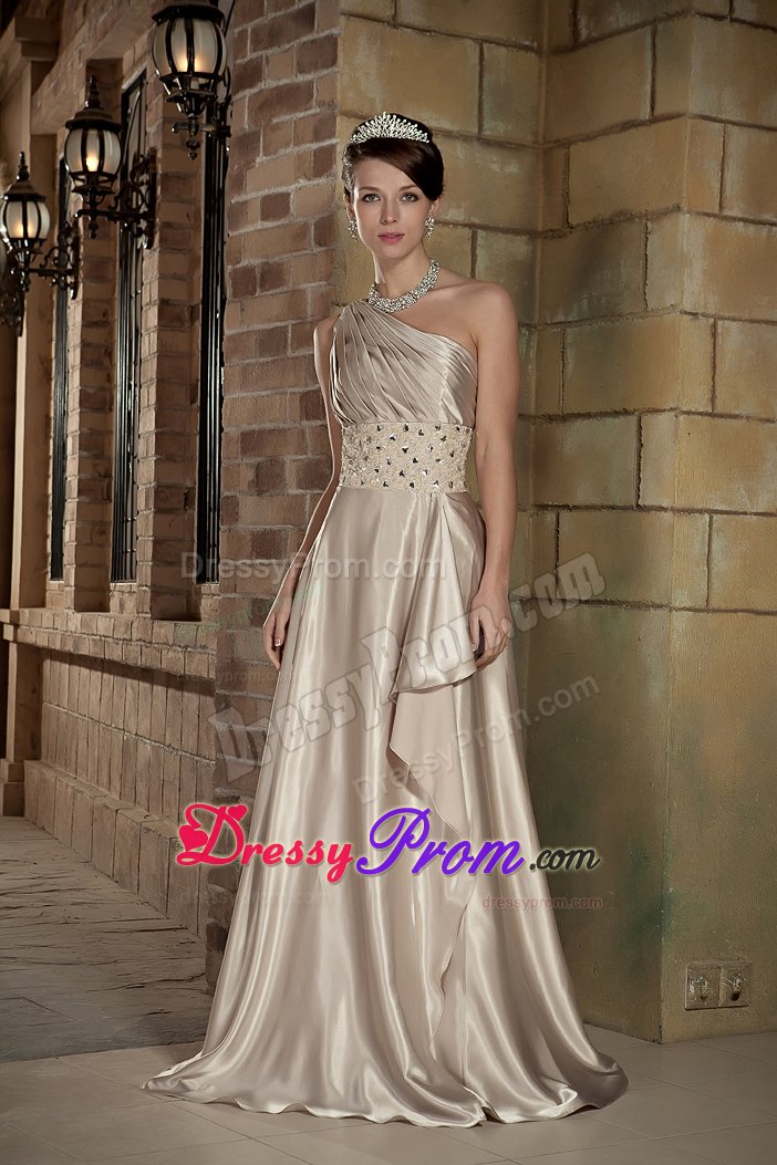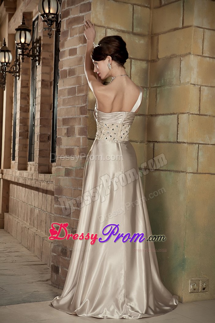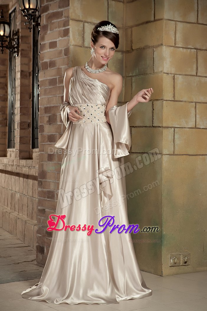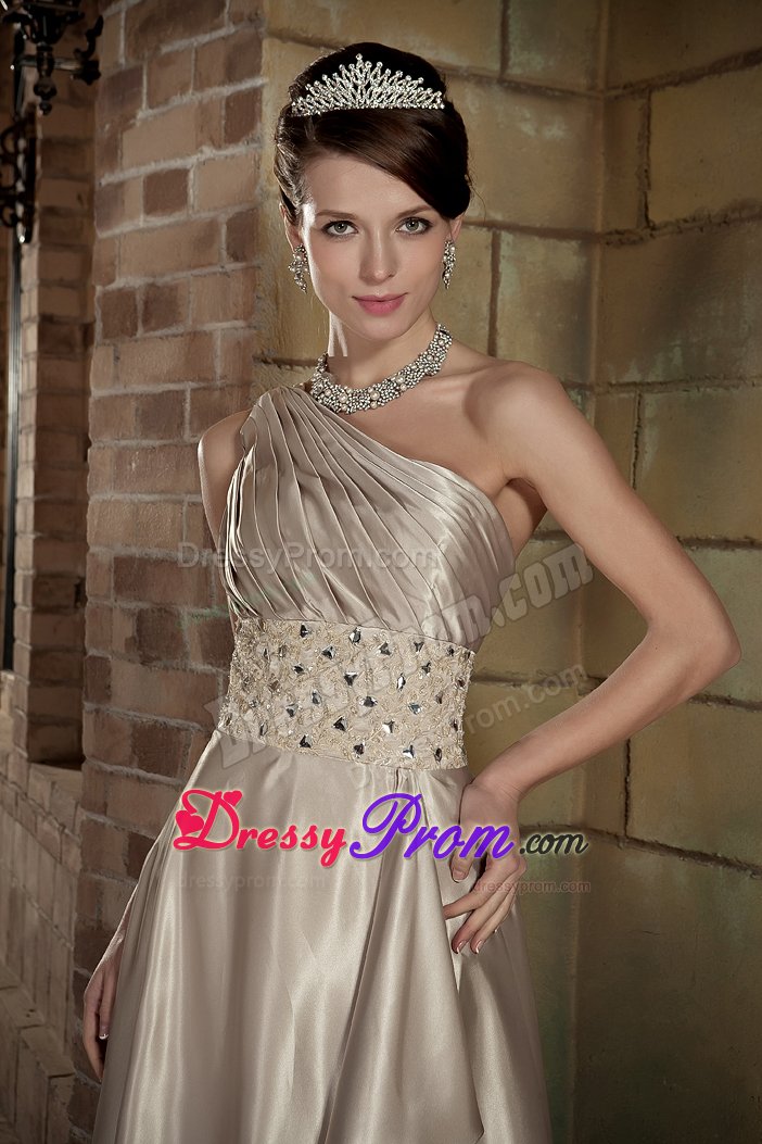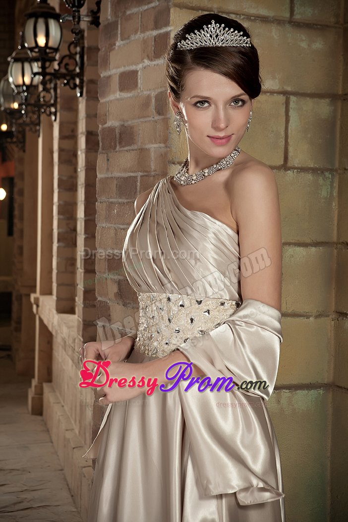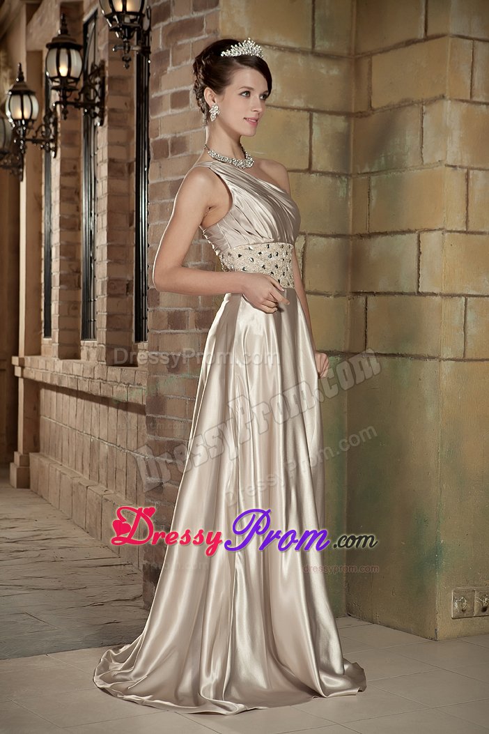 Elegent and gorgeous.It looks nice, it feels great and is always in style. One shoulder design creates asymmetrical neckline and gorgeous rhinestones accent panel in the center of the empire waist.The simple hidden zipper up back completes the look.The prom dress is highlighted with the high slit and the cute rounded train.You will be the star in the special day.