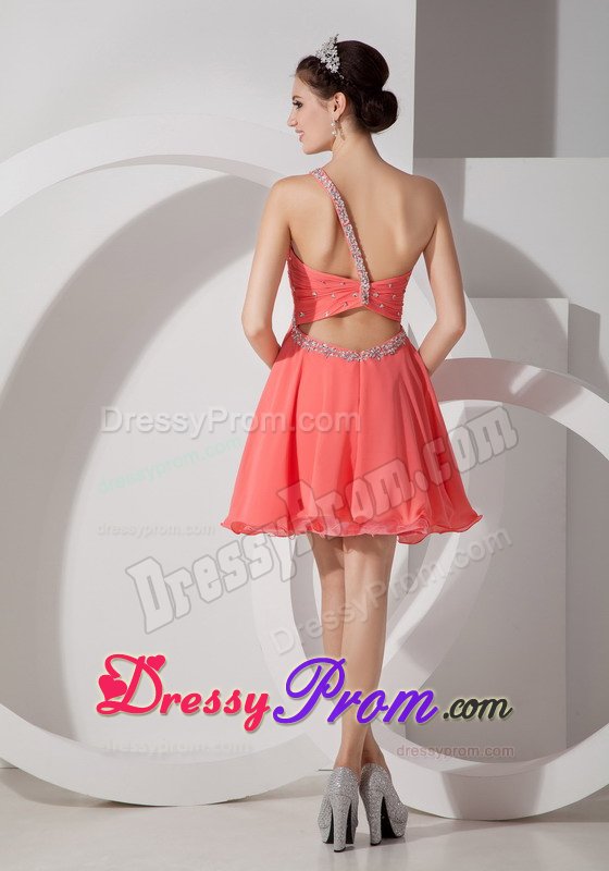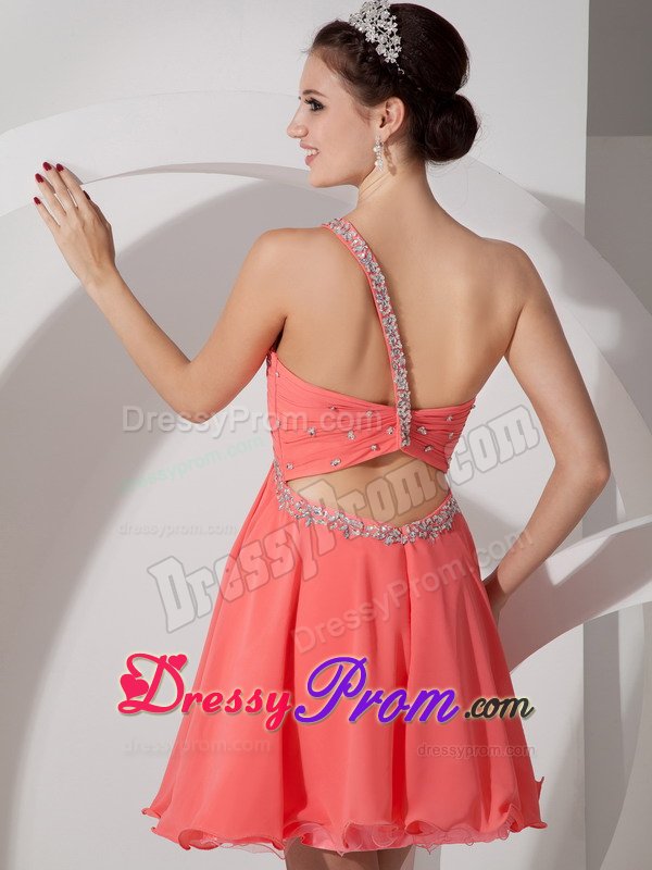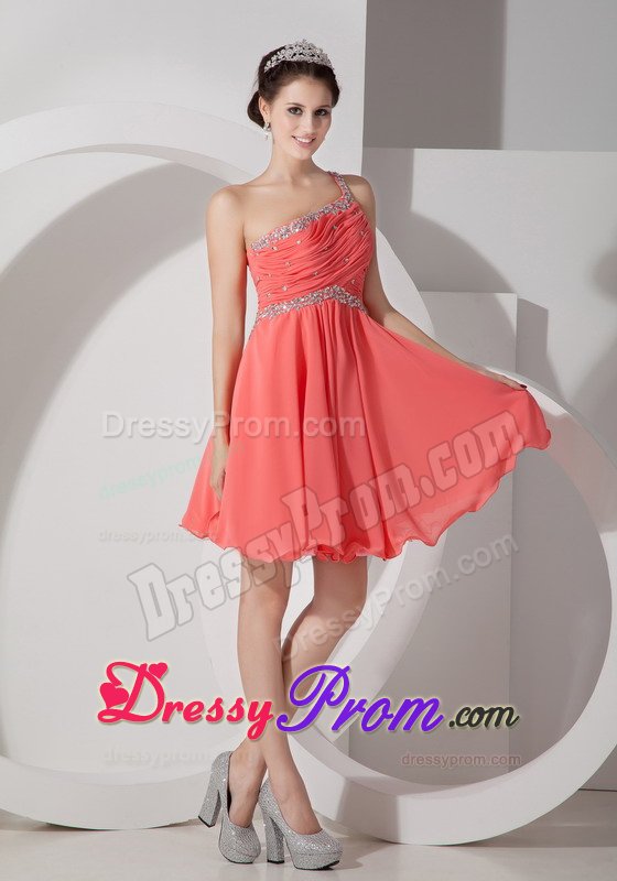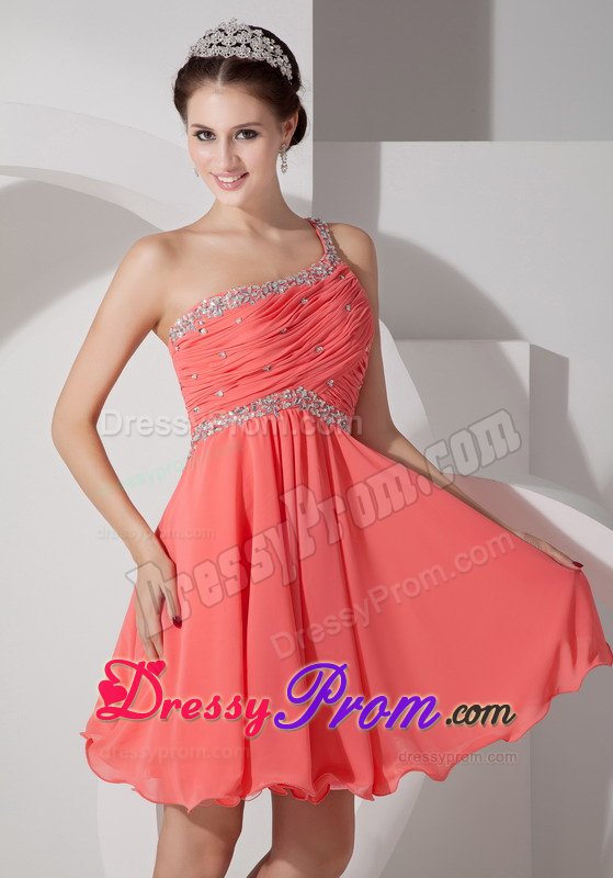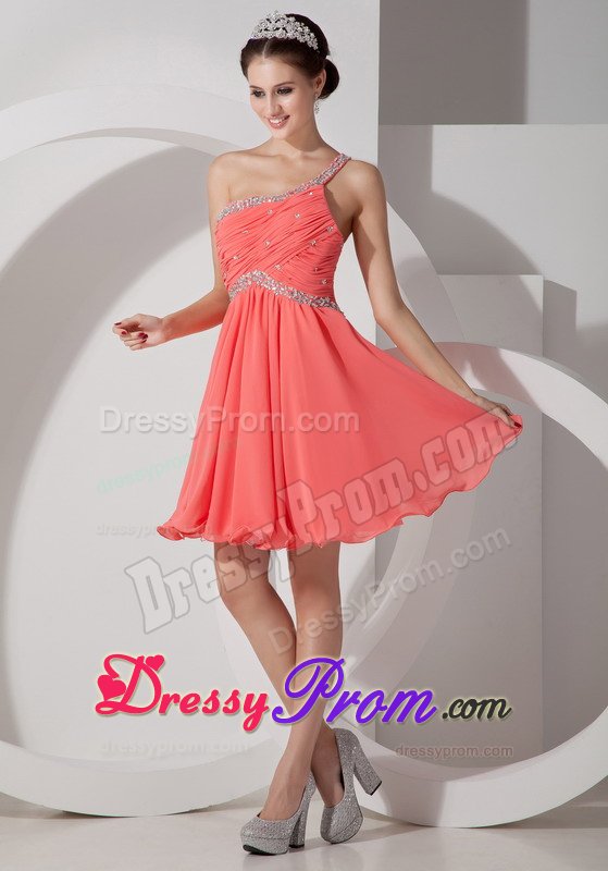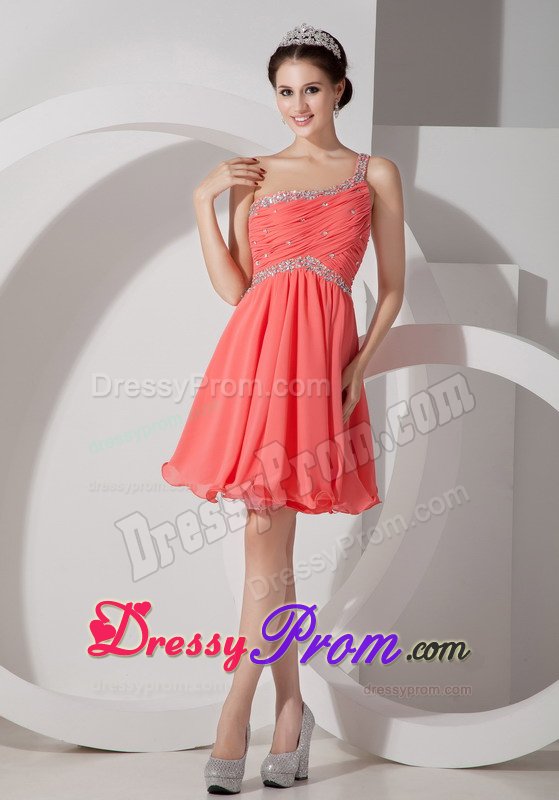 Turn heads in this glowing one-strap minidress ! The one shoulder strap is trimmed with sparkling crystals coordinating with the border of the strapless neckline and the V-shape waistline. What's more, the well-regulated beadings on the ruched midsection plays an import part in boasting the mini dress.The short skirt of breezy style adds a touch of panache. Look on the back, you will find your wild side to show off!