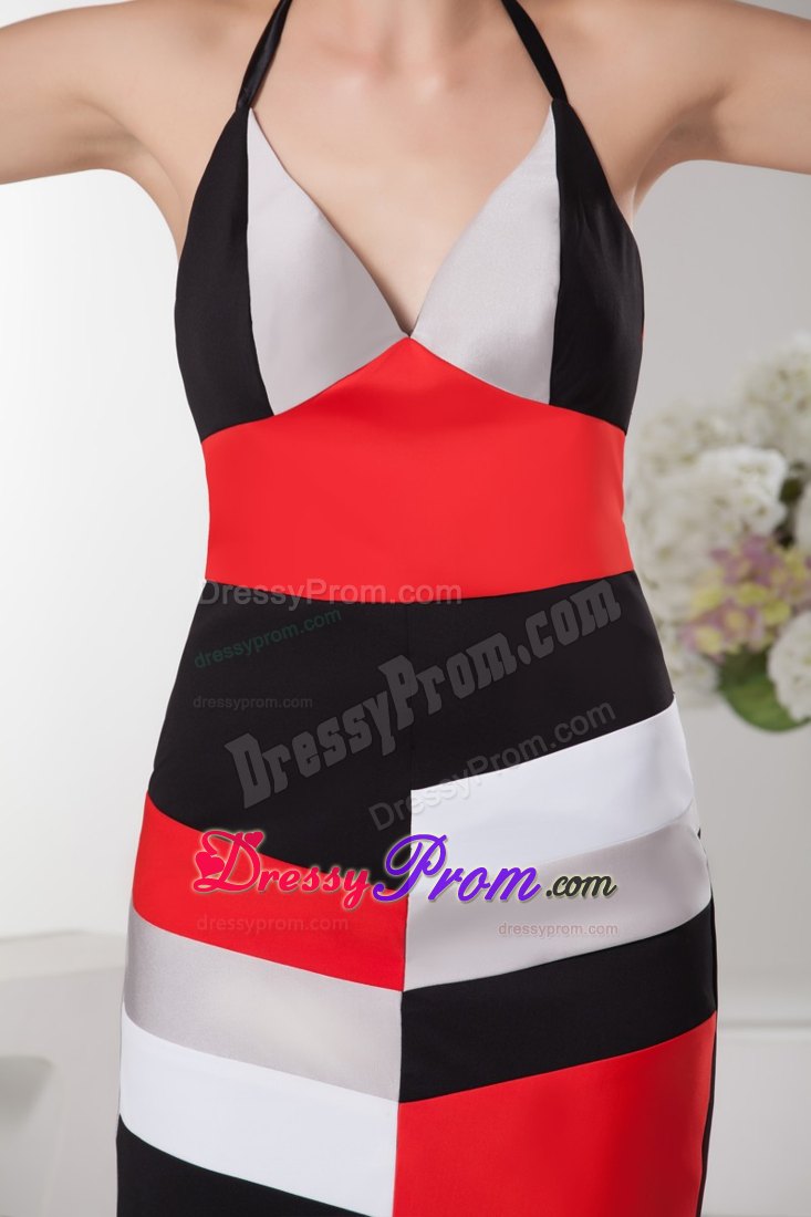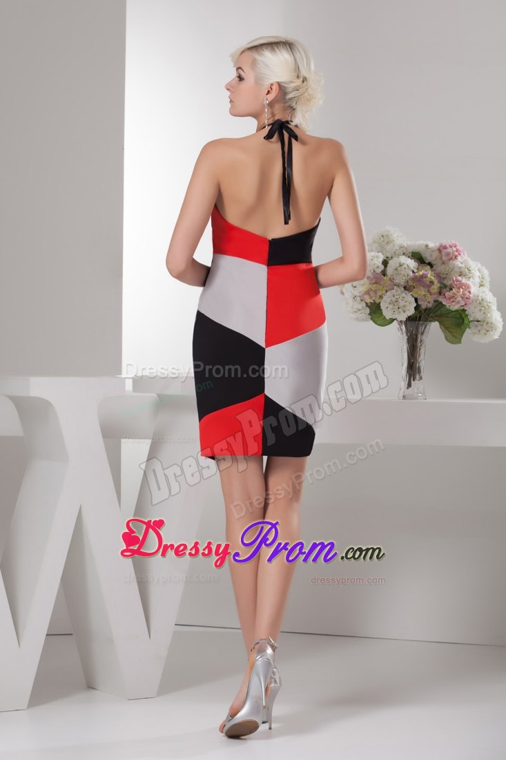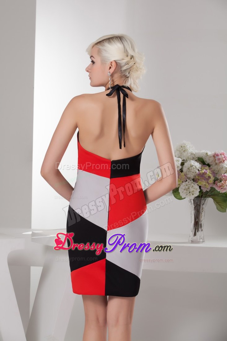 The stylish short dress has a halter top neckline and a sheath shape. It is made of satin strips in rainbow color. The dress hits thigh yet looks elegant. Back is perfect hidden zipper closure. A unique and popular style.